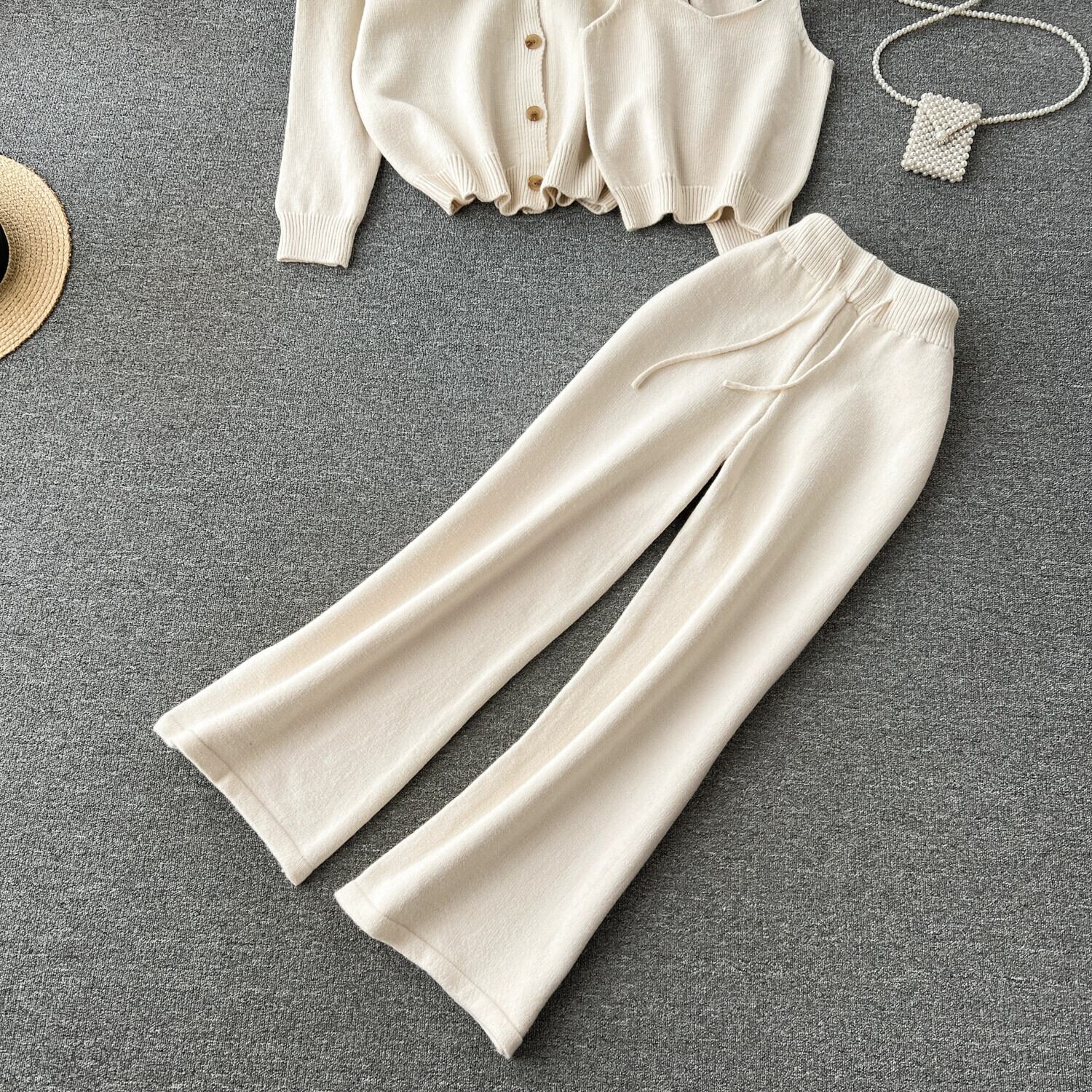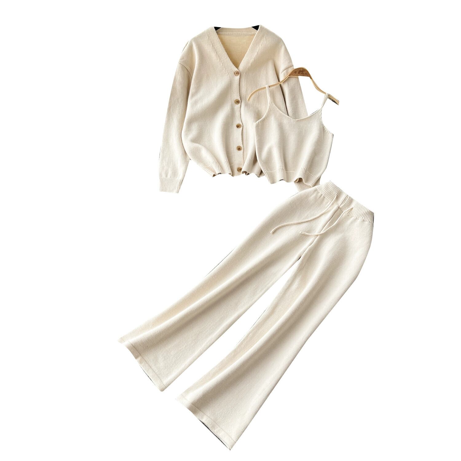 レイジースタイルカジュアルルーズニットカーディガンセータージャケット+キャミソール+ウエストゴムパンツおしゃれな3点セット エラスティック 伸縮 lyxaj18404193664