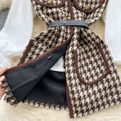 フレンチレトロスタイルのウエストベルトとスタイリッシュなチェック柄ベスト+カジュアルで万能なルーズ長袖シャツスーツ ロング ハーネス lyxaj85370786069