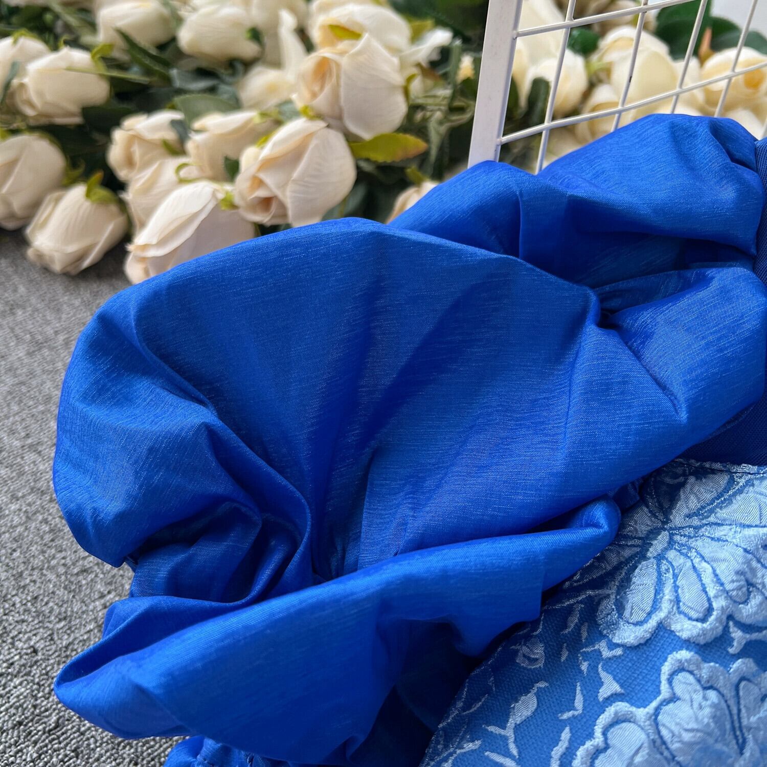 フレンチハイCLレディスタイルラウンドネックプリーツパフスリーブエンボスドレス女性のウエスト痩身エレガントドレススカート Oネック lyxaj37166451170
