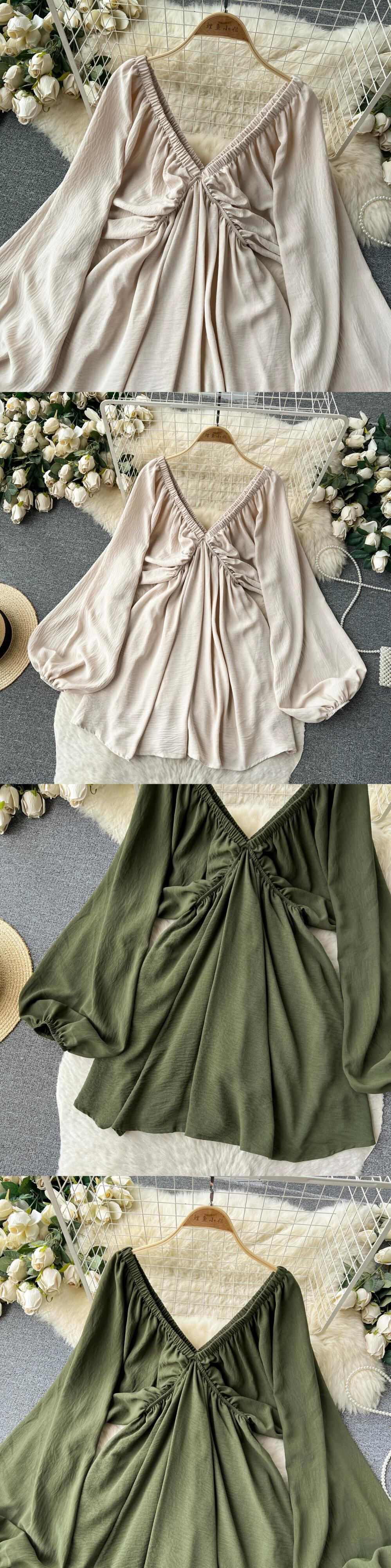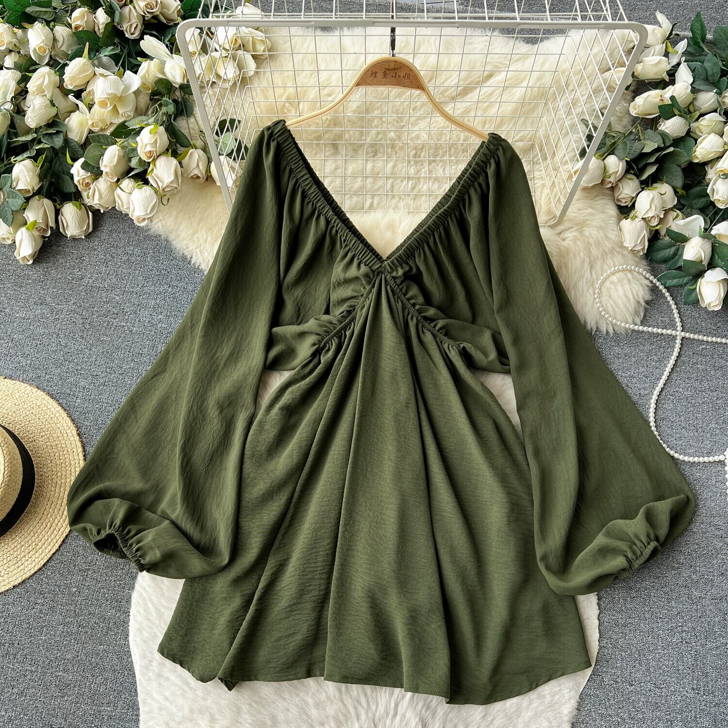 セクシーなディープ V ネックランタン長袖ドレス女性ヨーロッパとアメリカンスタイルカジュアルルーズファッションシックなベビードールドレス休暇ドレス ロング Vネック ヨーロピアン lyxaj72586573535