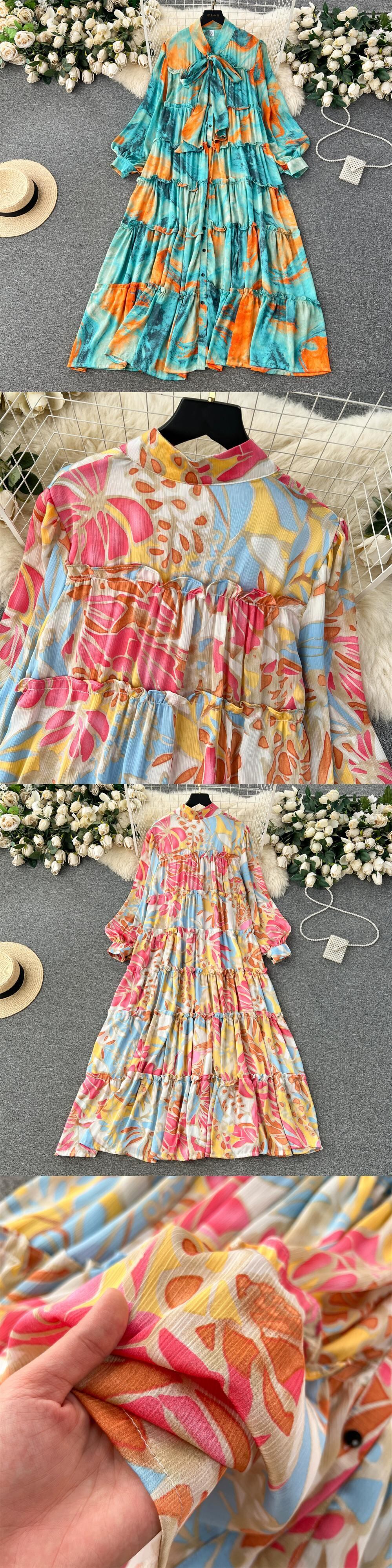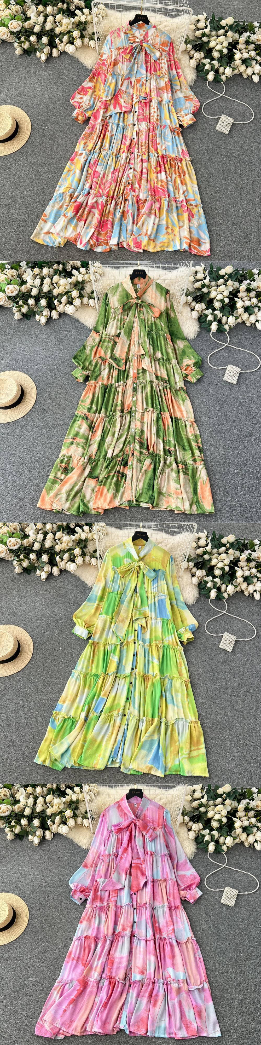 フレンチライトラグジュアリースタイル長袖蝶ネクタイプリントドレスレディースカジュアルルーズ痩身Aラインロングスカート リボン lyxaj4336165536