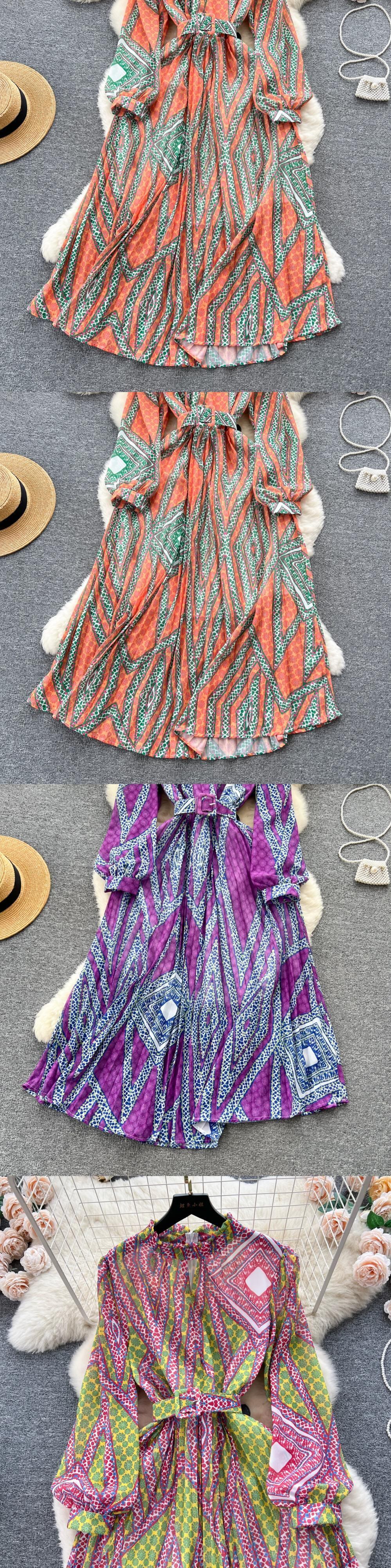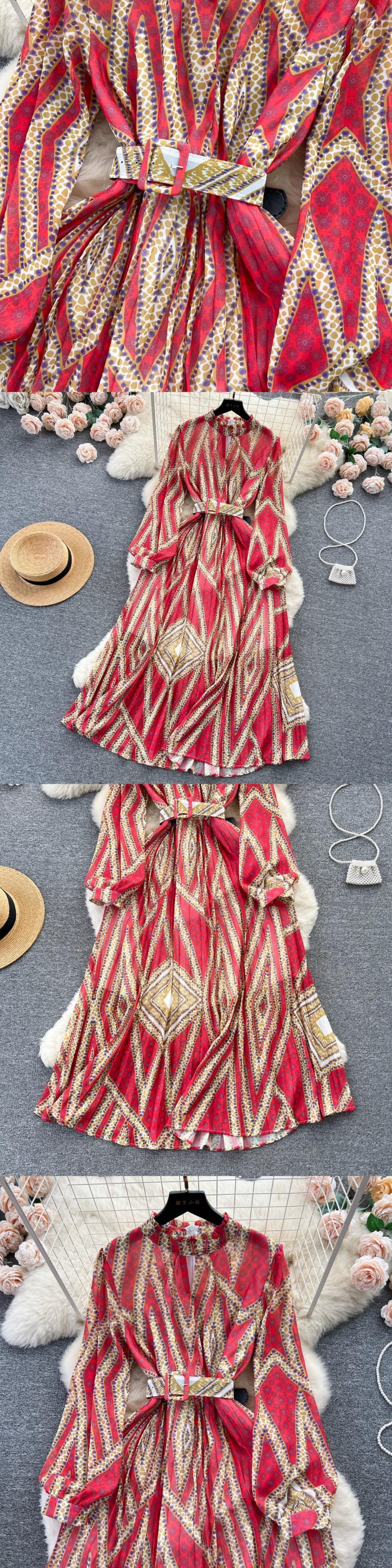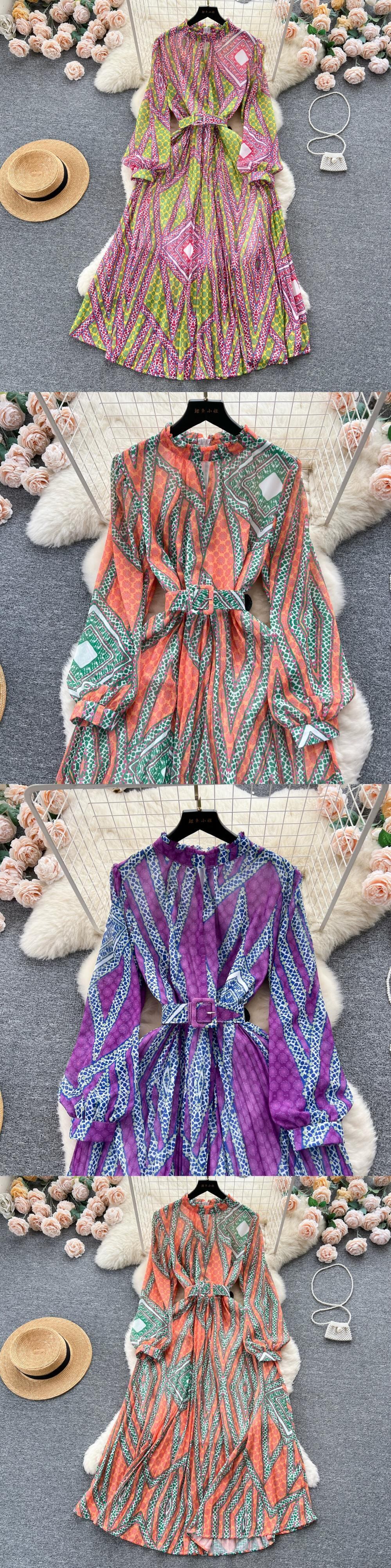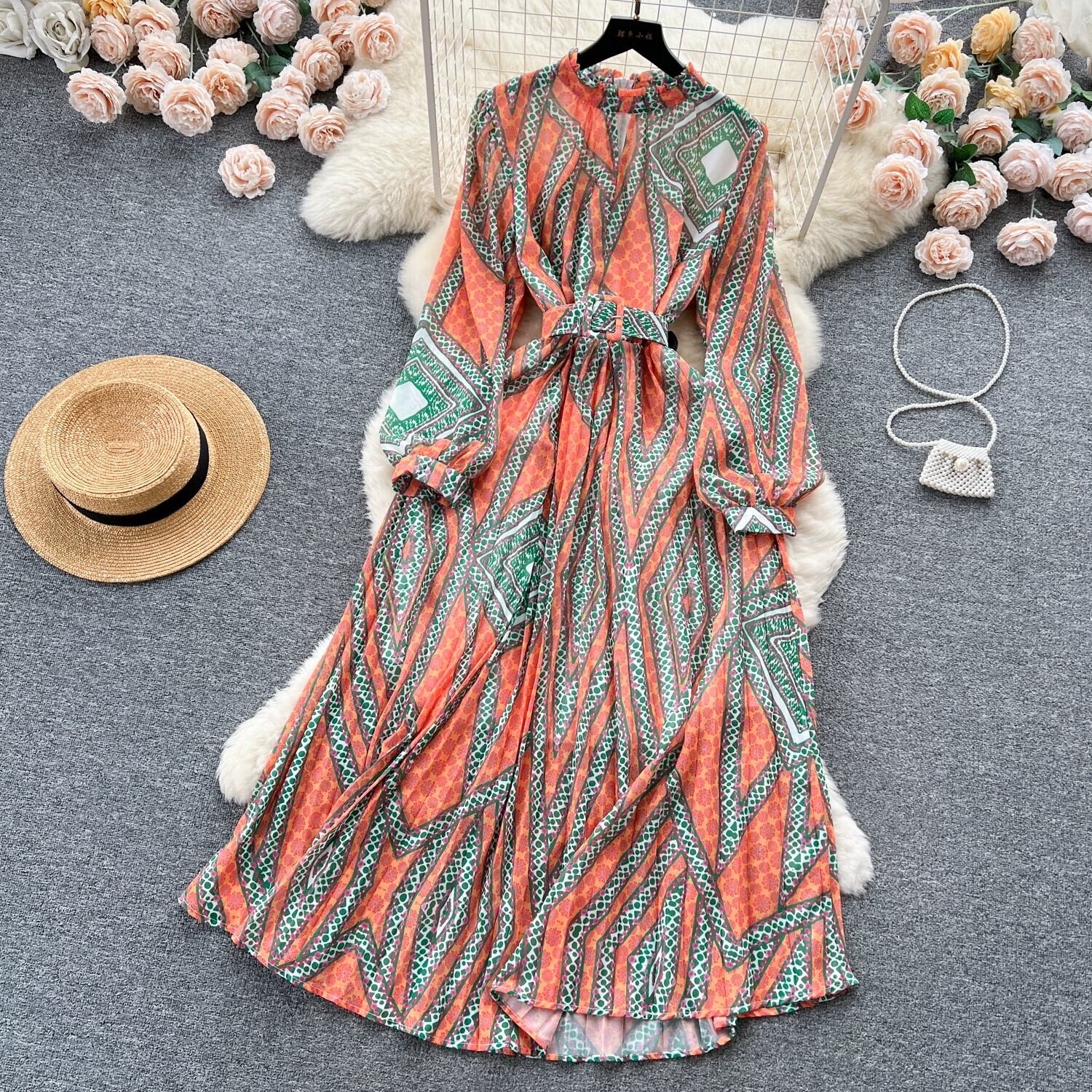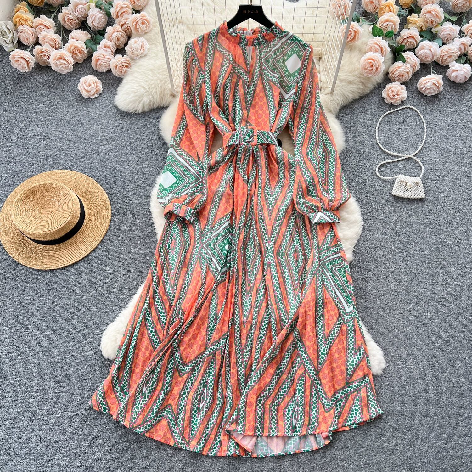 フレンチライトの大人スタイルのハイエンドラウンドネックプリント長袖ドレス女性、ゆったりとしたウエストとスリムな大きな裾のシフォンロングスカート Oネック lyxaj28159858557