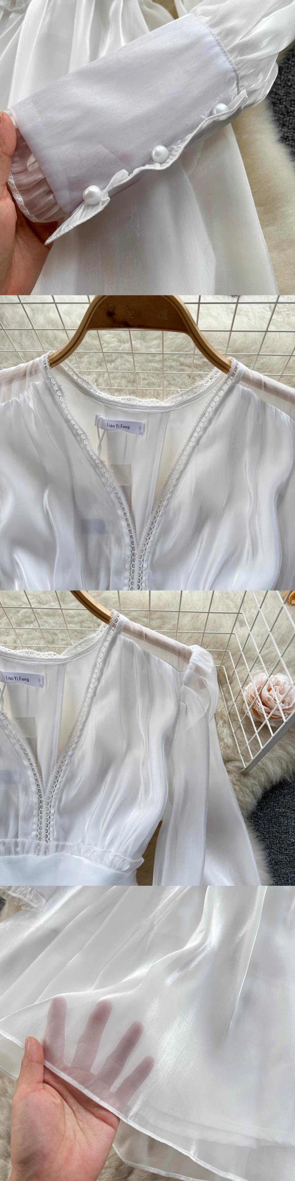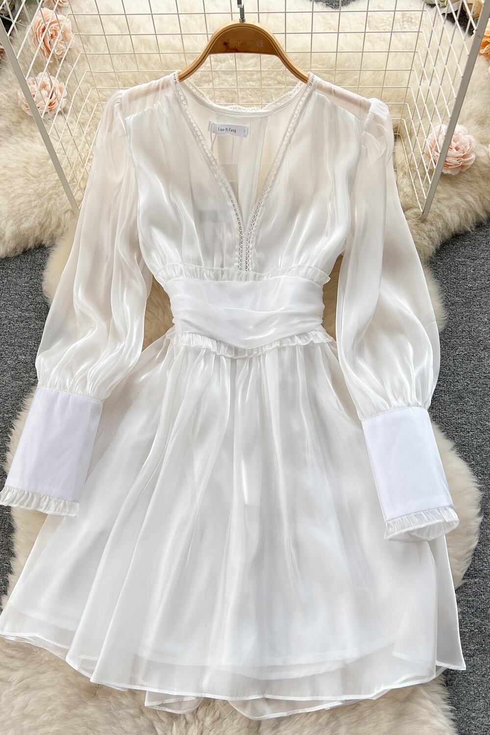 夏の新スタイルフレンチセクシーなシースルーウエスト長袖ドレス女性白ミッドレングスメッシュ初恋プリンセスドレス ロング ホワイト サマー 夏物 lyxaj10086510274