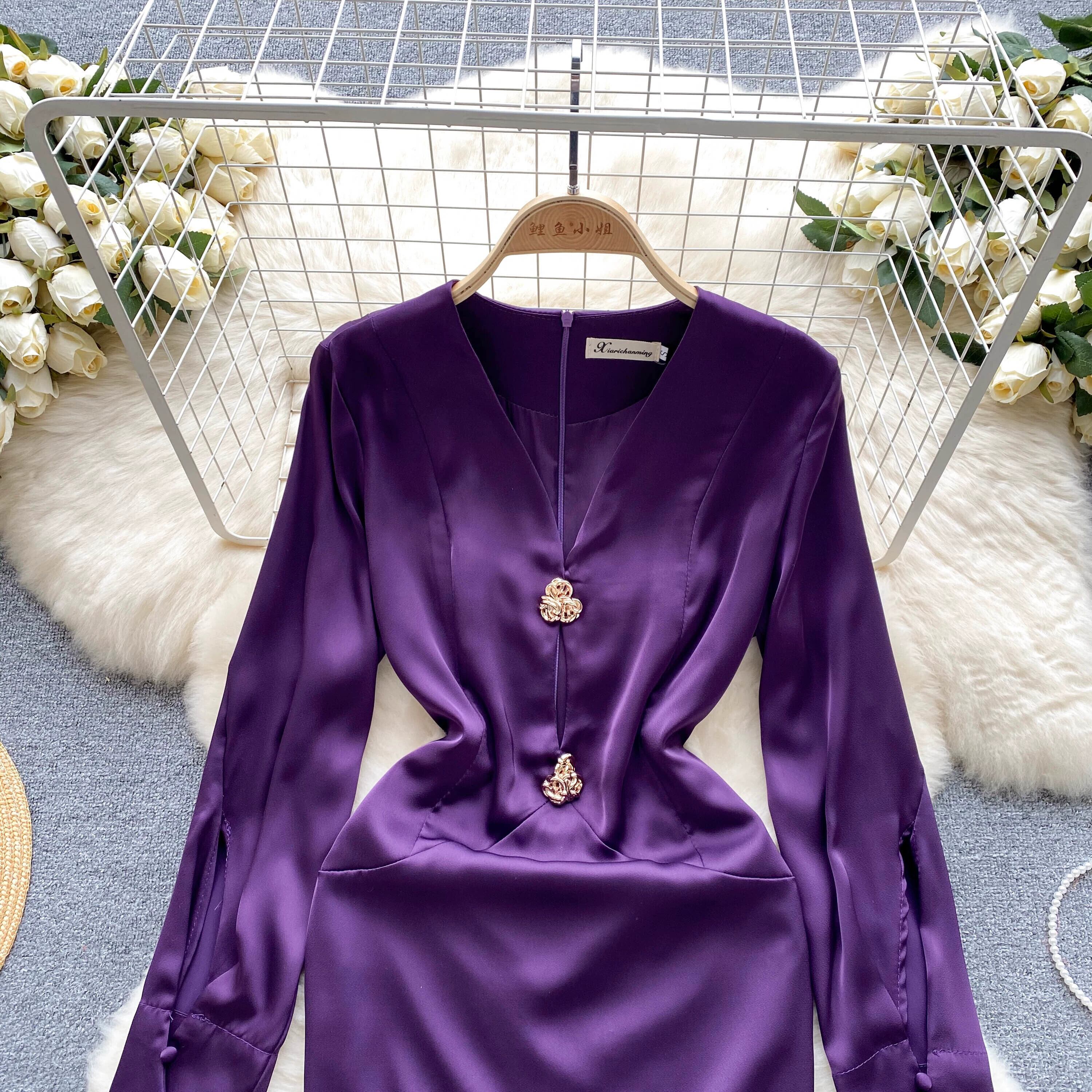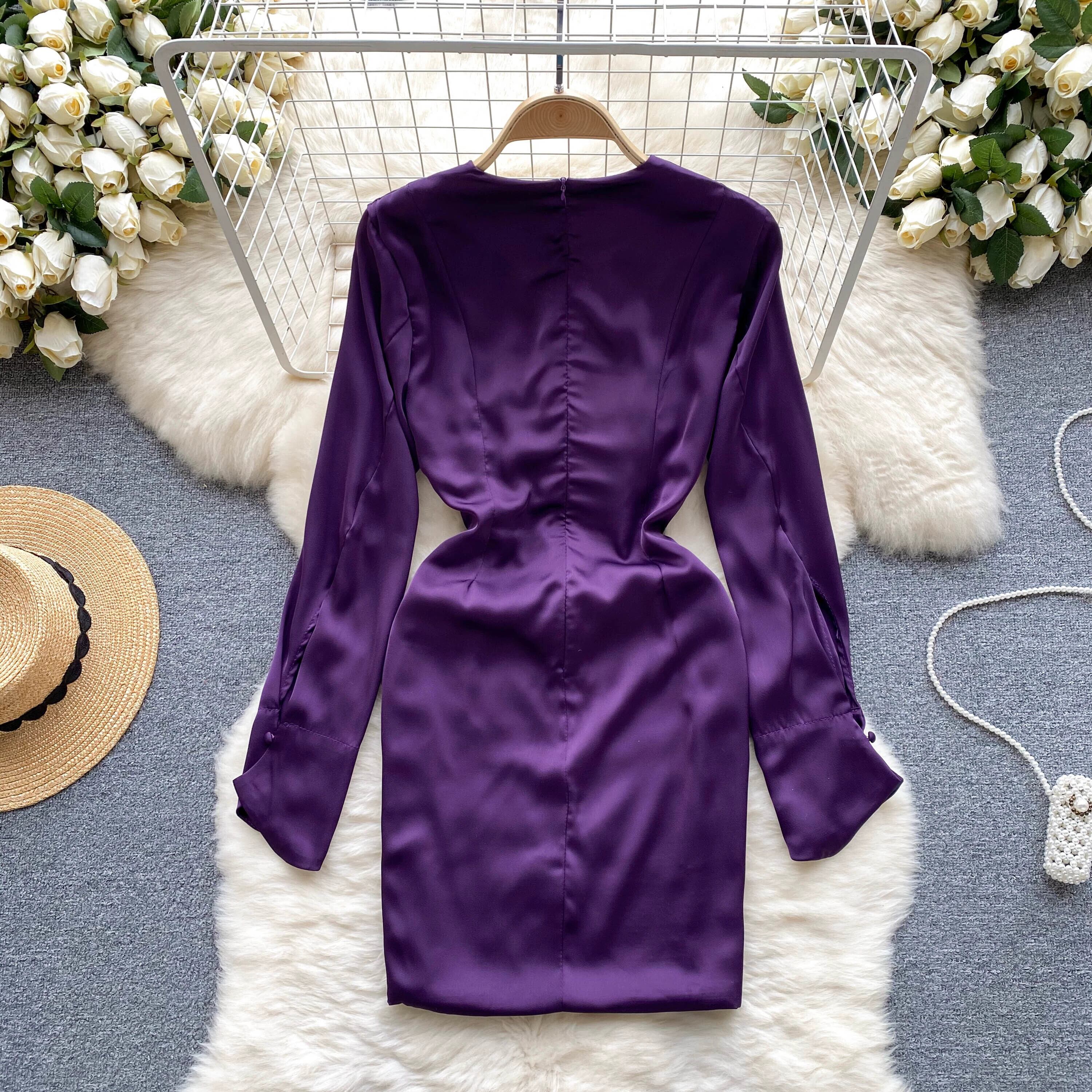 フランスのハイエンドのシックな中空セクシーな V ネック長袖サテン ドレス女性、腰にぴったりフィットするデザインとヒップにぴったりフィットするショート スカート ロング Vネック lyxaj73924303034