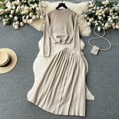 ライトラグジュアリーでハイエンドの怠惰なスタイルのニットファッションスーツ女性の秋と冬のラウンドネックTシャツ+ハイウエストハーフレングスプリーツスカート ハイウェスト オータム 秋物 ウィンター 冬物 Oネック lyxaj48143486910