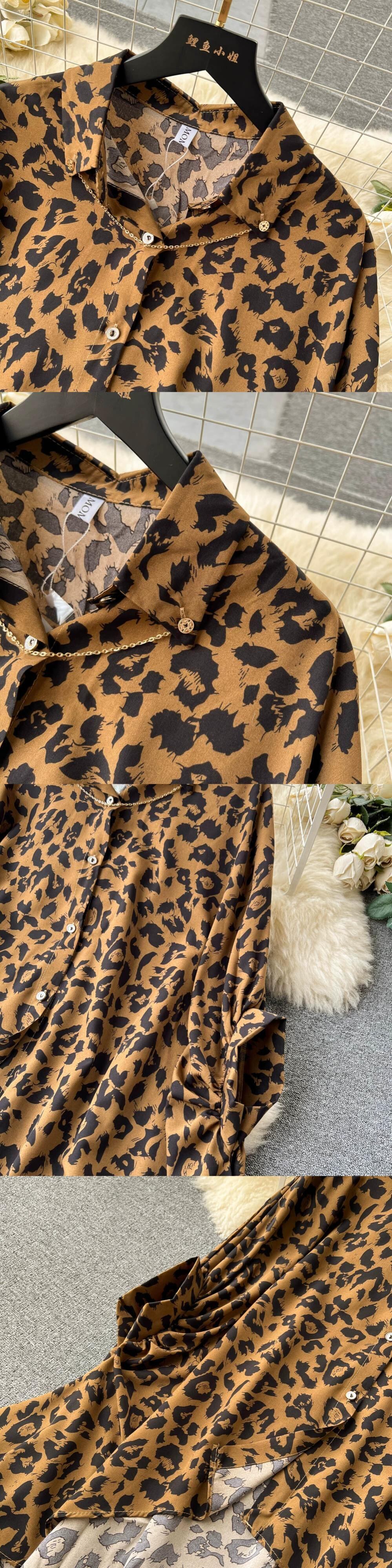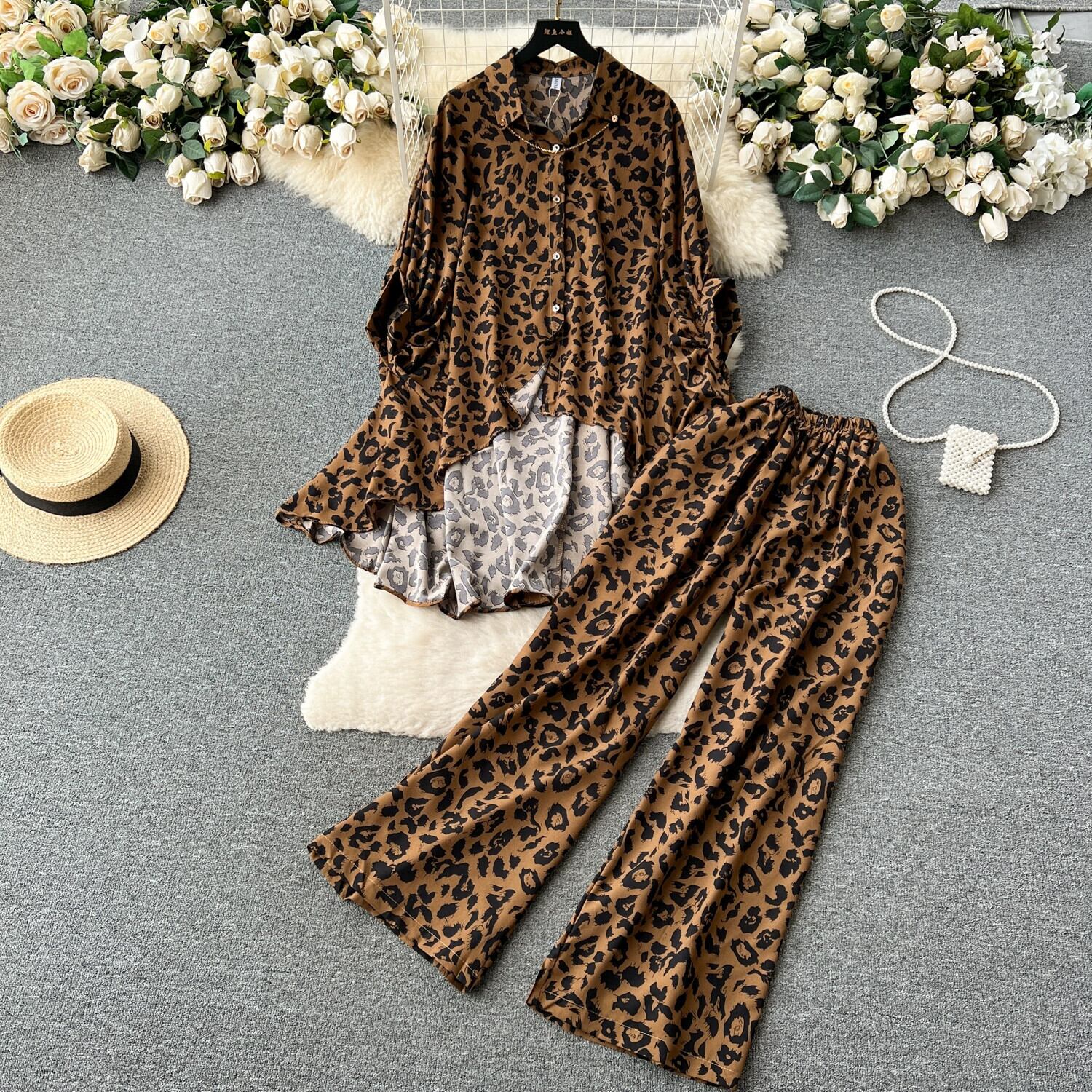 レトロ怠惰でおしゃれなヒョウ柄スーツレディース変則長袖シャツハイウエスト痩身ワイドパンツ2点セット ロング lyxaj19141343626