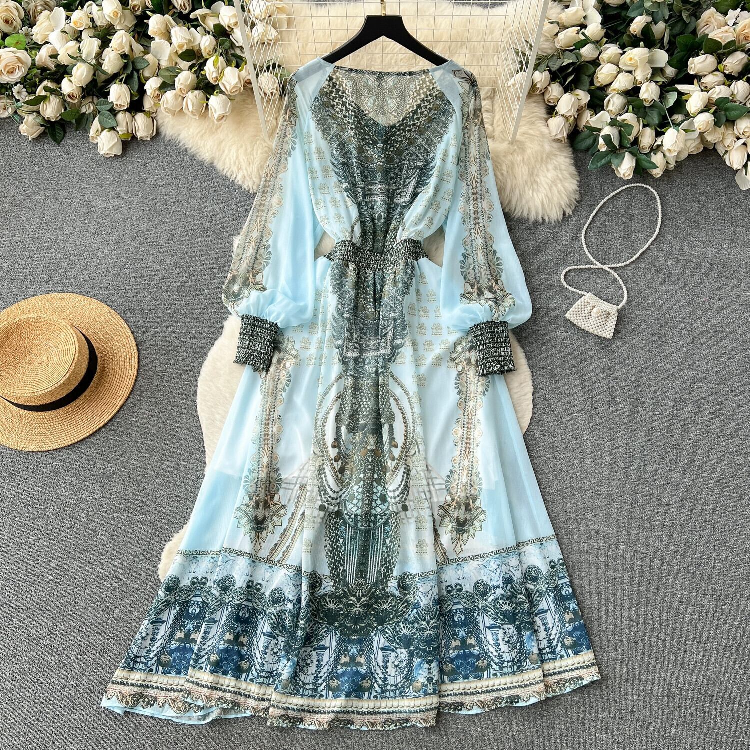 夏薄いフレンチレトロファッションハイエンドランタン長袖プリントドレス女性のウエストを締める気質大きなスイングスカート ロング サマー 夏物 lyxaj49692155691