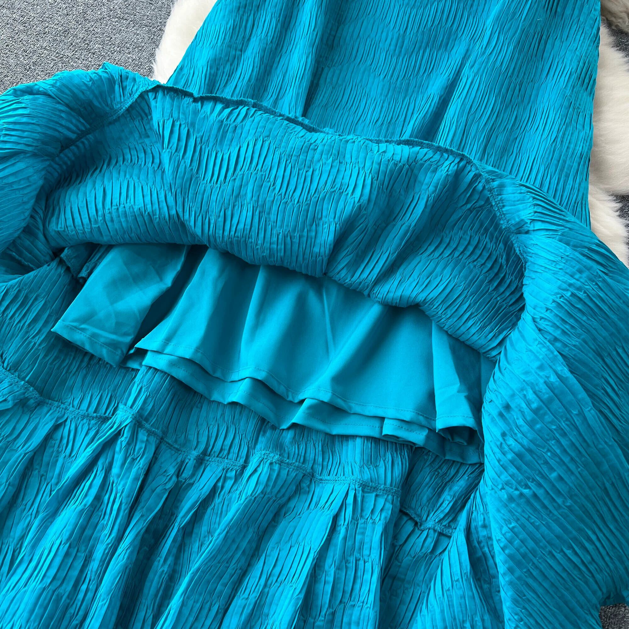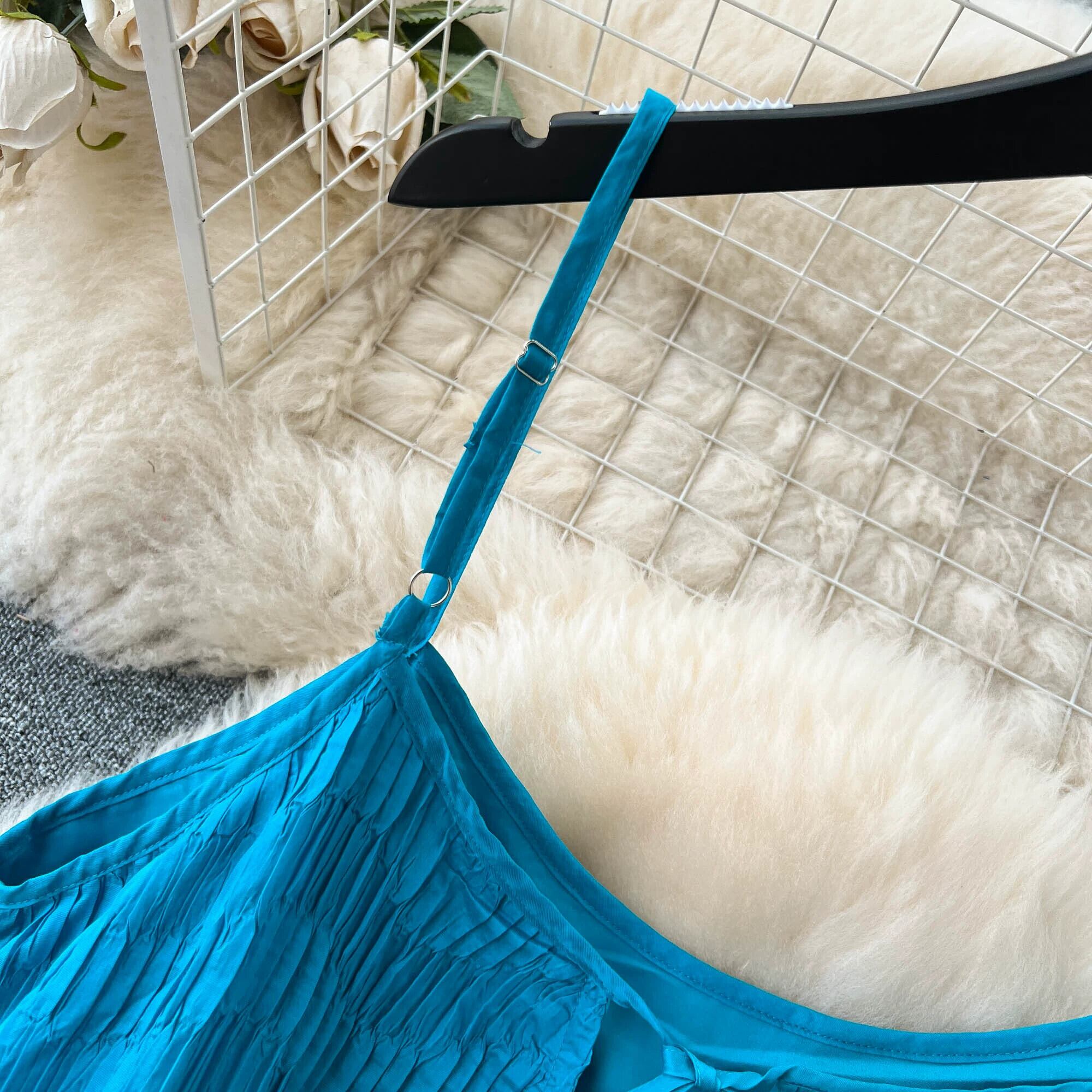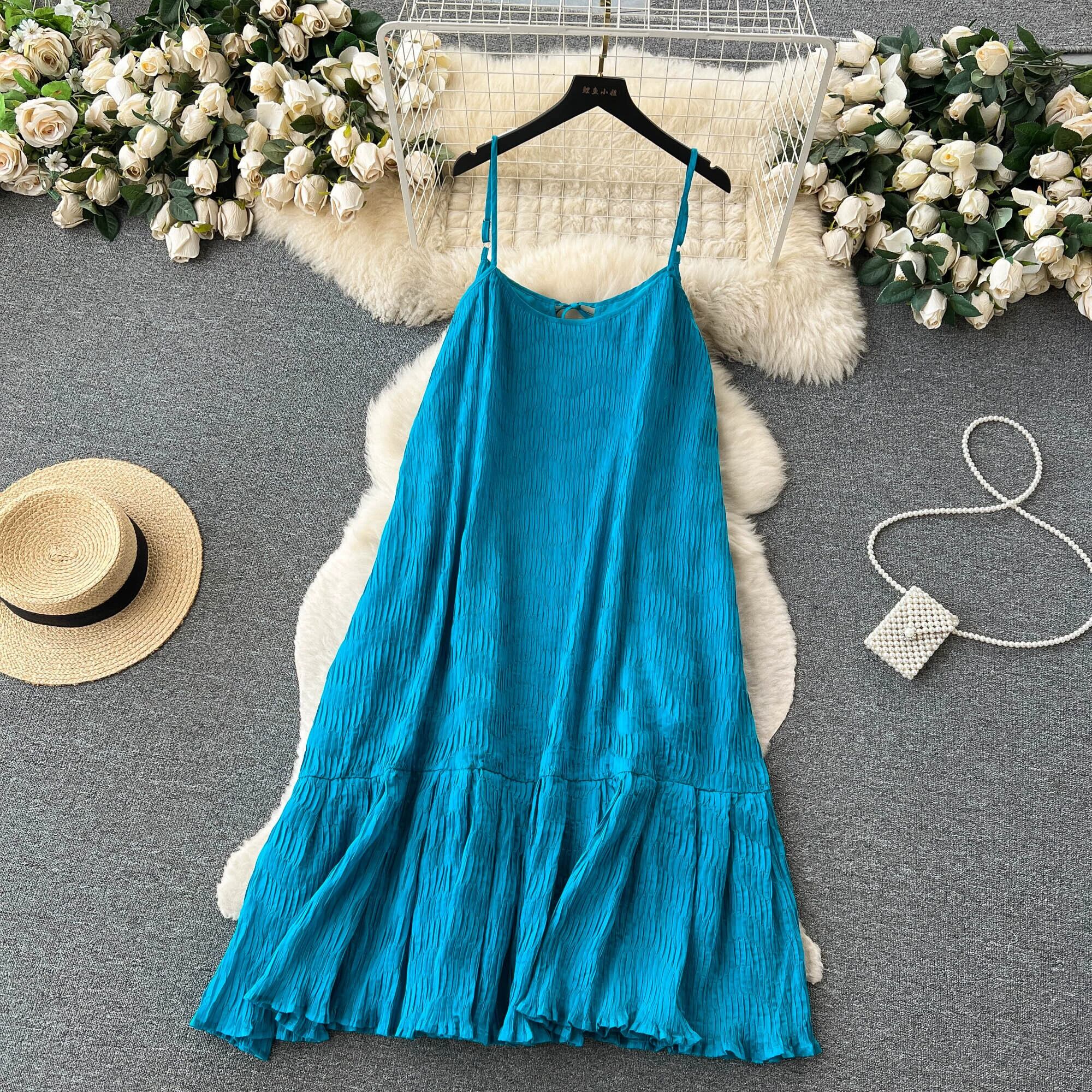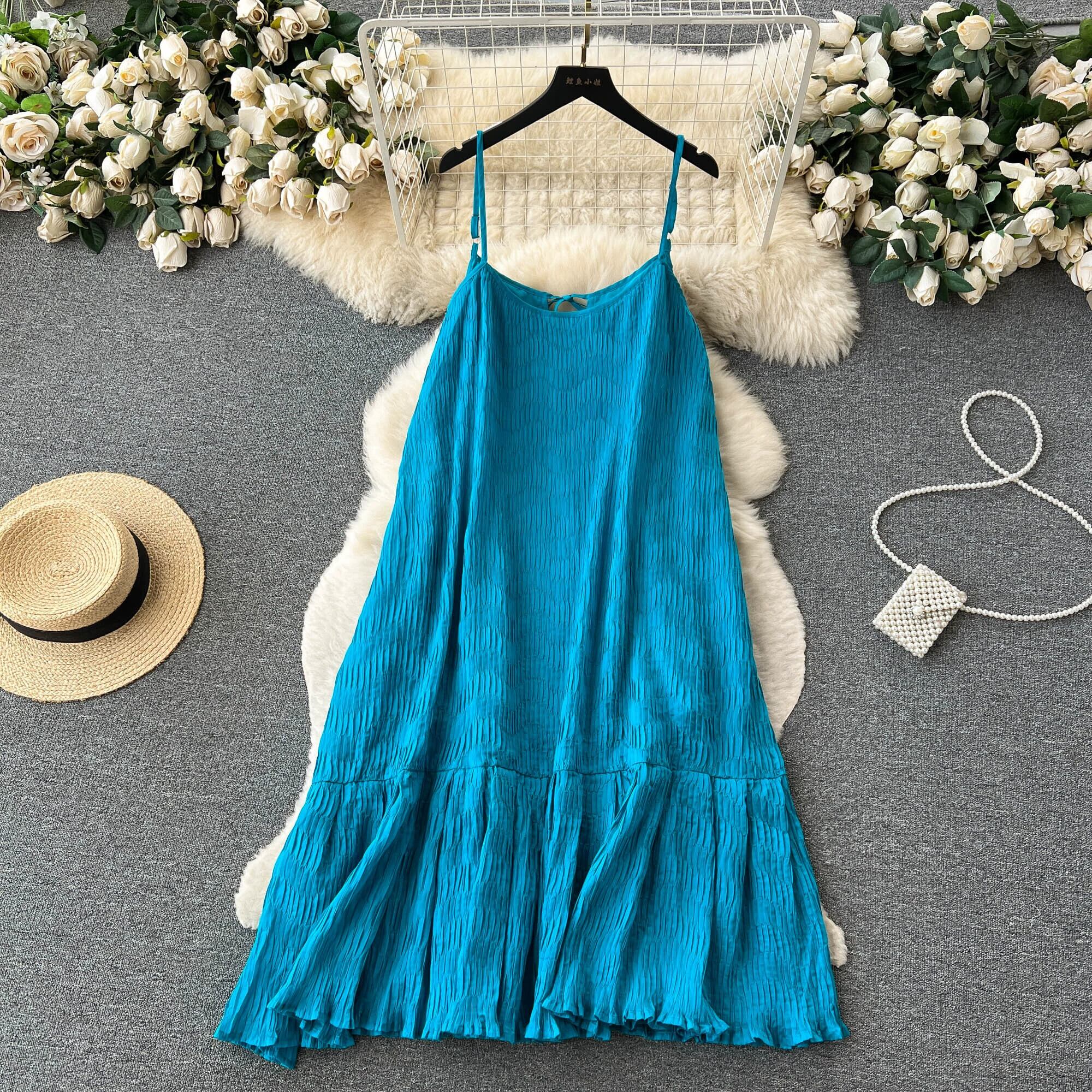 ビーチスカートの女性は海辺で休暇を過ごし、新しい夏はウエストとワイドスカートが付いた白いプリーツサスペンダールーズドレスを着用します ホワイト サマー 夏物 lyxaj29171865575