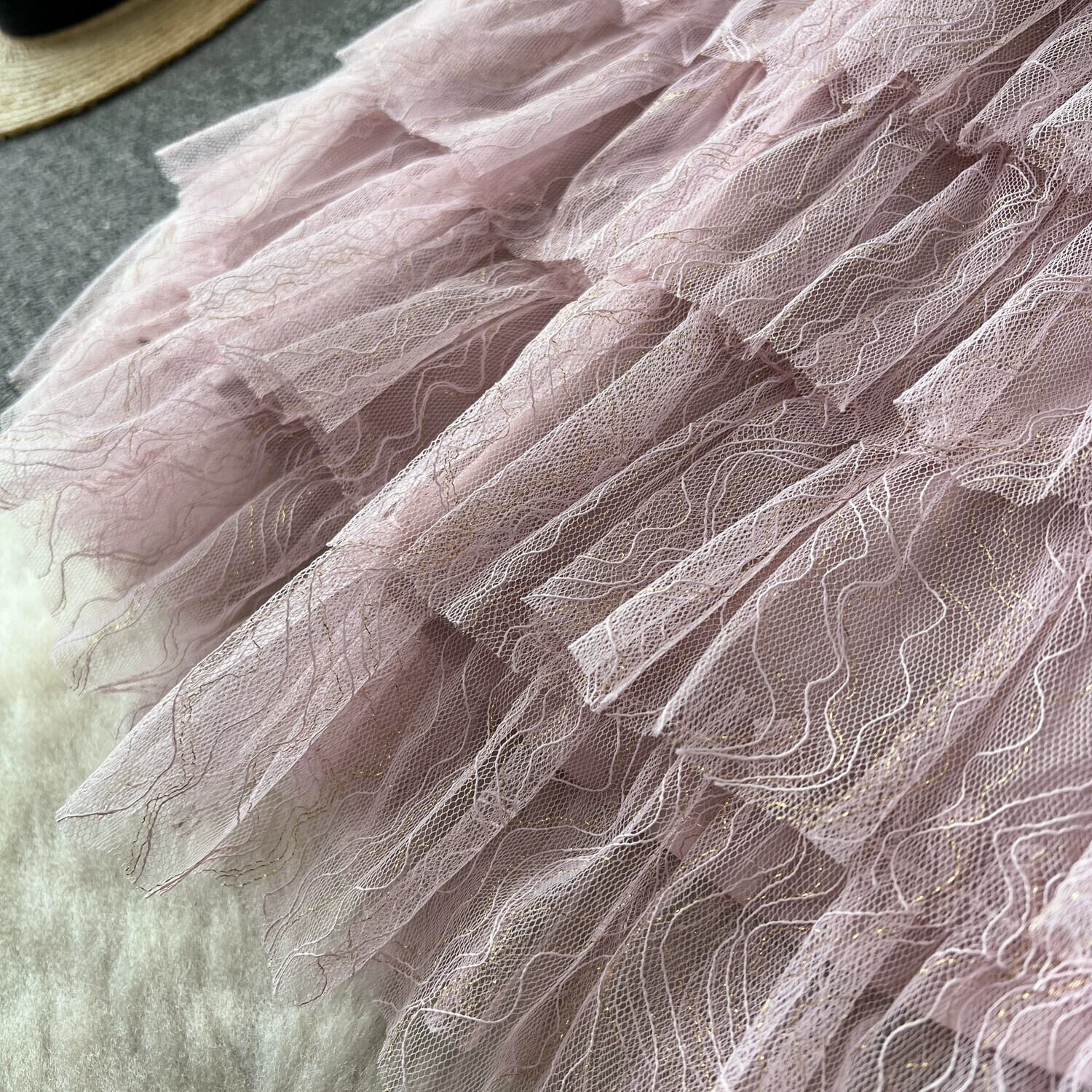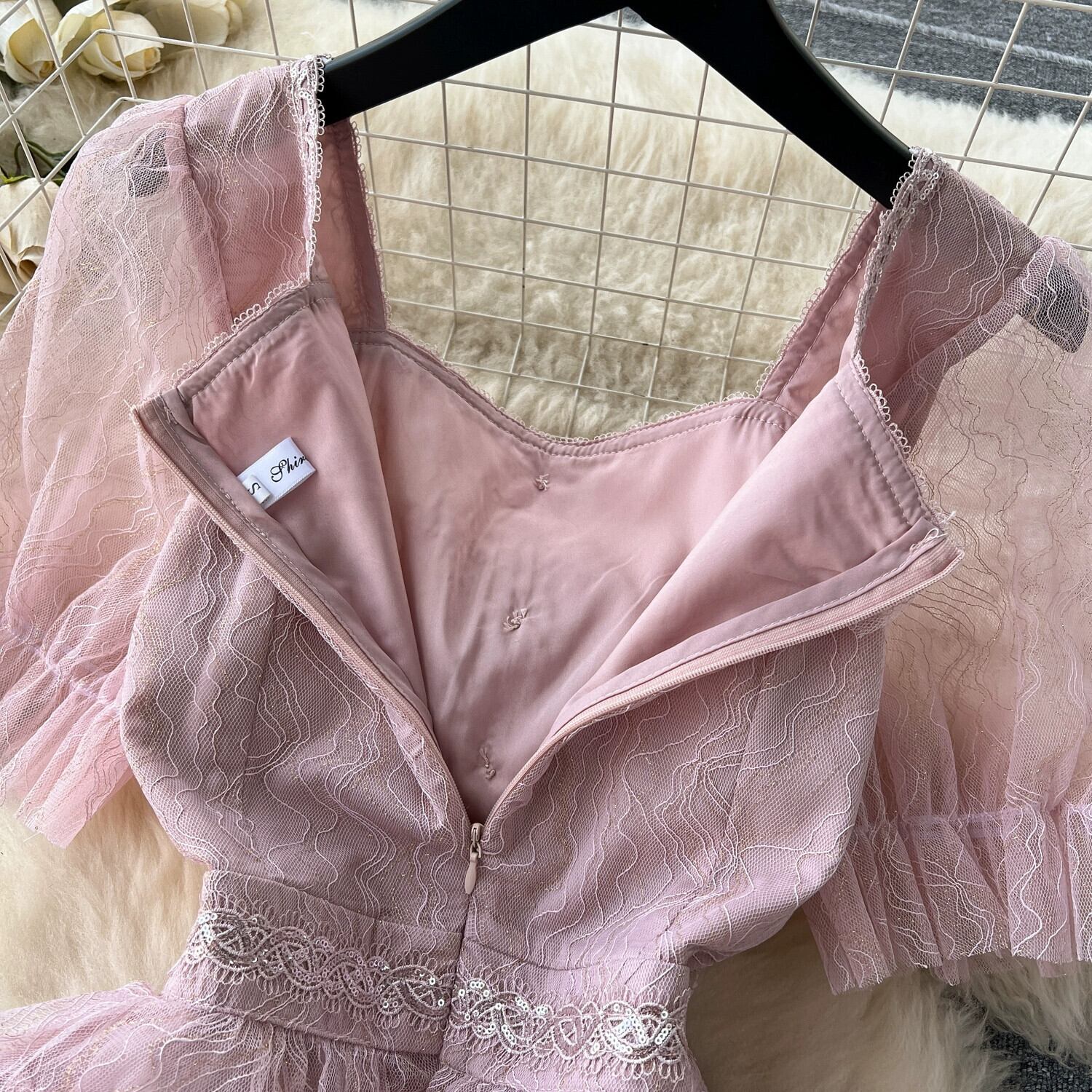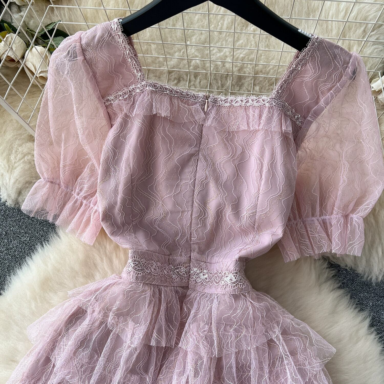 フレンチライトラグジュアリーレトロ気質ヘビーデューティビーズスクエアカラーパフスリーブメッシュチュチュスカート女性のウエスト痩身ドレス パニエ ペチコート スクウェア lyxaj42889190651