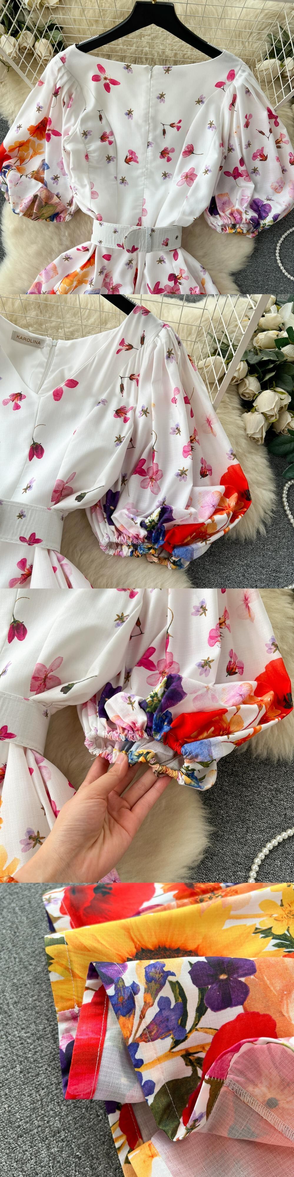 フレンチレトロ宮殿スタイル V ネックパフスリーブプリントドレスレディース夏ウエスト痩身 A ラインロングスカート レース サマー 夏物 Vネック Aライン lyxaj31133825207