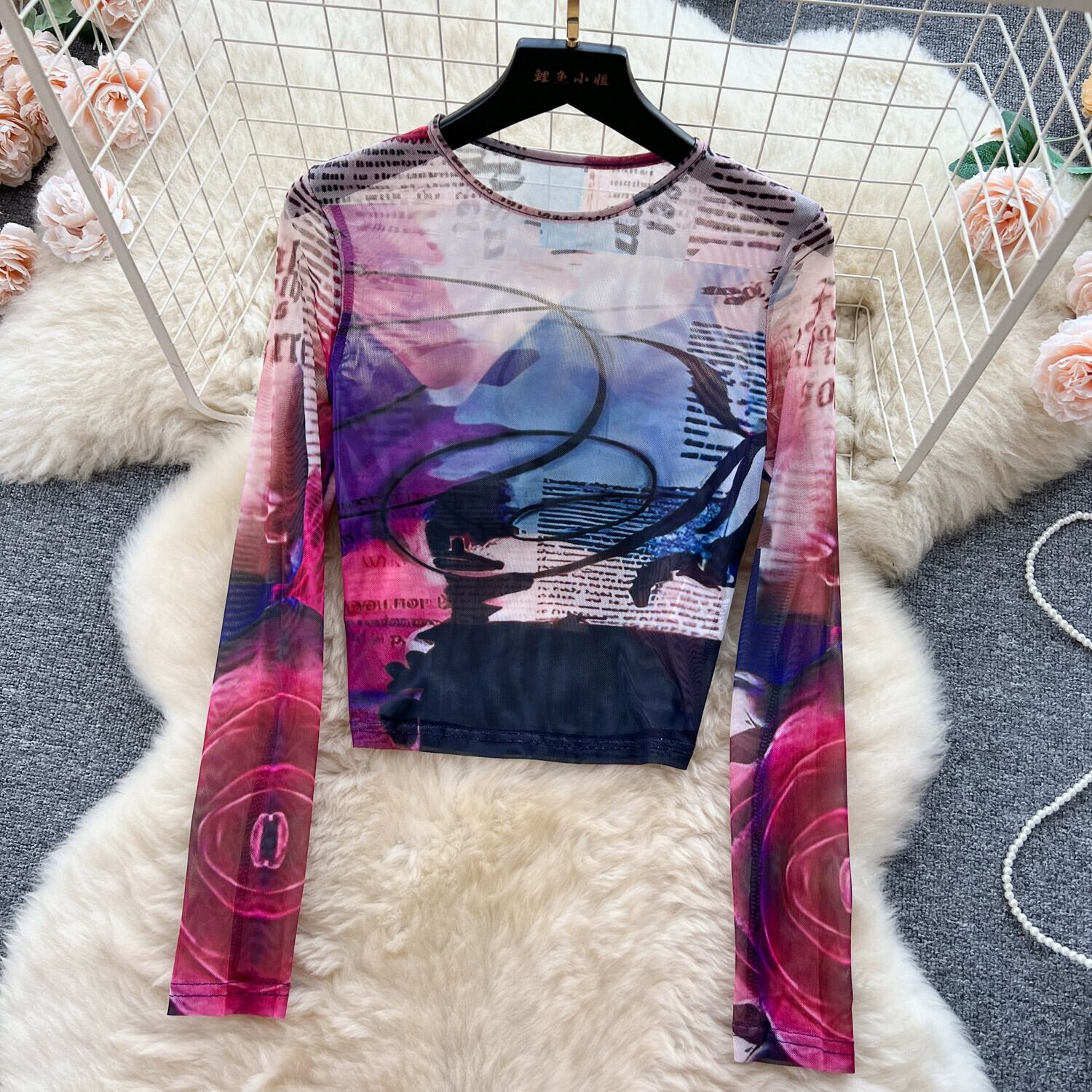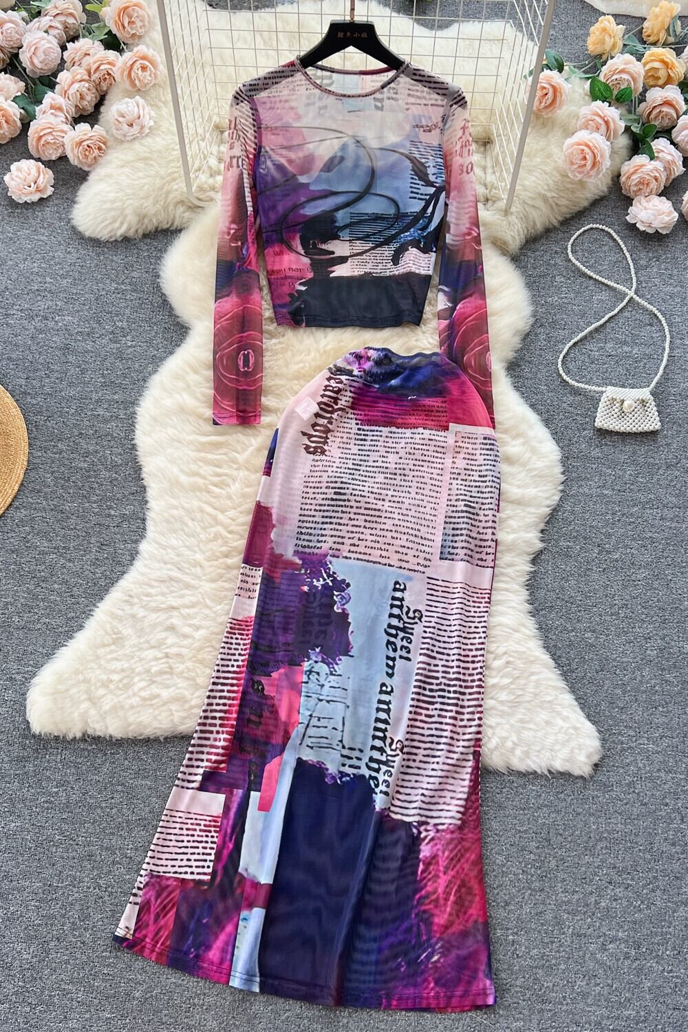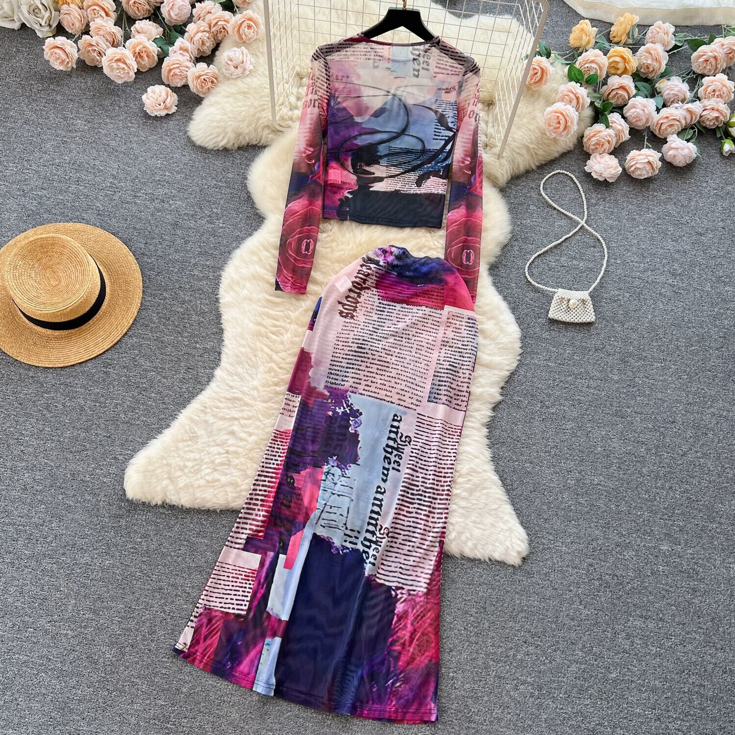 欧米ファッション高級シースルー薄手長袖プリントTシャツ+ハイウエストスリムスカート純粋な欲望スタイルの2点セット ロング ピュア ヨーロピアン lyxaj25324438594