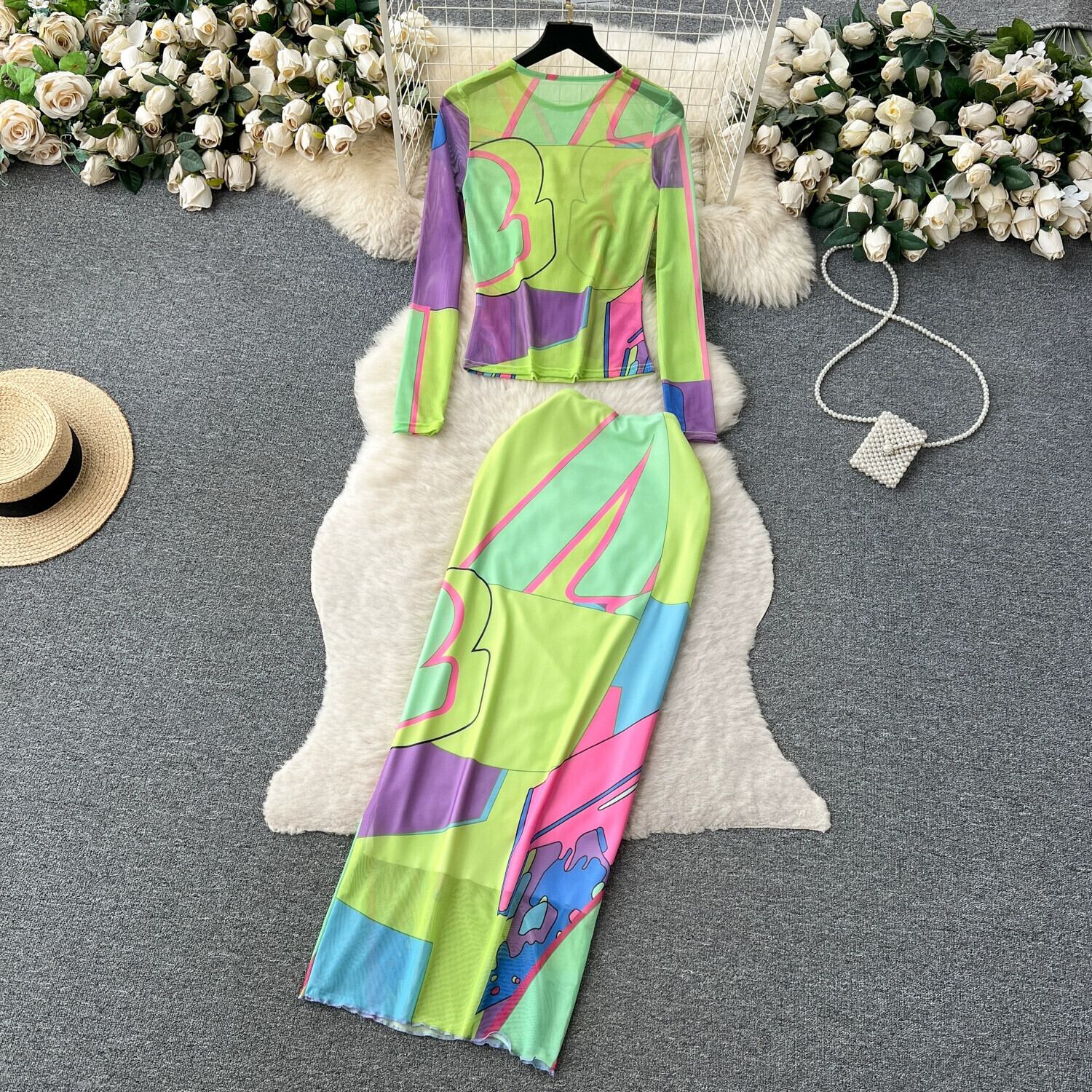 アメリカンスタイルの純粋な欲望ネクタイプリントスーツレディーススリム長袖メッシュTシャツ+ハイウエストヒップスカート2点セット ハイウェスト ロング ピュア lyxaj42658478979