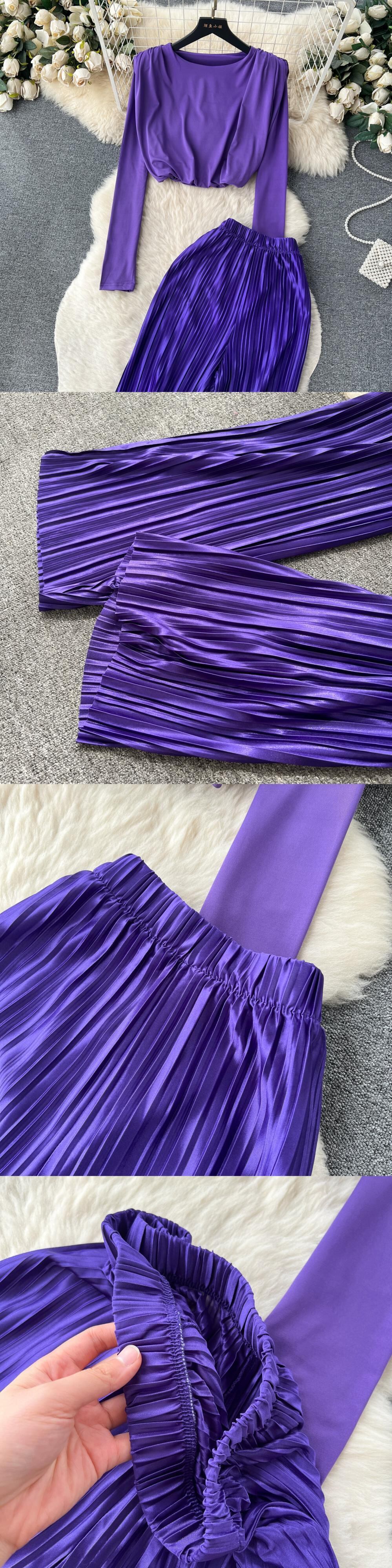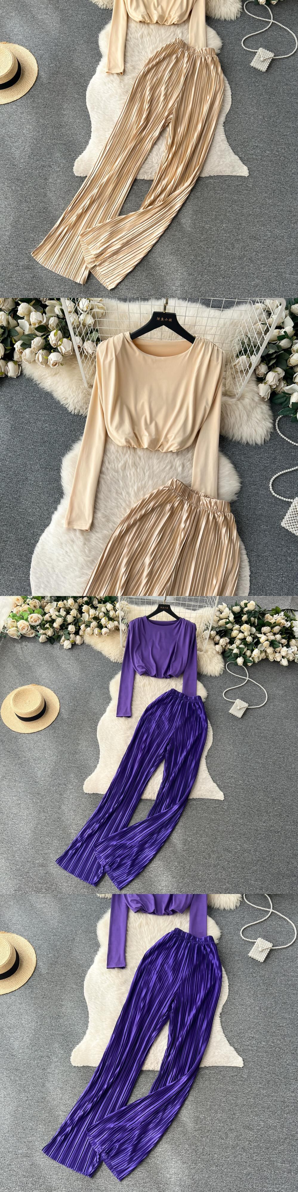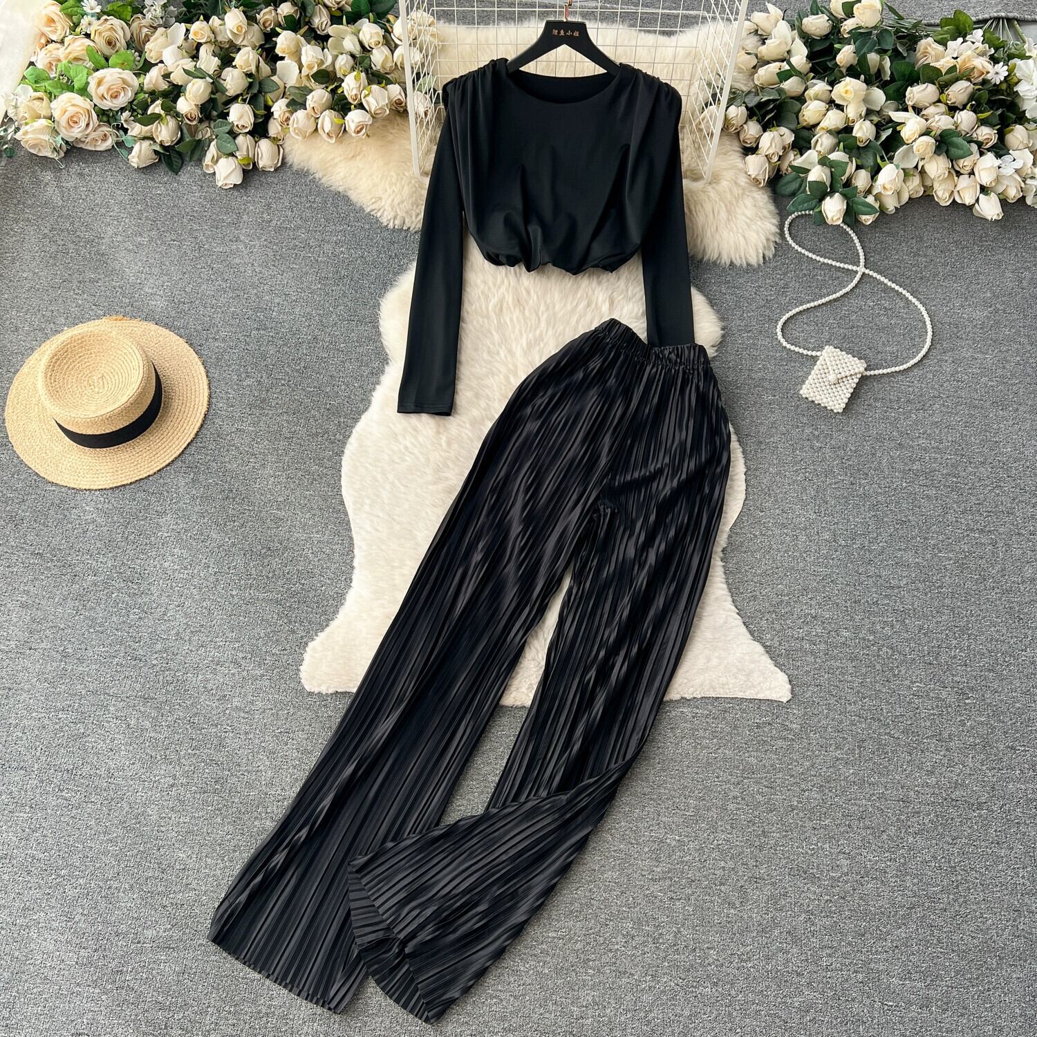 ヨーロッパとアメリカのファッションセットレディース、ラウンドネック、長袖、ショートクロップトップ+ハイウエストスリムプリーツワイドレッグパンツ2点セット ロング Oネック ヨーロピアン lyxaj3723267689