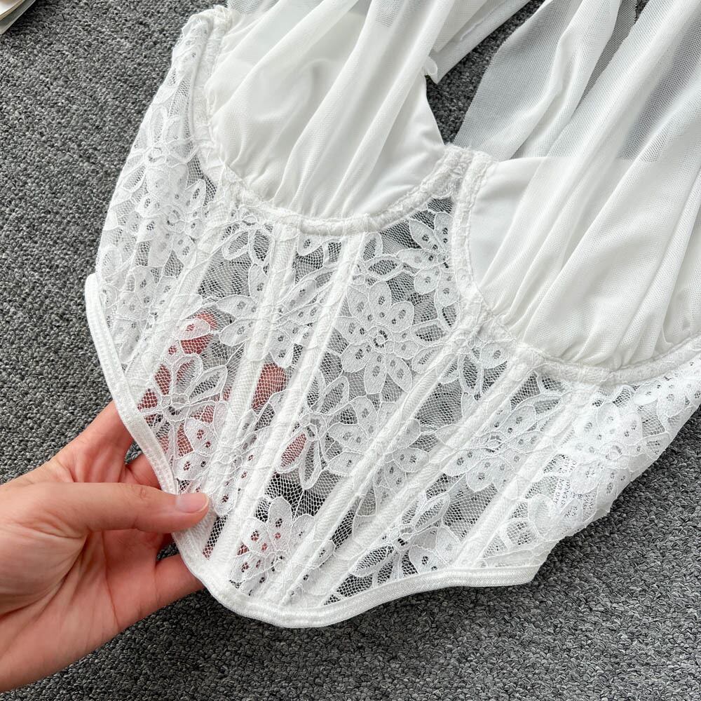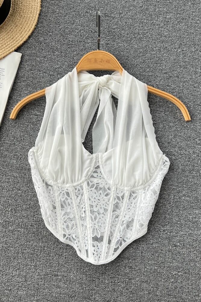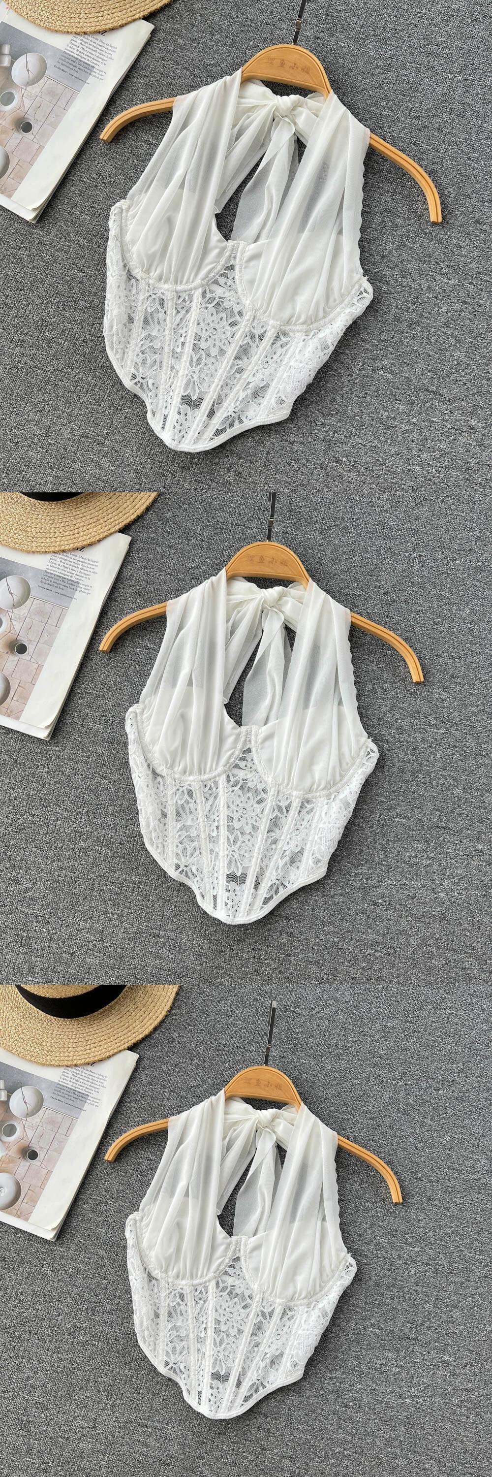 夏フレンチホルターネックストラップシフォンステッチ中空メッシュレースネクタイセクシーなチューブトップショートベストトップ サマー 夏物 lyxaj13087500533
