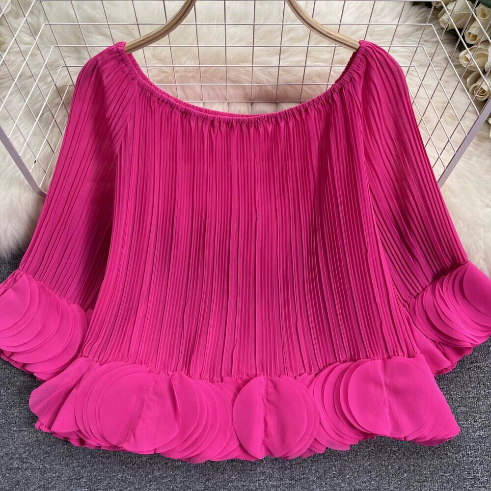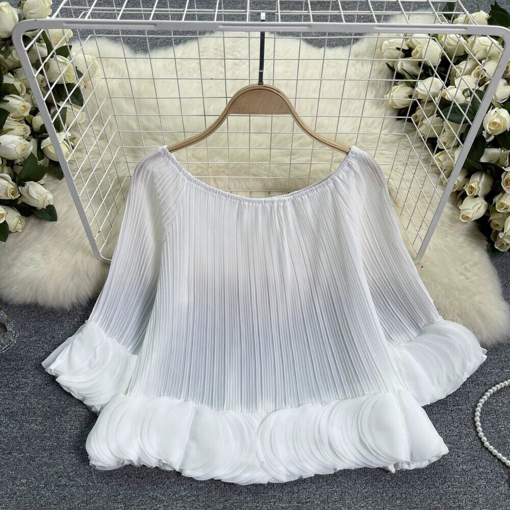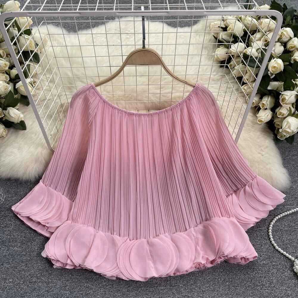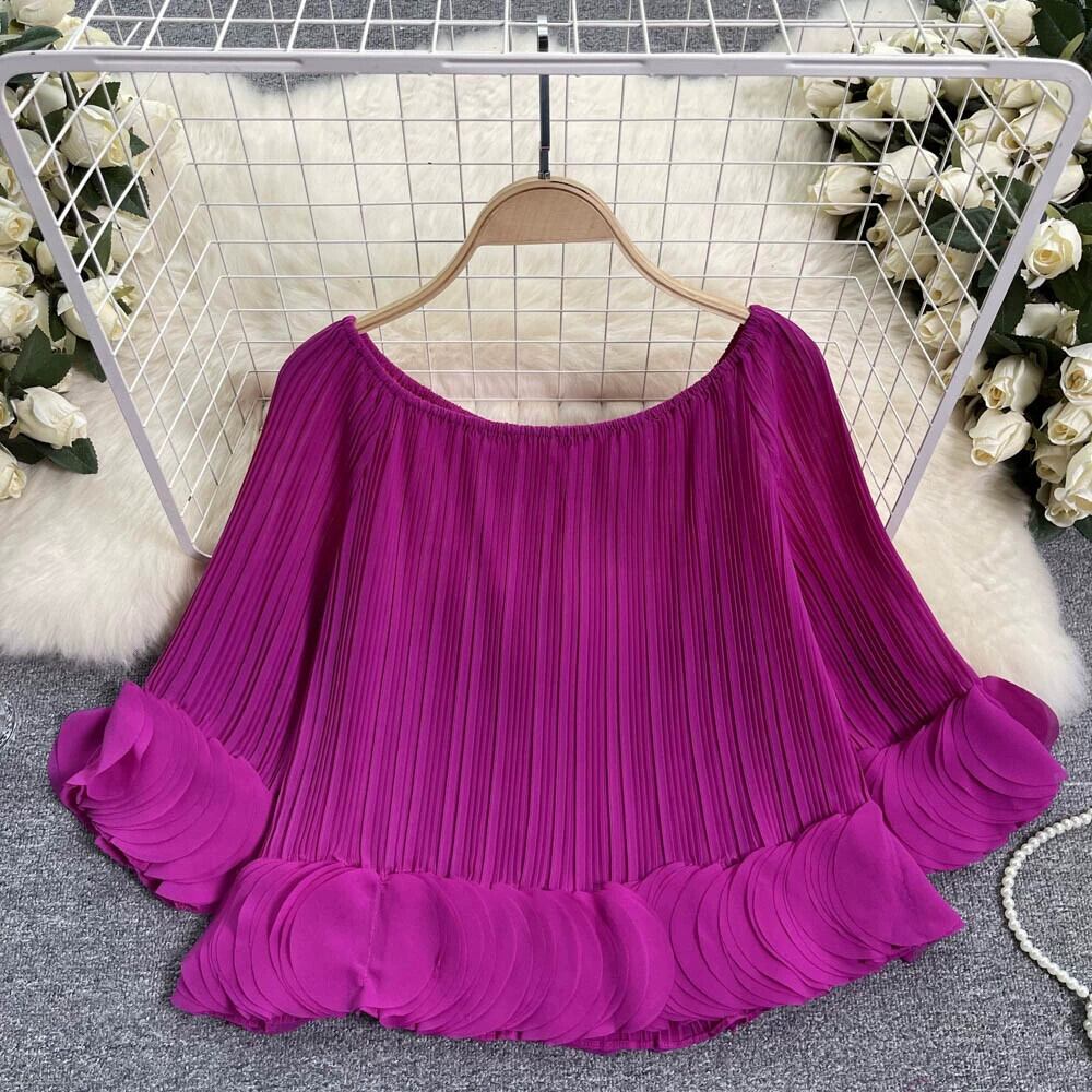 フレンチデザインプレスプリーツ花びらシフォンシャツ女性の夏の新しいルーズショートワンラインカラーオフショルダープリーツシャツ サマー 夏物 lyxaj68076614160