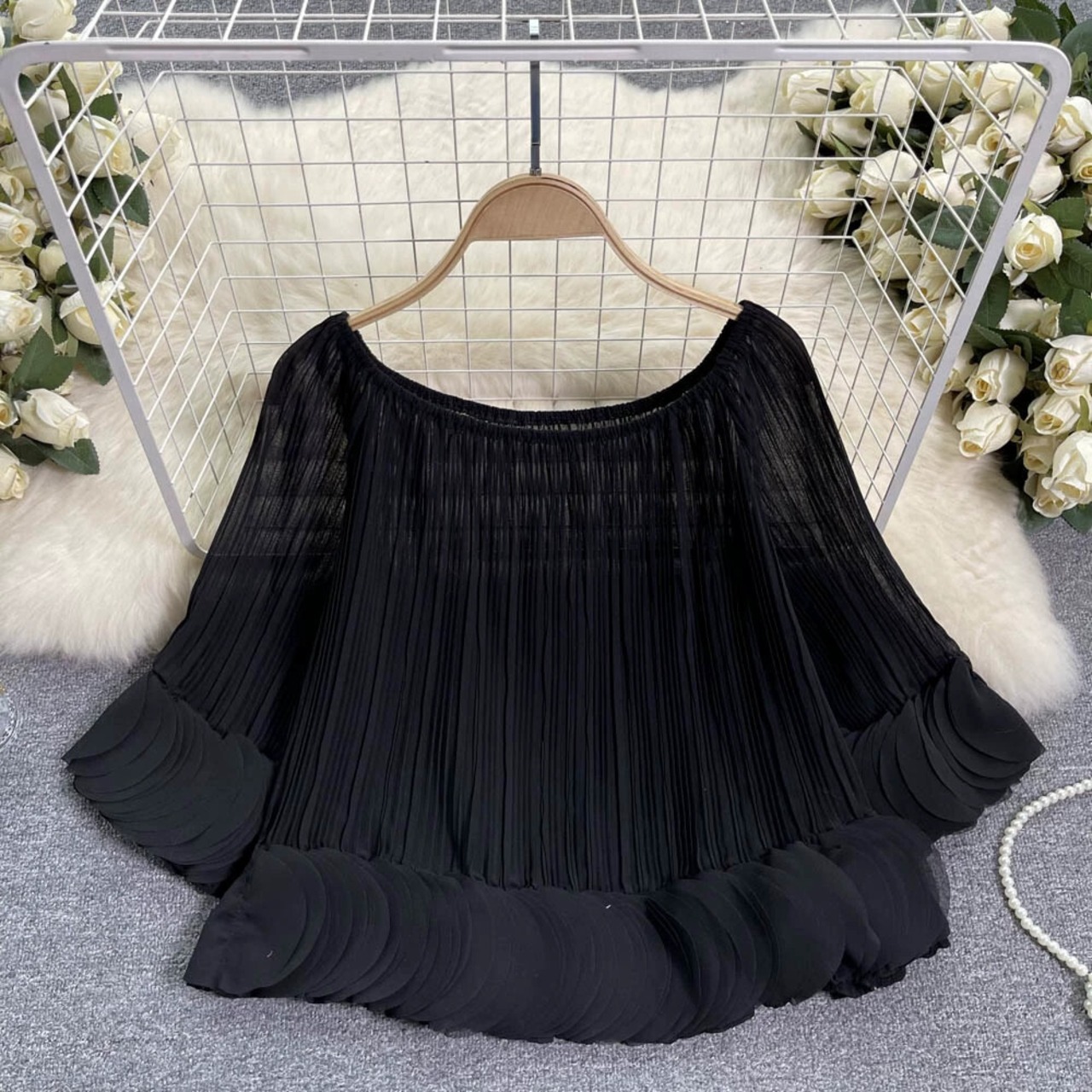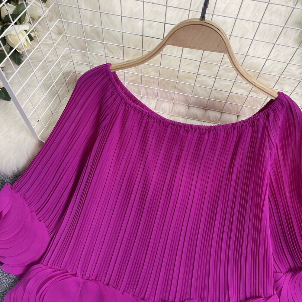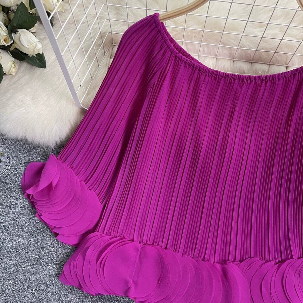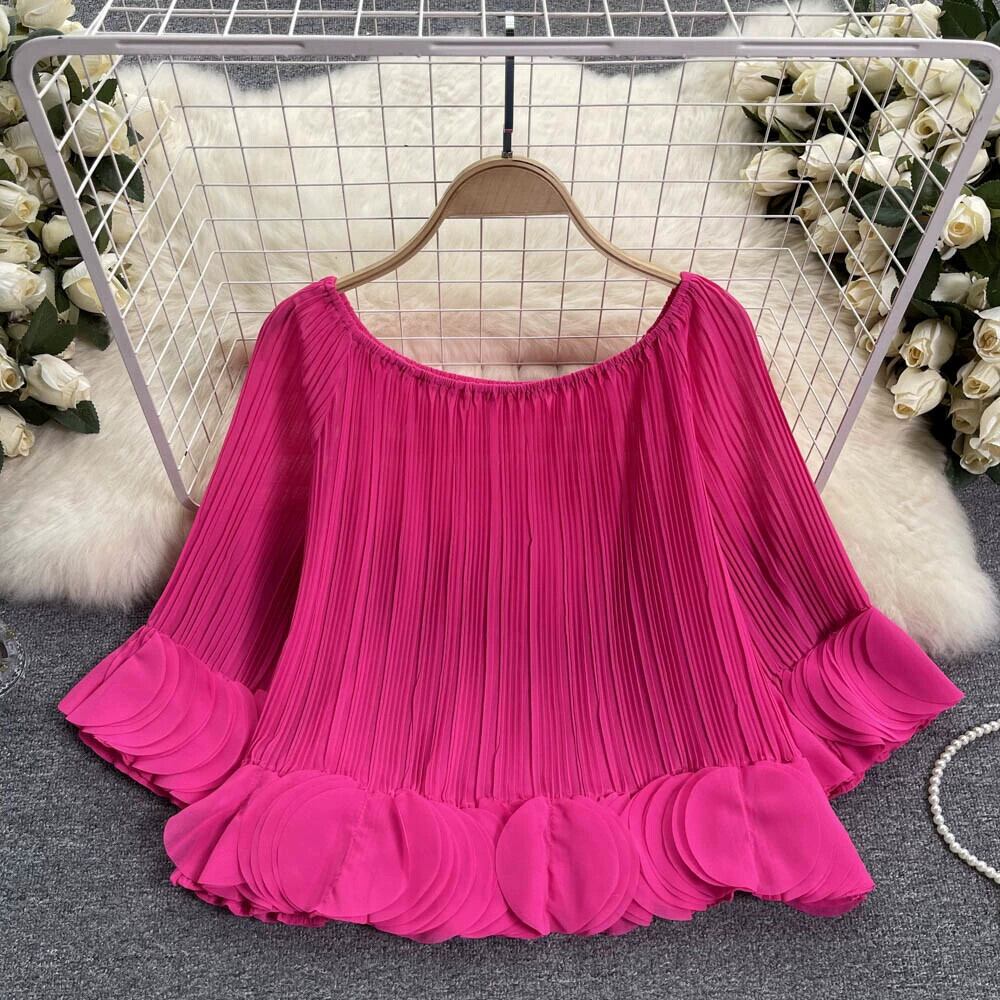 フレンチデザインプレスプリーツ花びらシフォンシャツ女性の夏の新しいルーズショートワンラインカラーオフショルダープリーツシャツ サマー 夏物 lyxaj68076614160