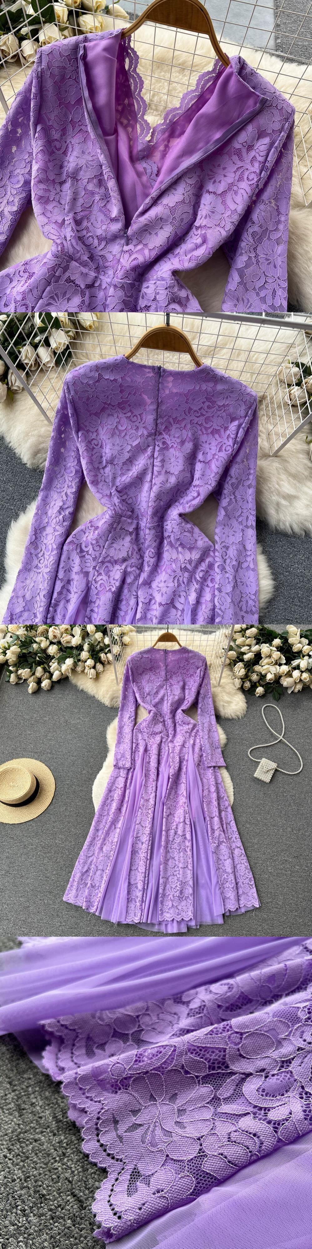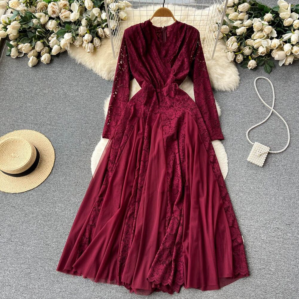 フランスの優しいスタイルのメッシュスプライシングレースドレス女性の新しいウエスト痩身気質大きな裾の V ネックロングスカート Vネック lyxaj24072726071