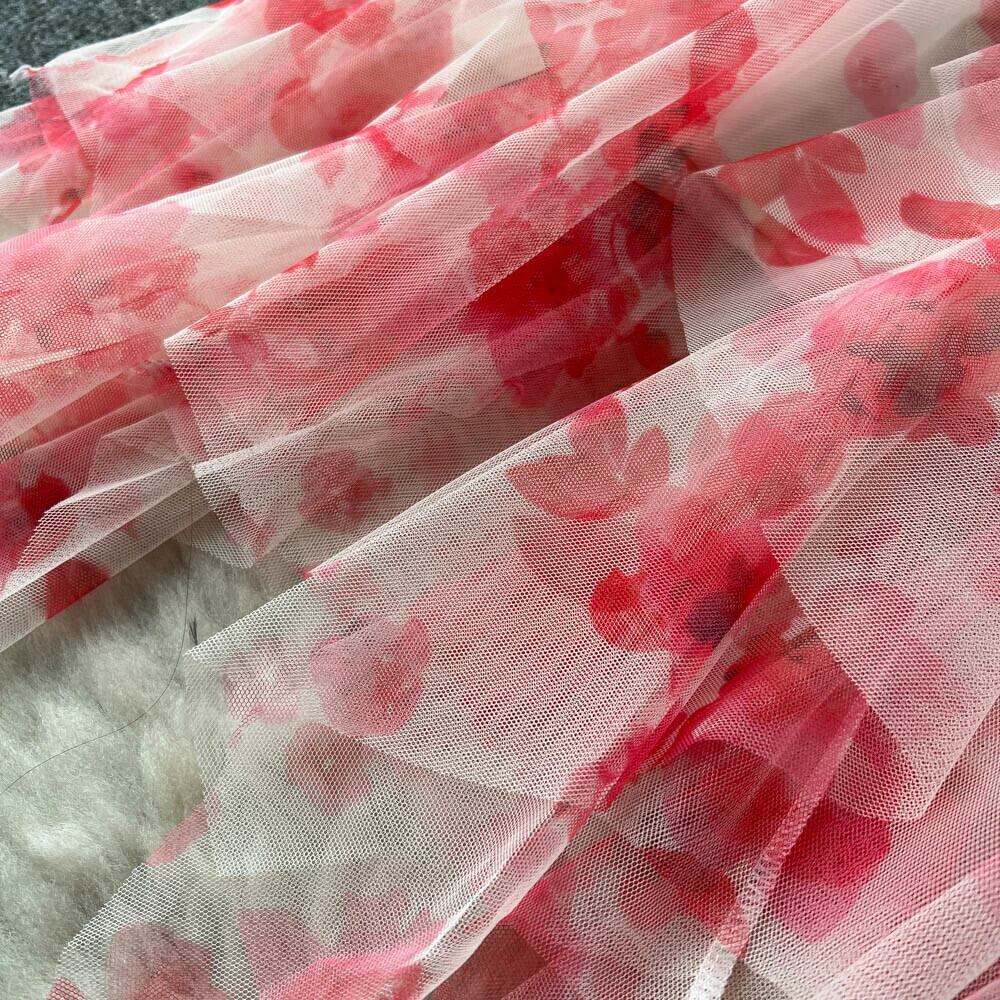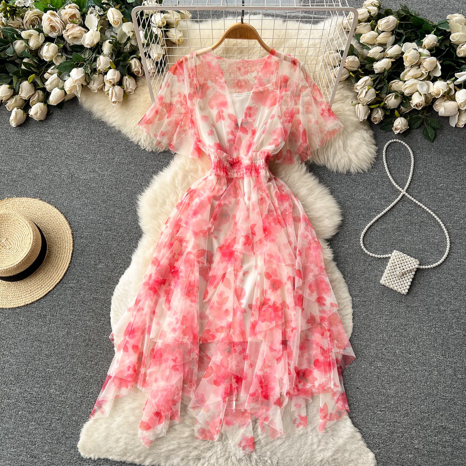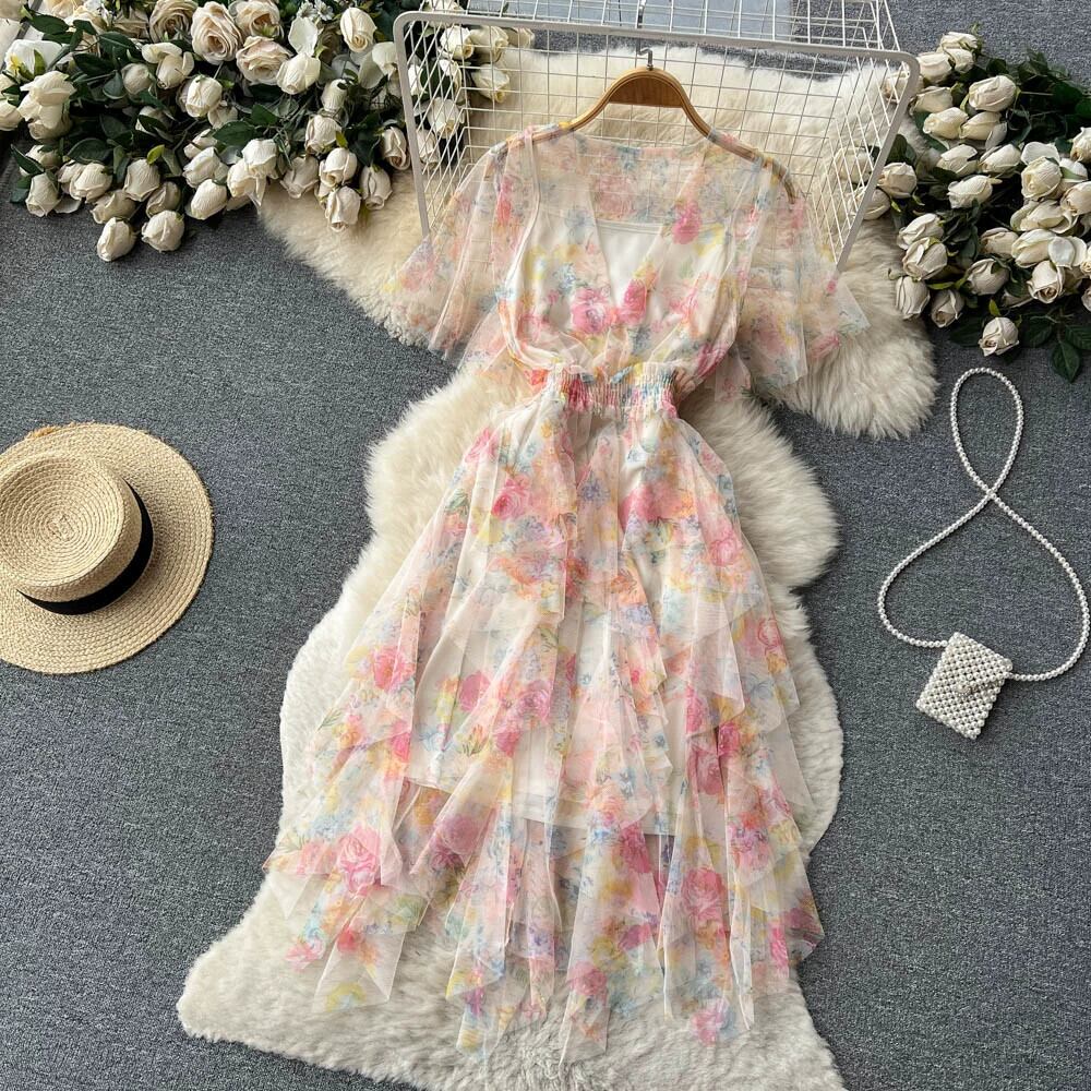 レトロなフランスの花柄ドレスの女性の夏の新しいスタイルの花びら袖ウエスト甘いスタイルスーパーフェアリーメッシュミッドレングススカート 大人ガーリー スウィート キュート カジュアル サマー 夏物 lyxaj16661860892