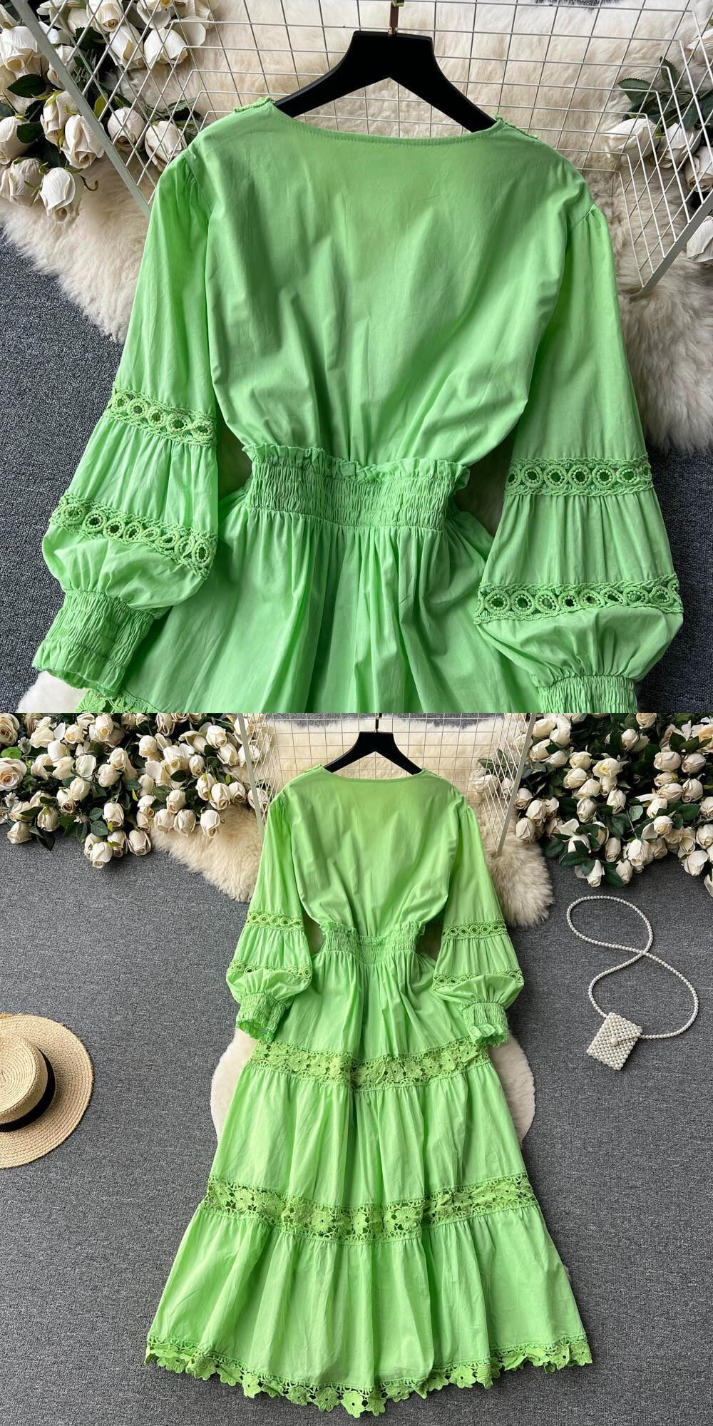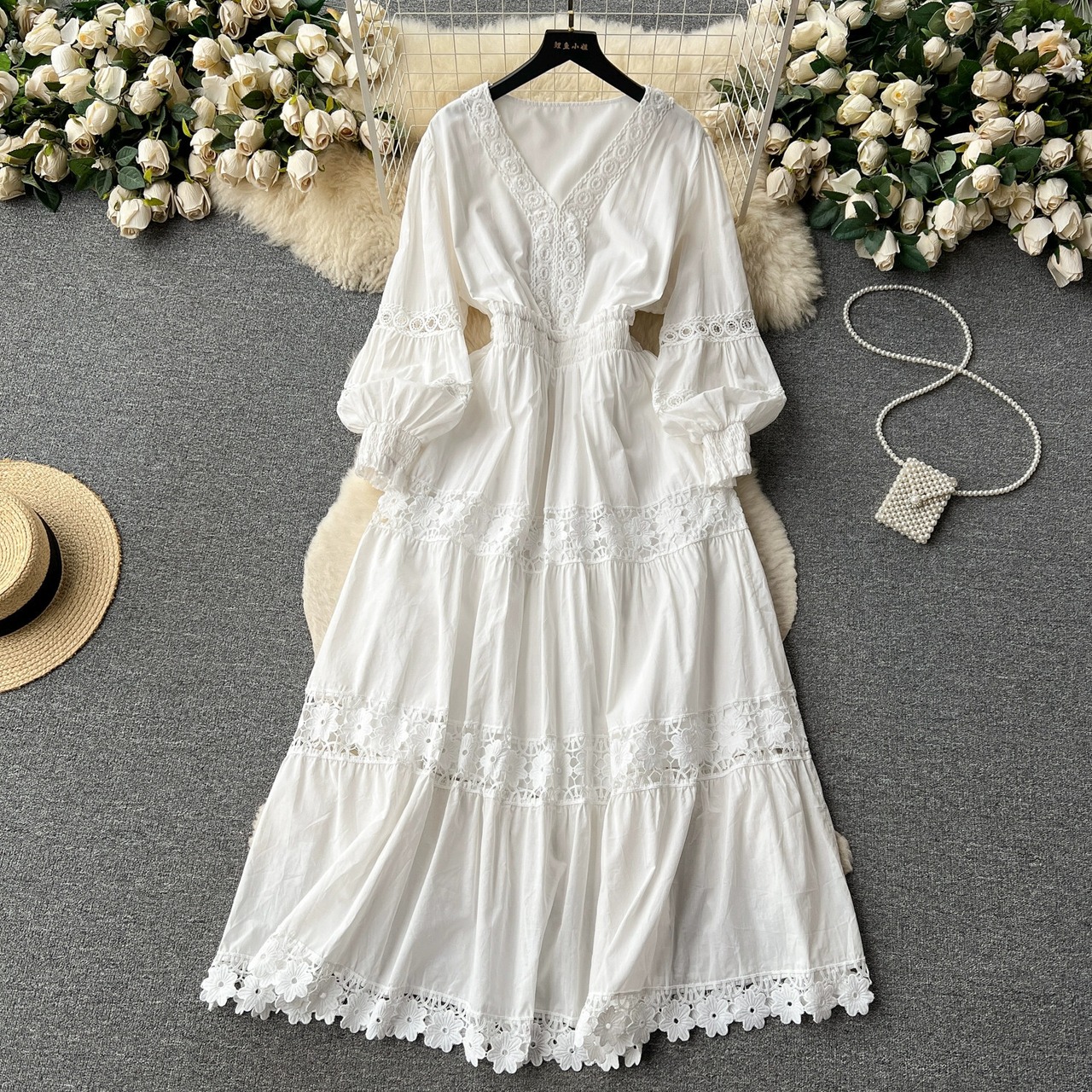 ヨーロッパ宮殿スタイルのドレスの女性の夏の V ネックランタン袖中空デザインフランスのハイエンドのエレガントなロングスカート ランタンスリーブ レース サマー 夏物 Vネック ヨーロピアン lyxaj22800074918
