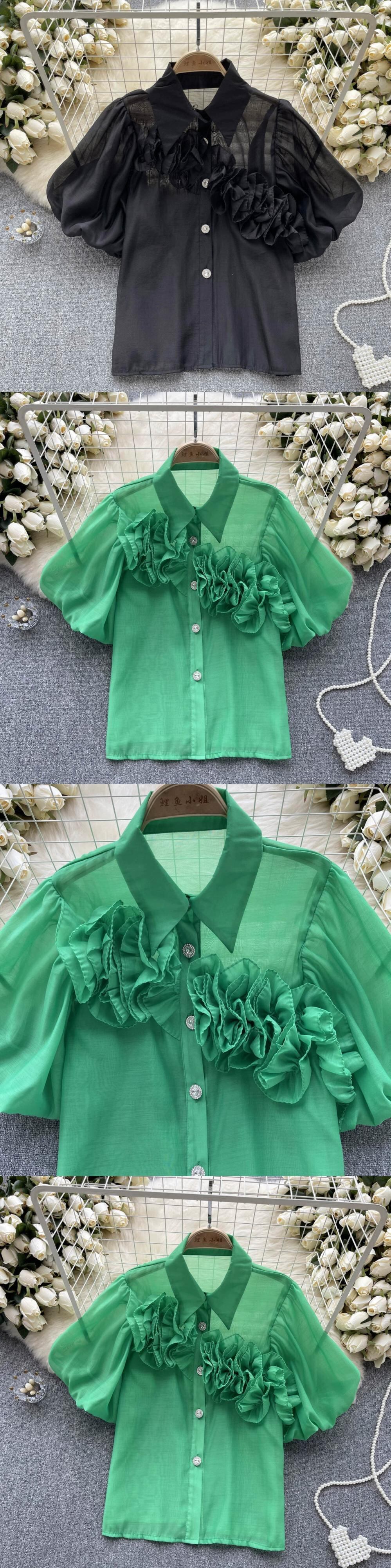 夏用薄手フランス製高級厚手立体花飾りパフスリーブゆったり万能シースルーシャツトップス サマー 夏物 フラワーデザイン lyxaj14944074459