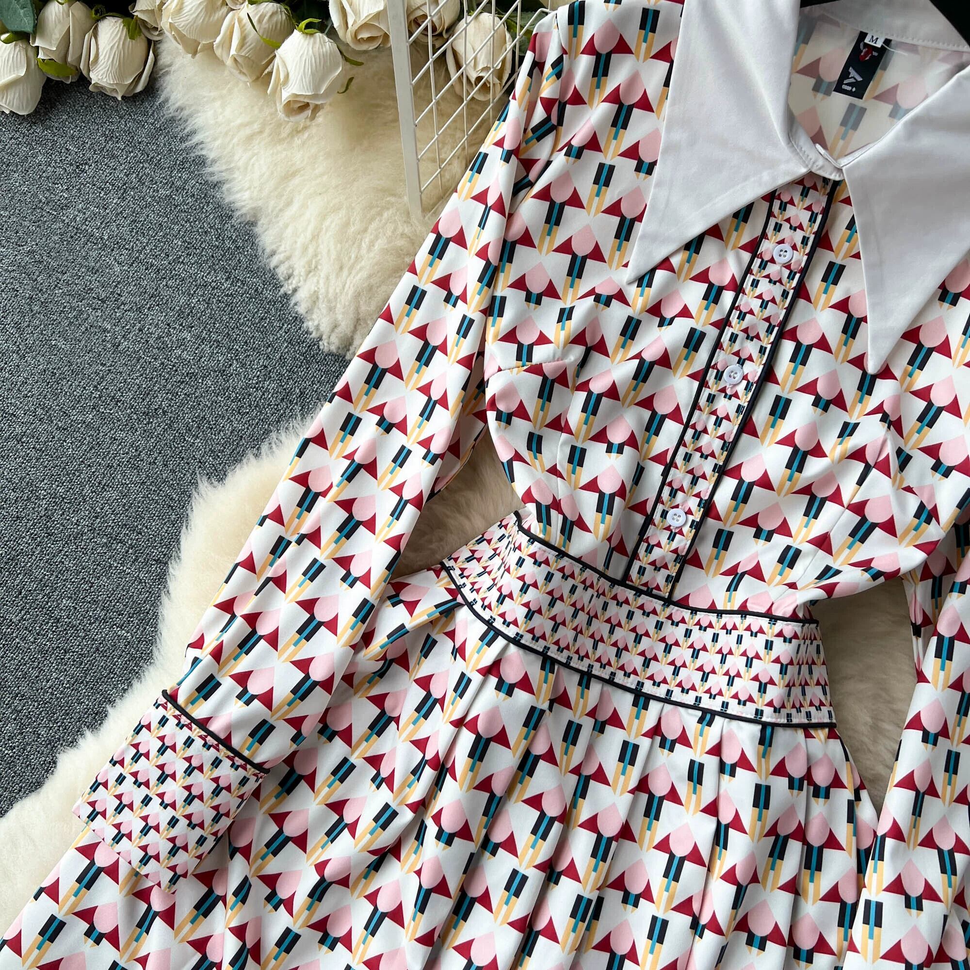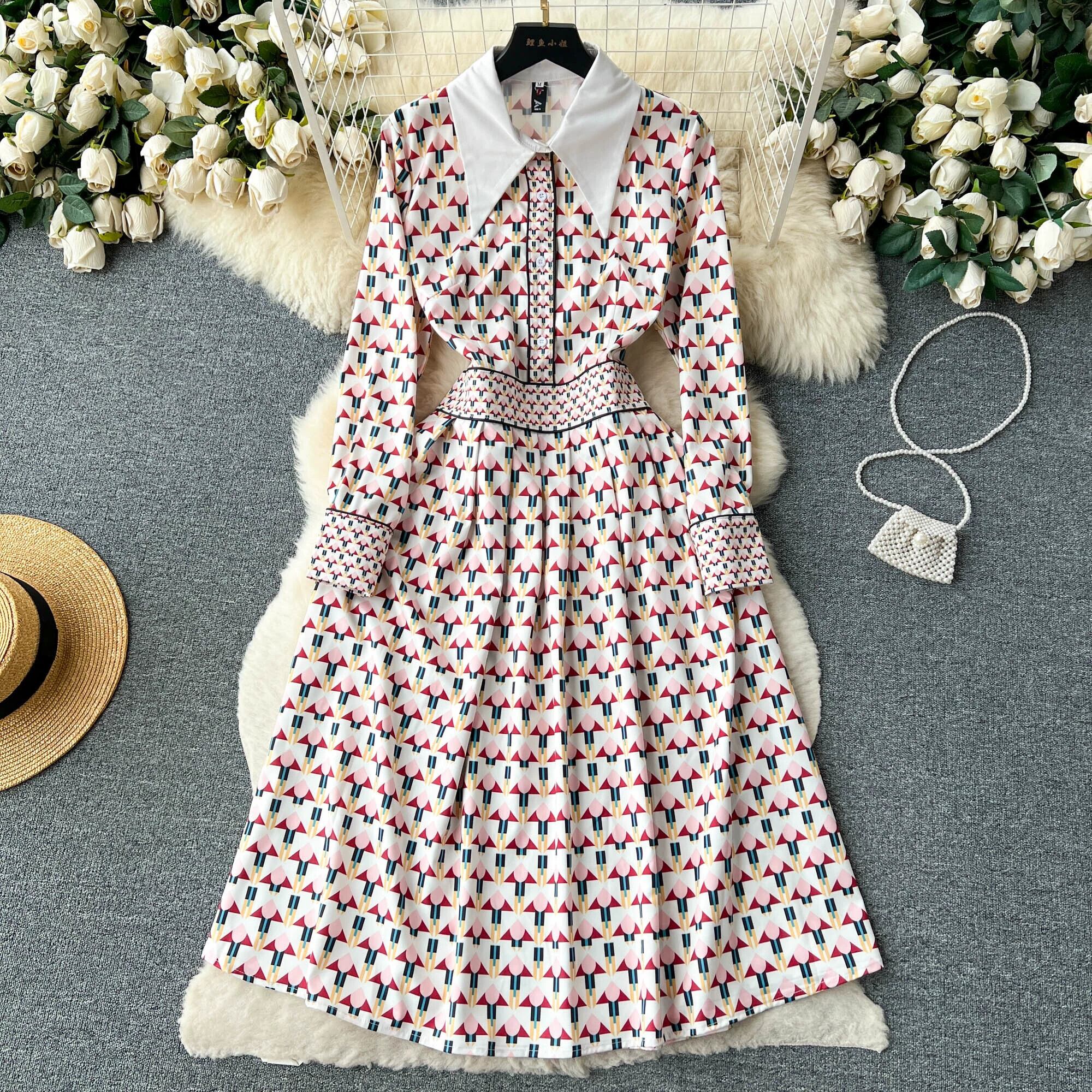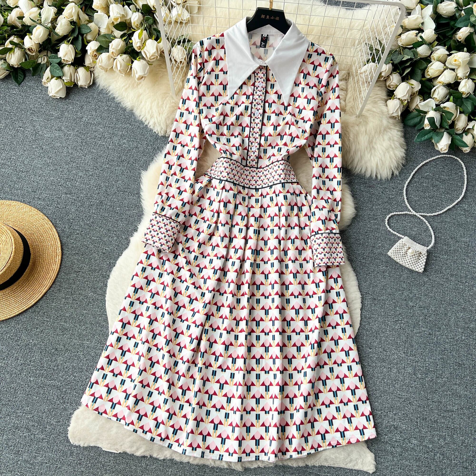 フランスのレトロな気質、エレガントで高級なラペルプリントの長袖ドレスの女性、ウエストを細くする、Aラインの大きな裾スカート ロング lyxaj3067197428