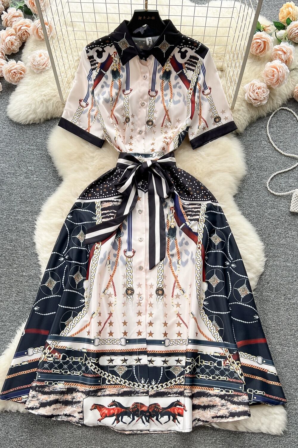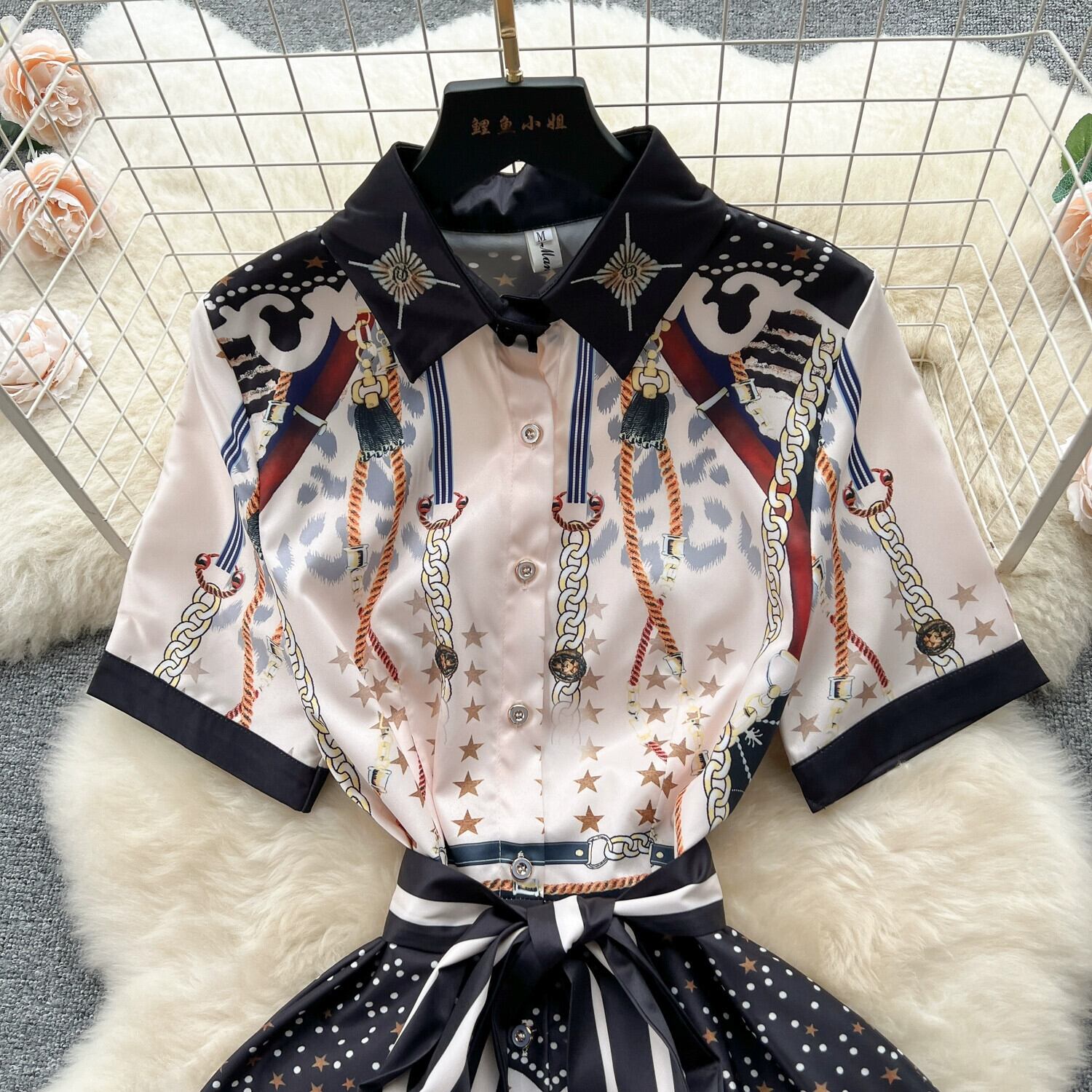 -end ファッションプリントドレス女性 2023 夏の新しいスタイル、エレガントなウエストスリムシャツドレス サマー 夏物 lyxaj87704473444
