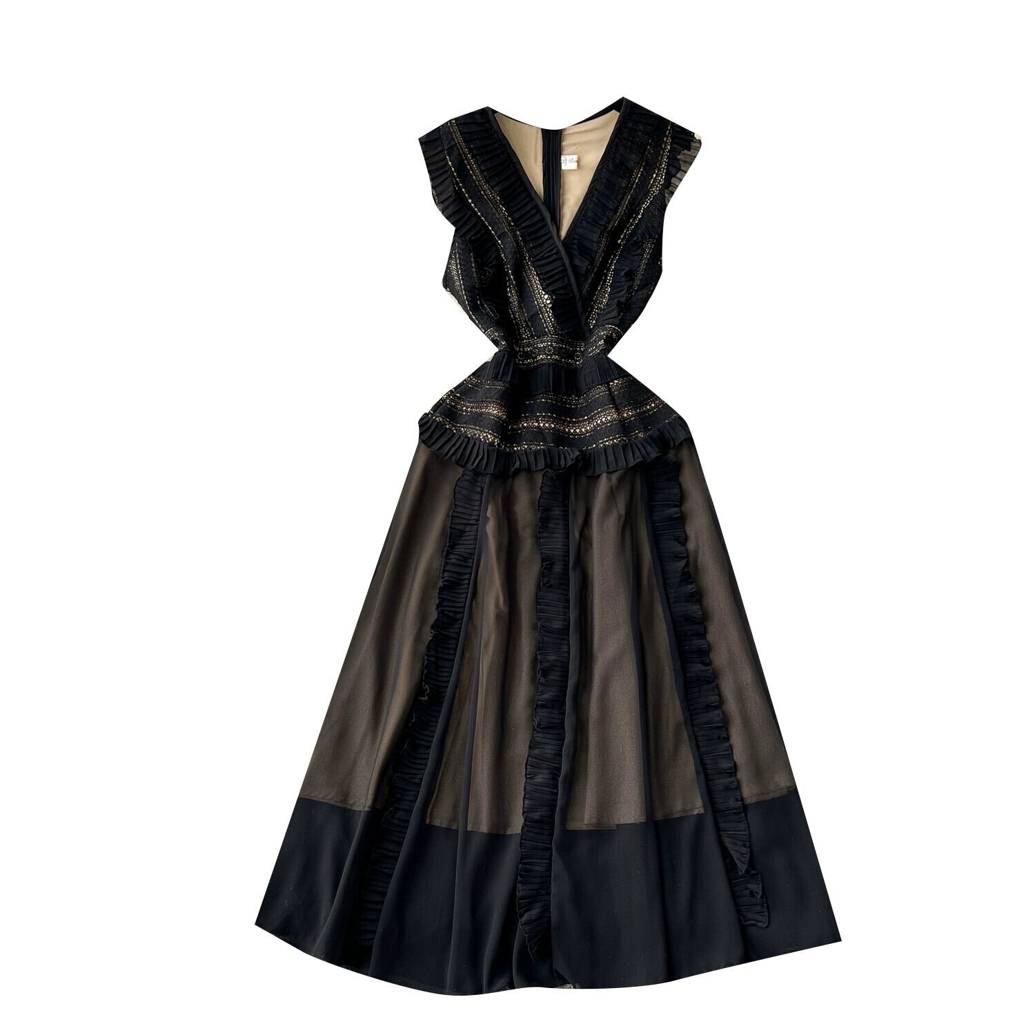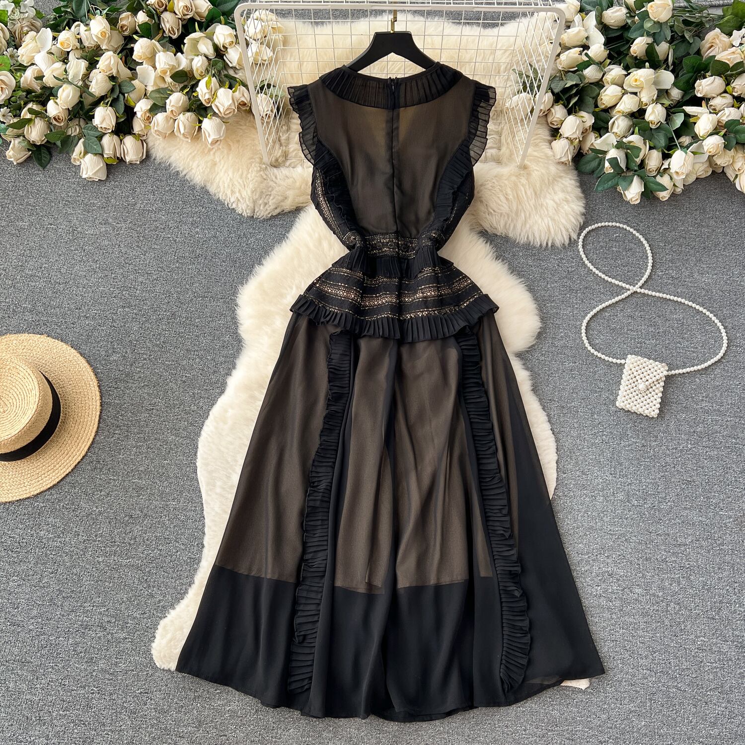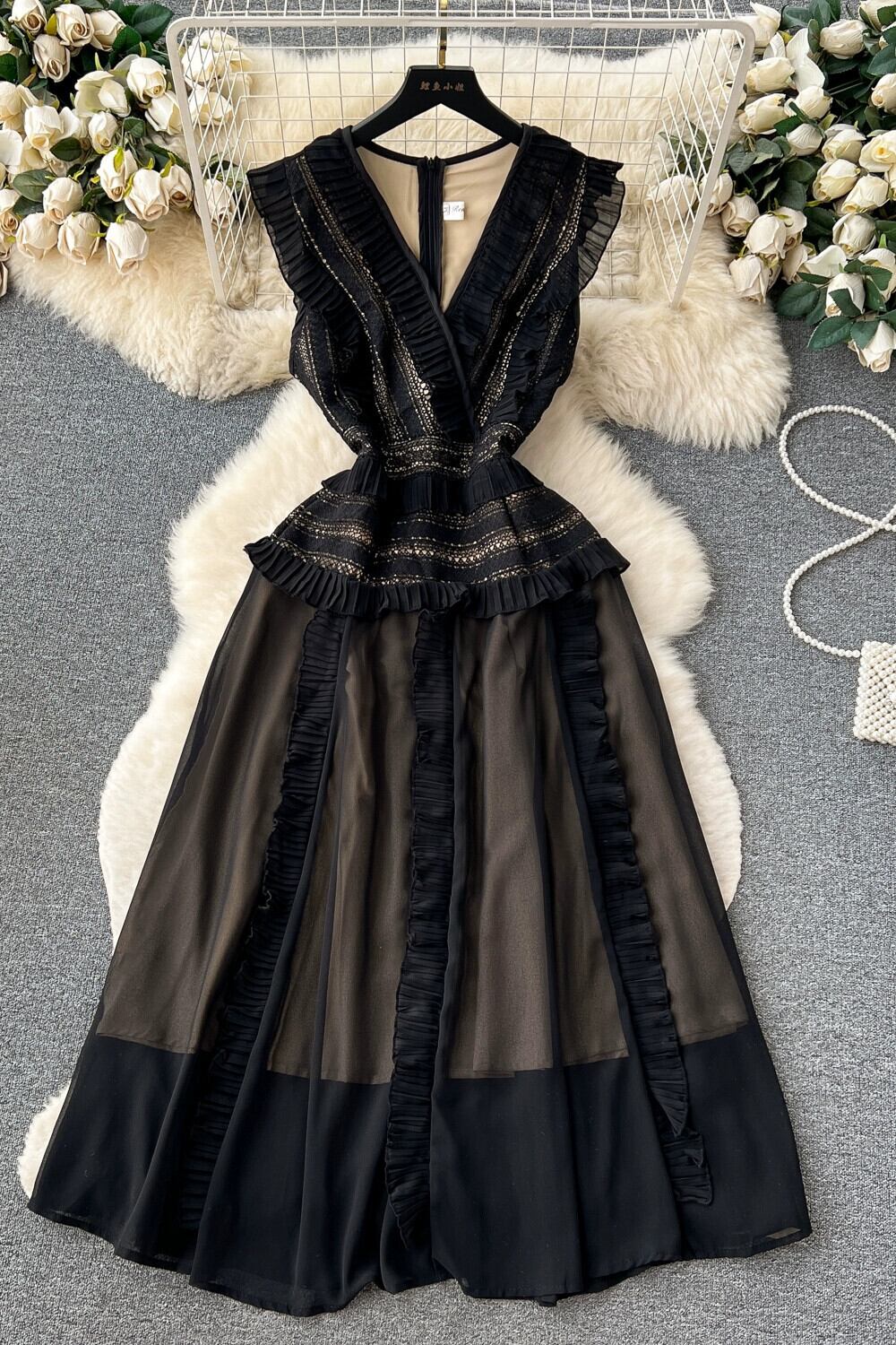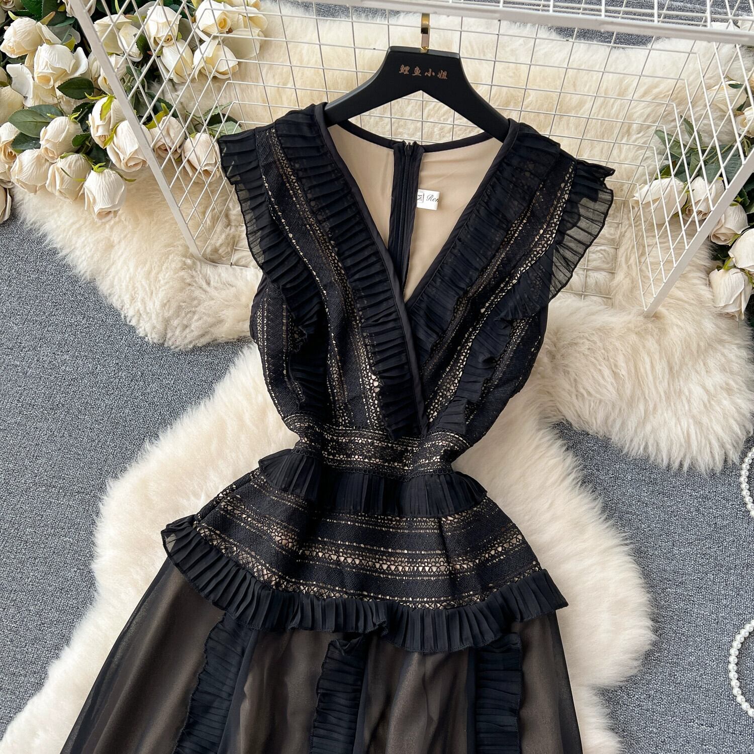 フレンチニッチデザインシフォンプリーツ菌レースかぎ針編みVネックウエストエレガントでトレンディなドレス lyxaj37536021708