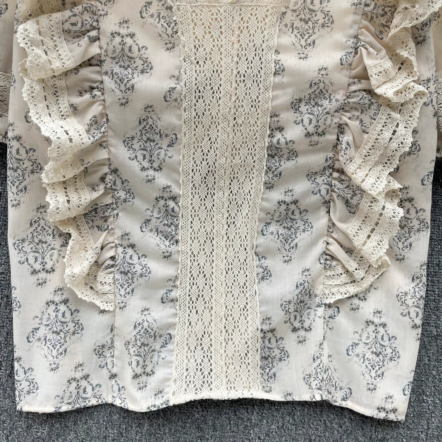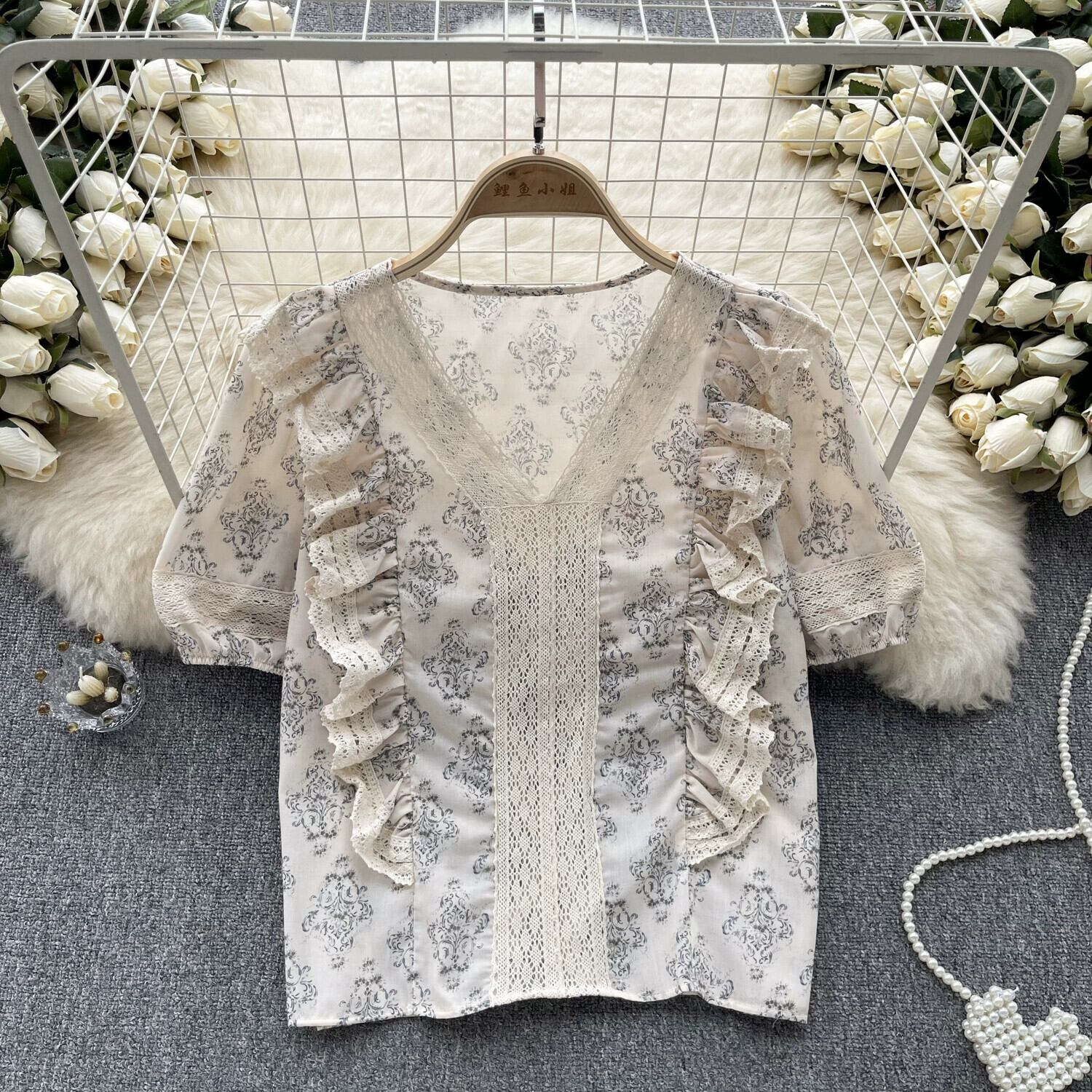 レトロエスニックスタイルプリントシャツ女性の夏のレースかぎ針編みフラワーイヤリングデザインニッチ気質ルーズトップ サマー 夏物 指輪 フラワーデザイン lyxaj86884004283