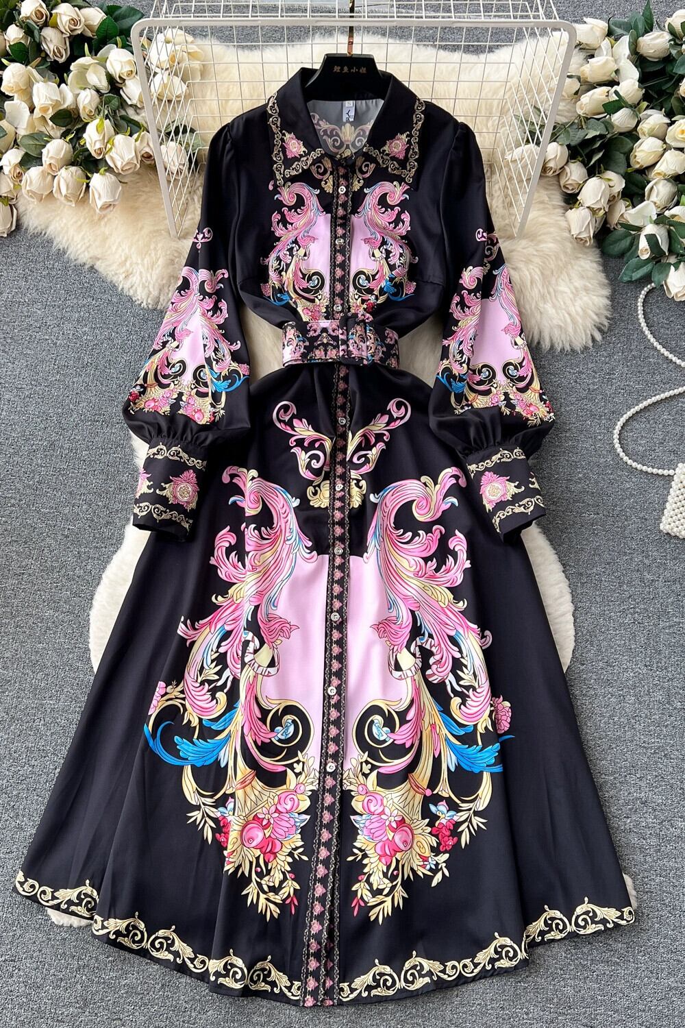 レトロな宮殿スタイルのプリントドレスの女性の春と夏のランタンスリーブデザインニッチハイエンド気質ロングスカート レース スプリング 春物 サマー 夏物 lyxaj39845518146