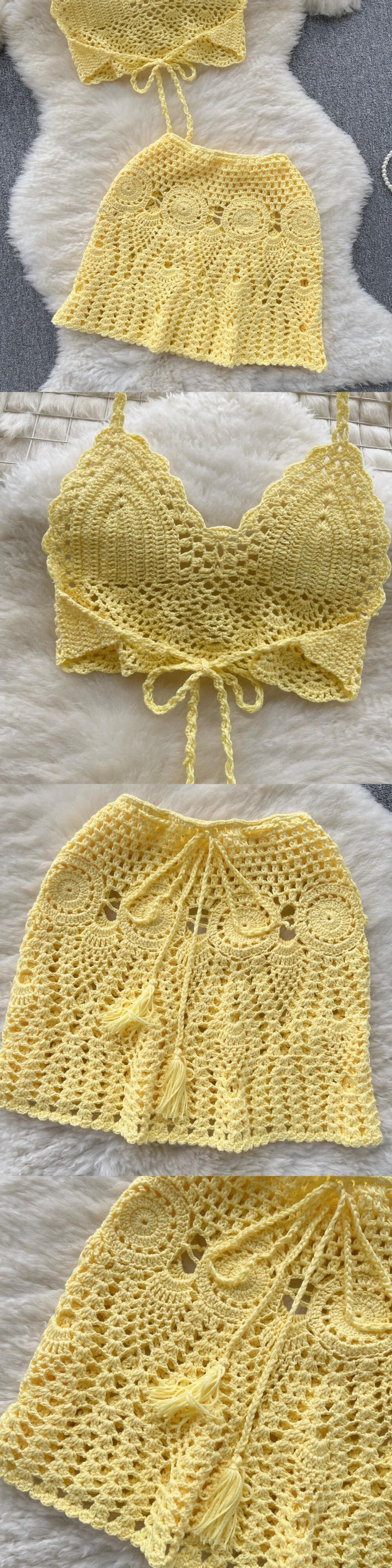 シーサイドリゾートスタイルニットサスペンダーチューブトップ中空ベスト+ハイウエストスカートツーピーススーツ女性 ハイウェスト lyxaj84222592990