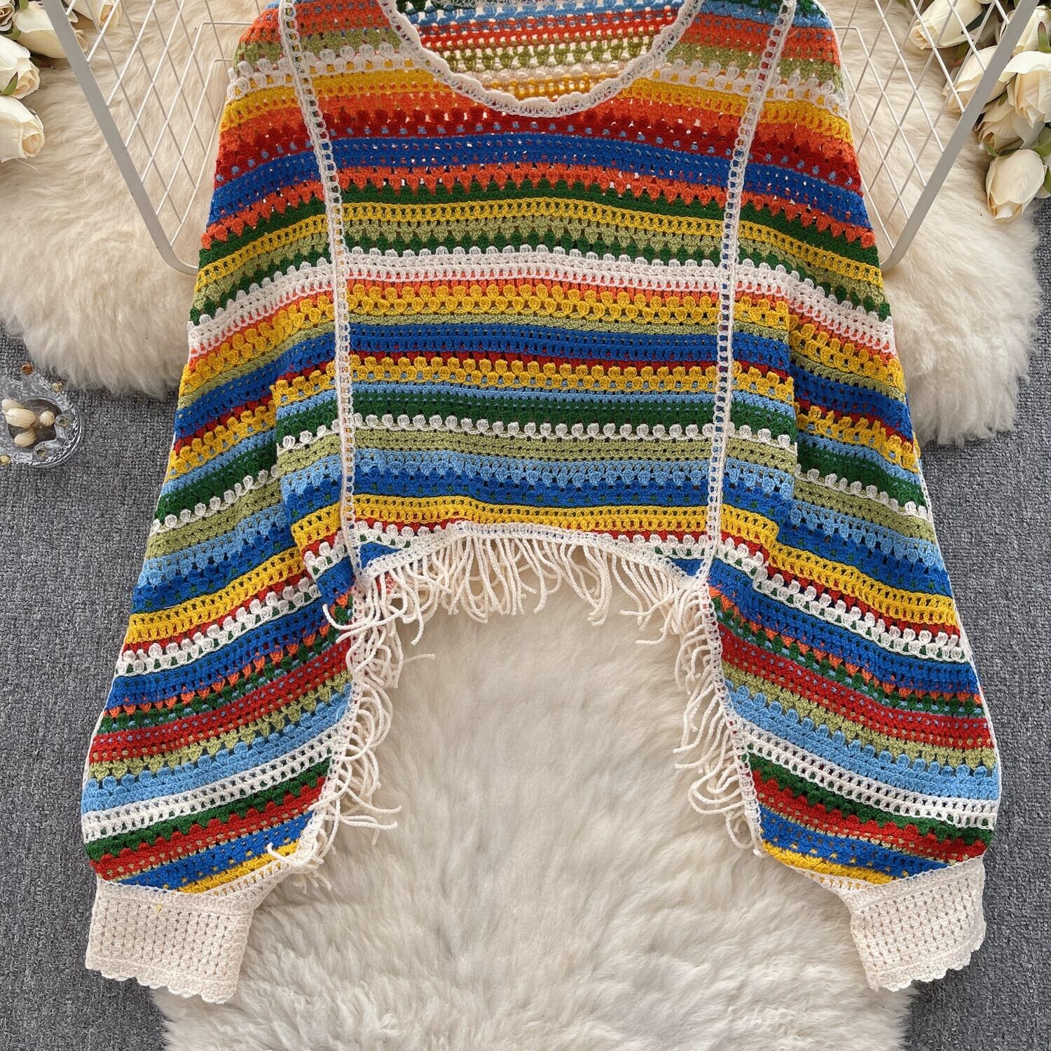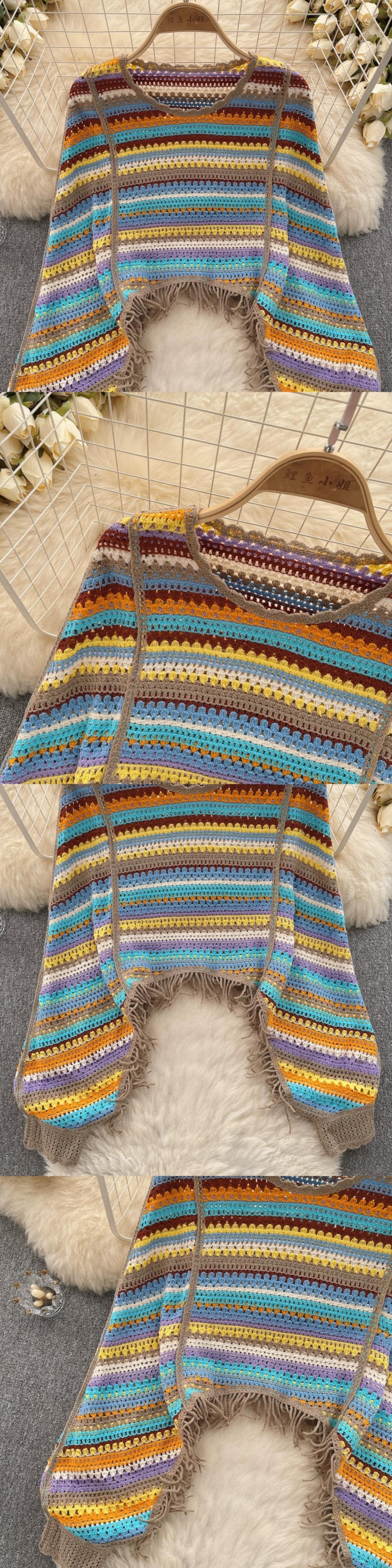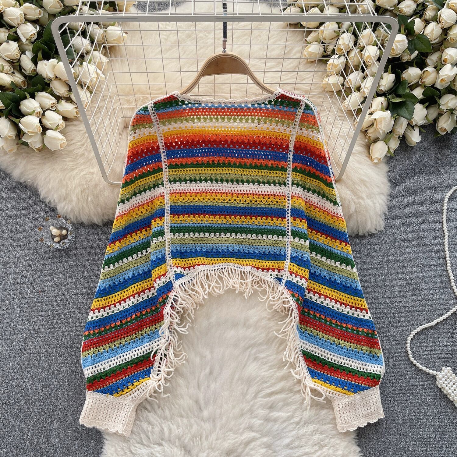 夏の新スタイル怠惰な休日スタイルカラフルなニット中空電話デザイン純粋な欲望ネクタイルーズ長袖トップ女性 ロング サマー 夏物 ピュア lyxaj36120793365