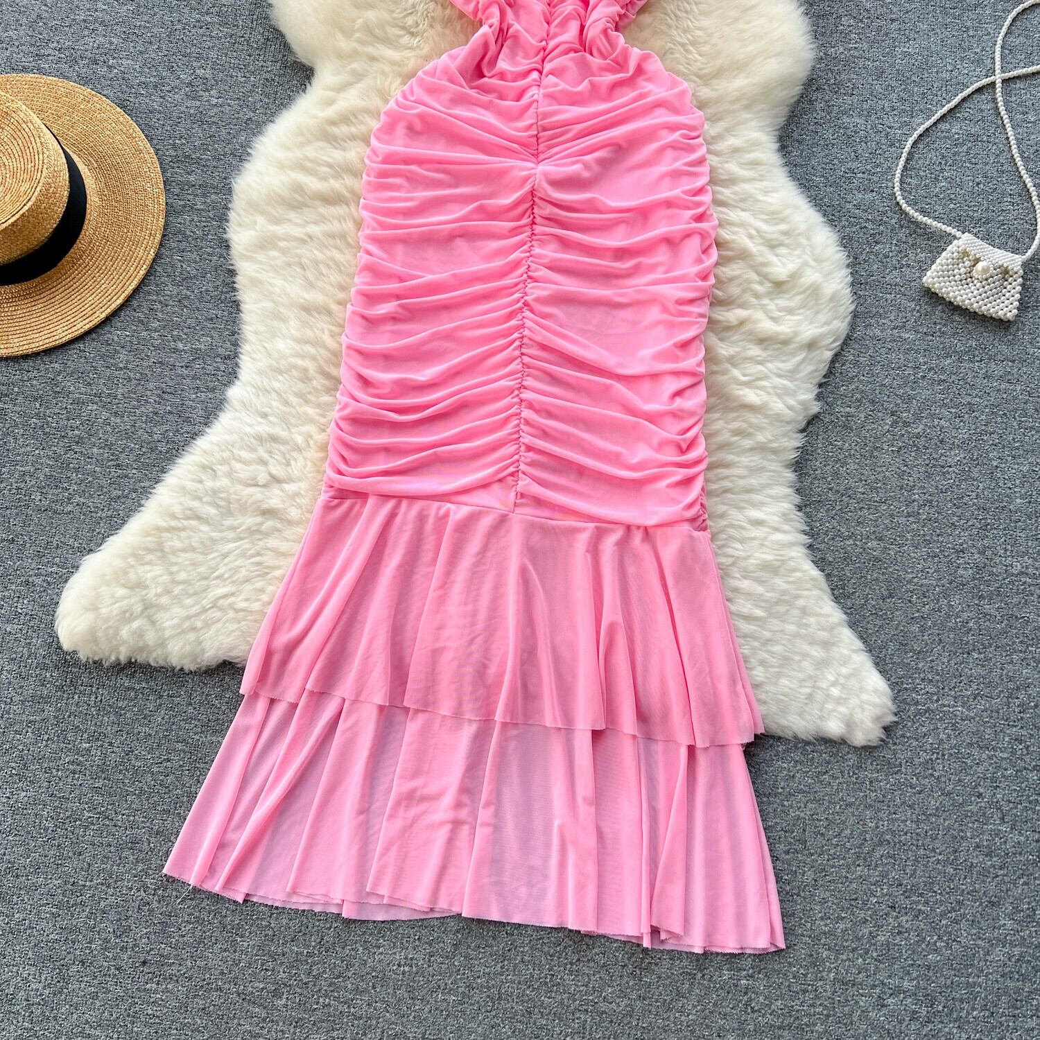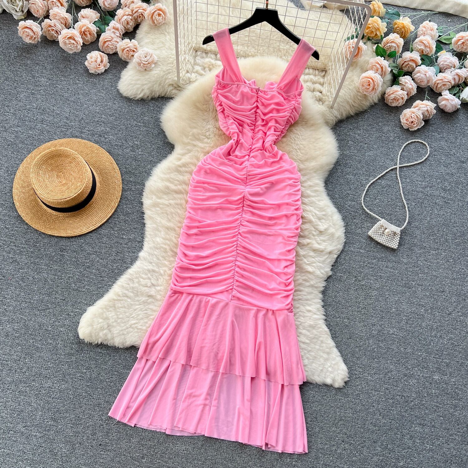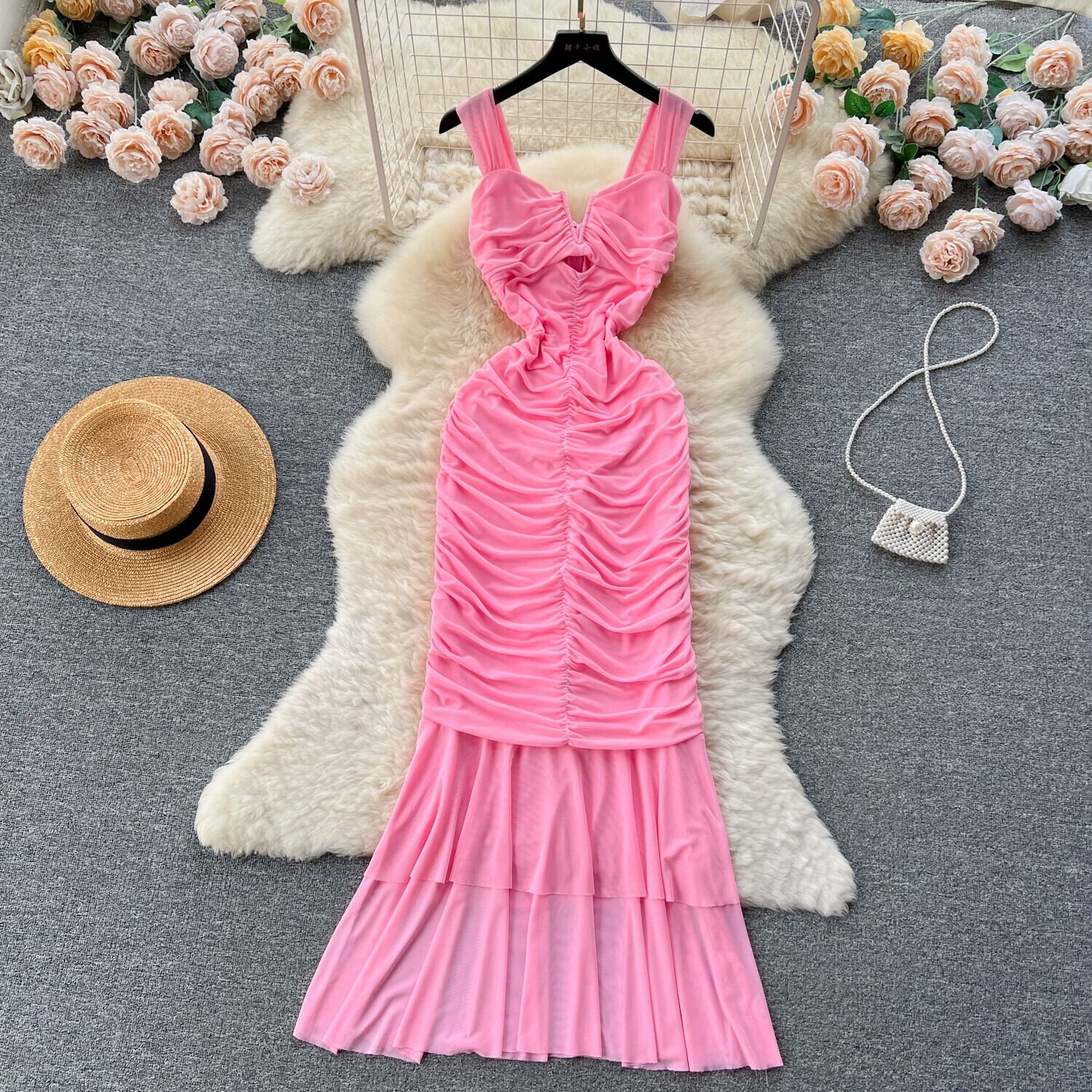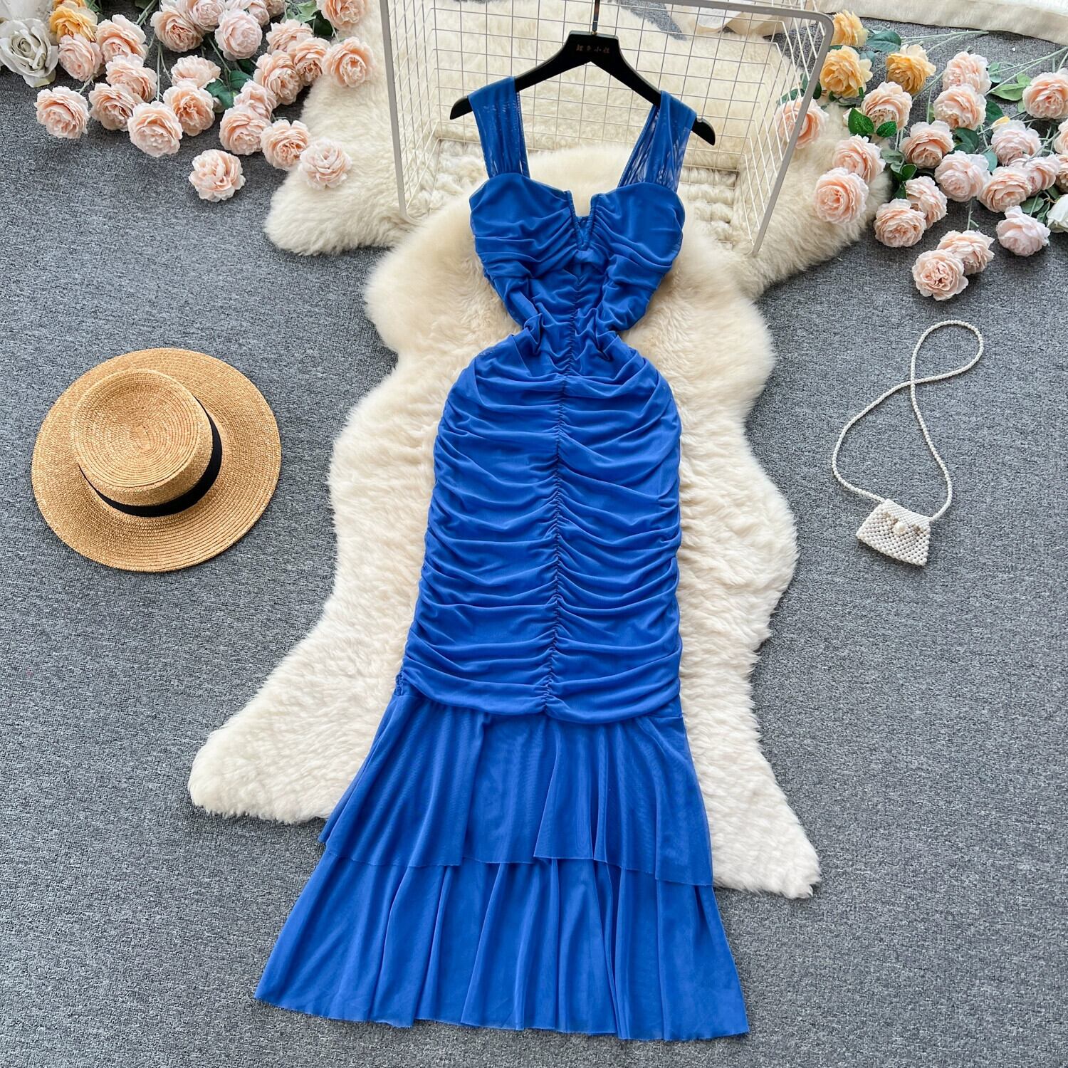 ヨーロッパとアメリカンスタイルのファッションハイエンドプリーツサスペンダードレス女性の夏の痩身宴会フィッシュテールドレスロングスカート サマー 夏物 ヨーロピアン lyxaj89383836875