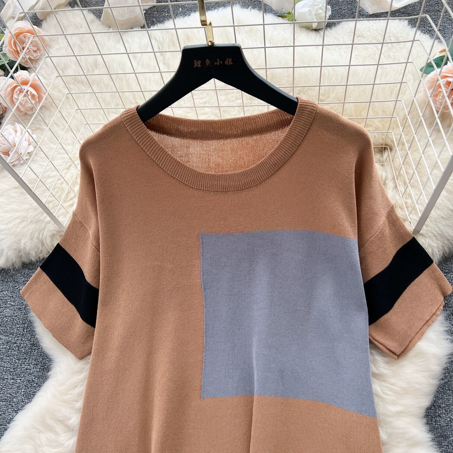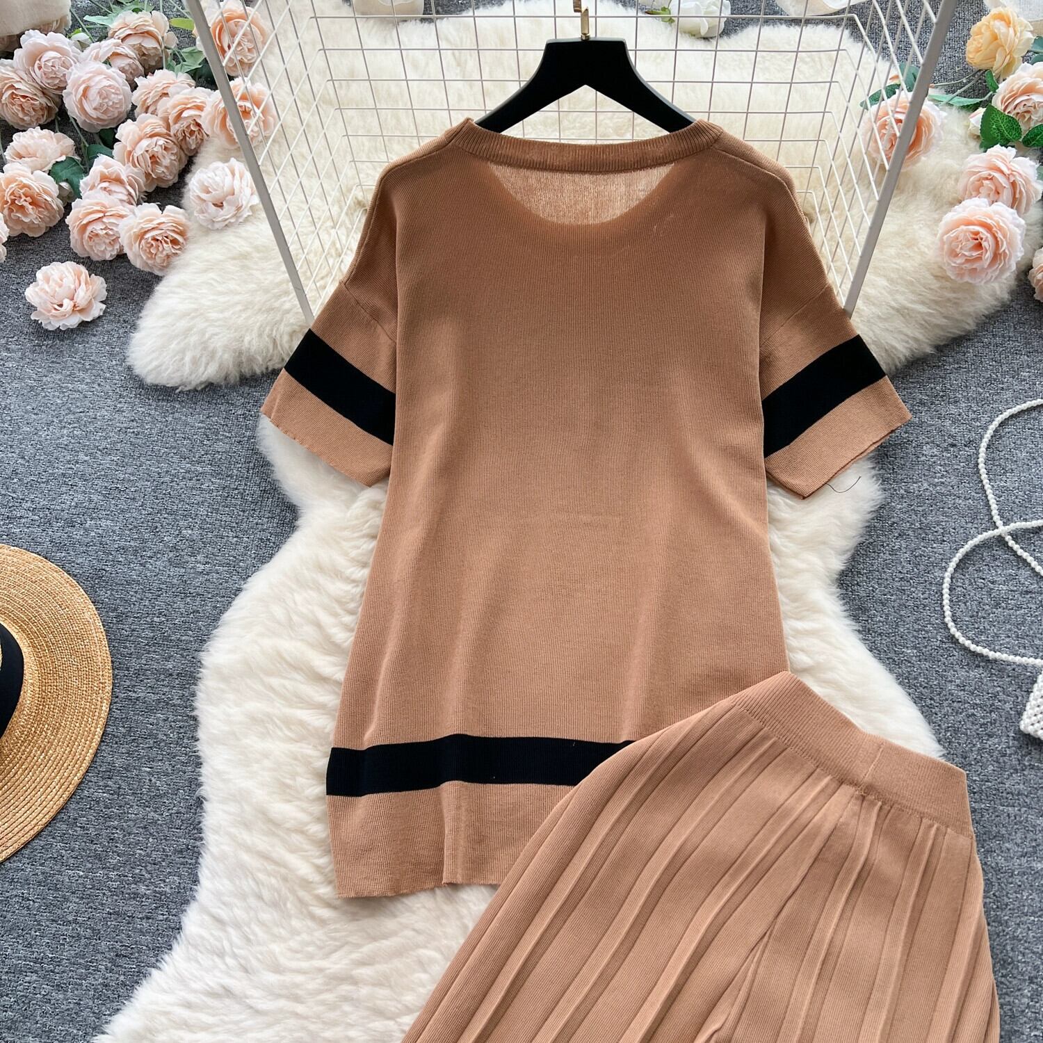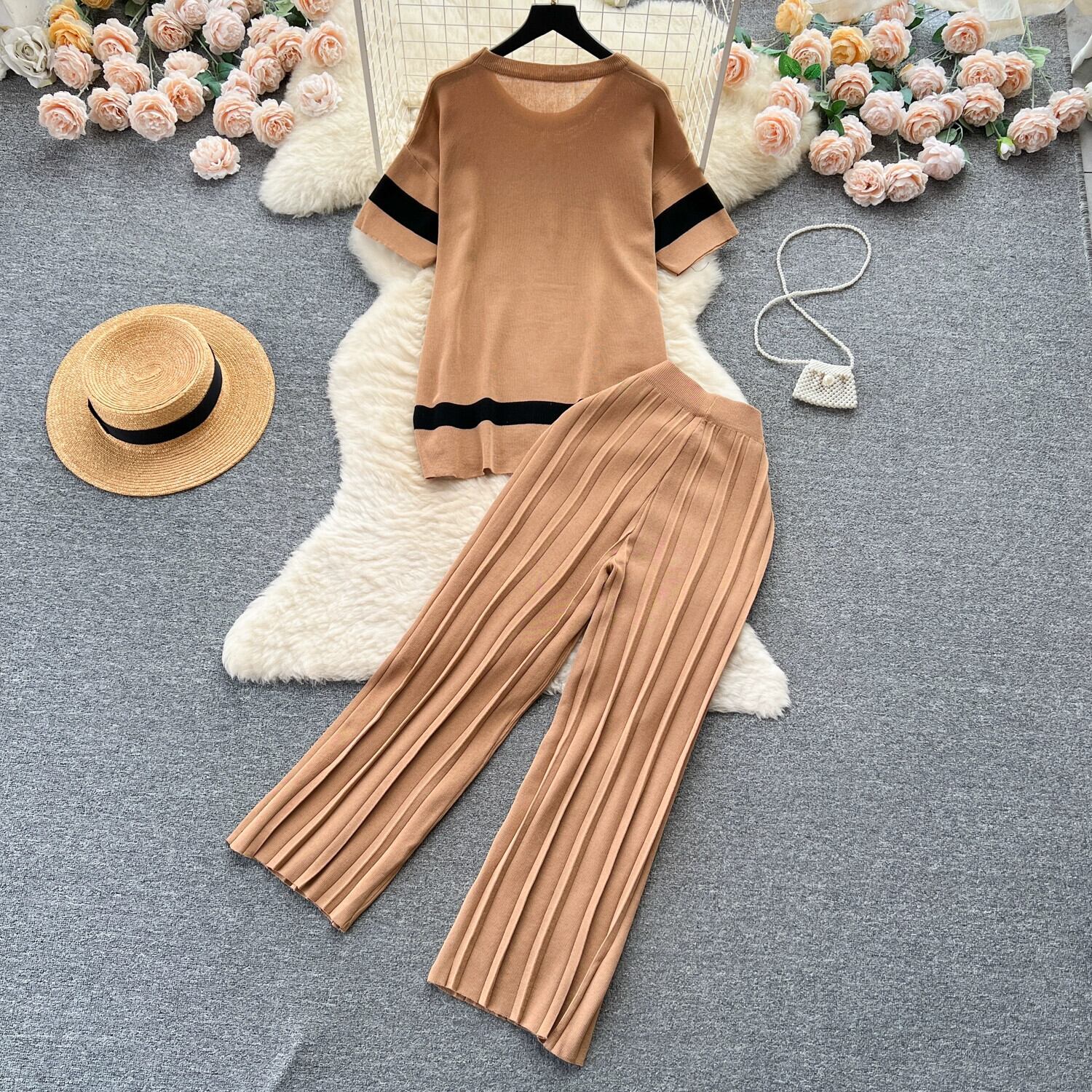 有能カジュアルスーツ女性フレンチレトロライト高級半袖ニットトップツーピースセットハイウエストスリムストレートパンツ lyxaj42839446258