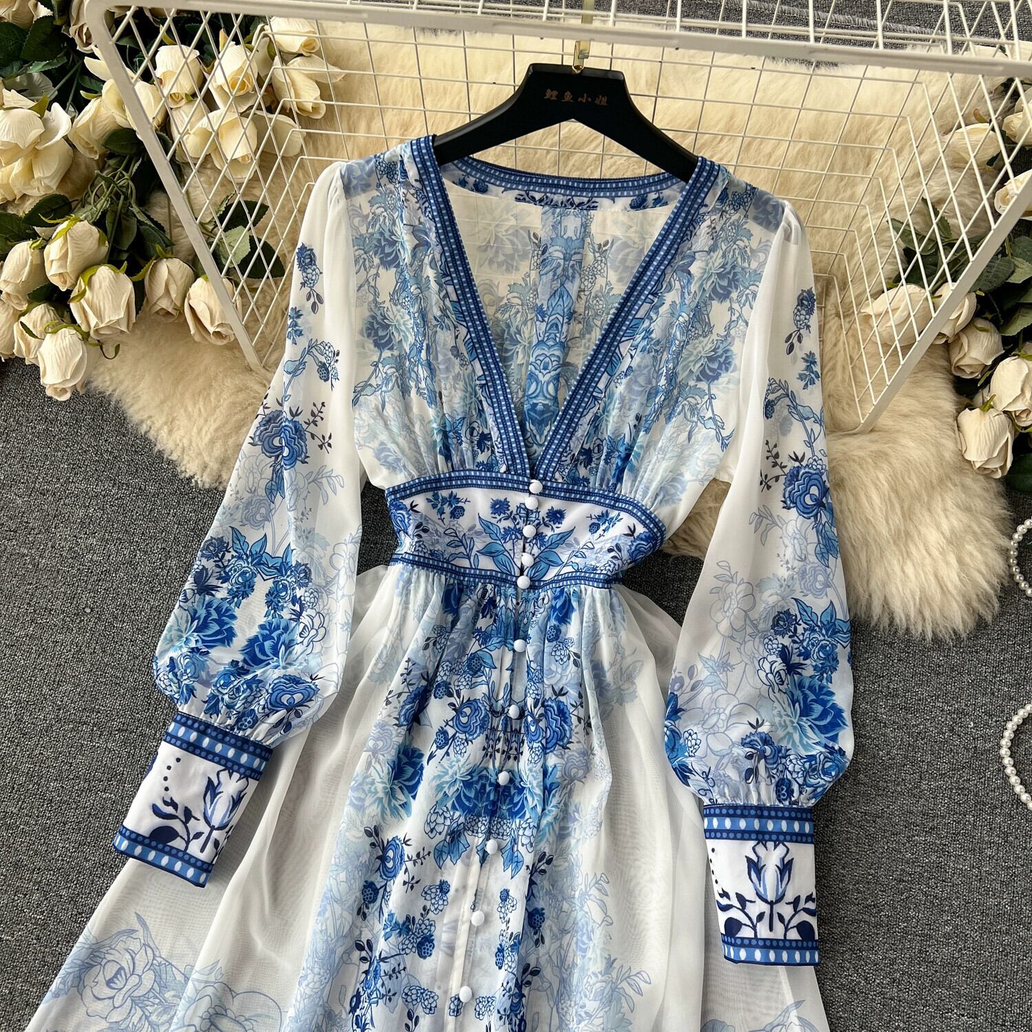 軽くて豪華なレトロな宮殿スタイルのハイエンドのプリント V ネック長袖ドレスの女性は、腰を締める気質と広い裾のシフォン ロング スカートを備えています。 レース Vネック lyxaj39558017854