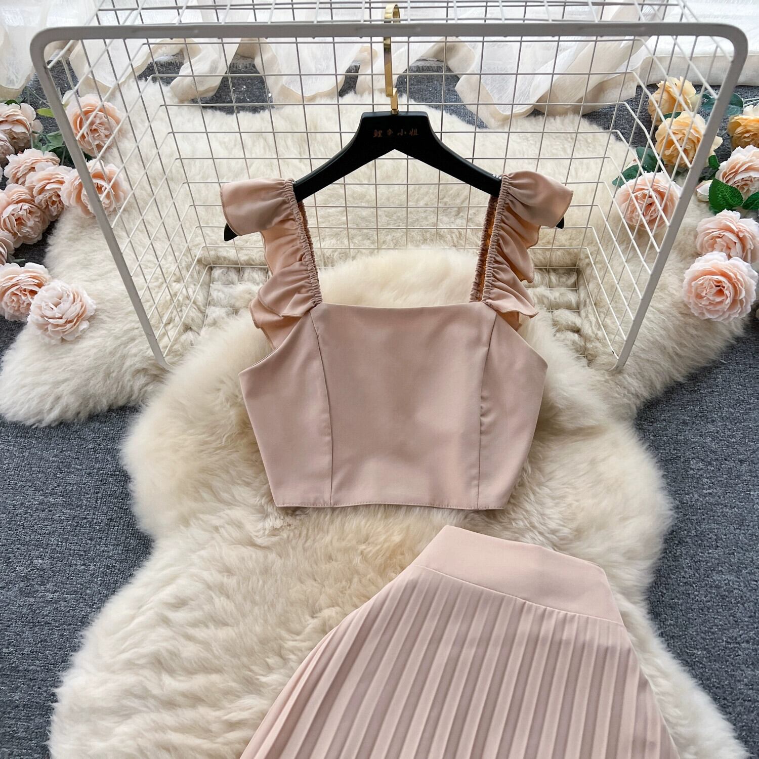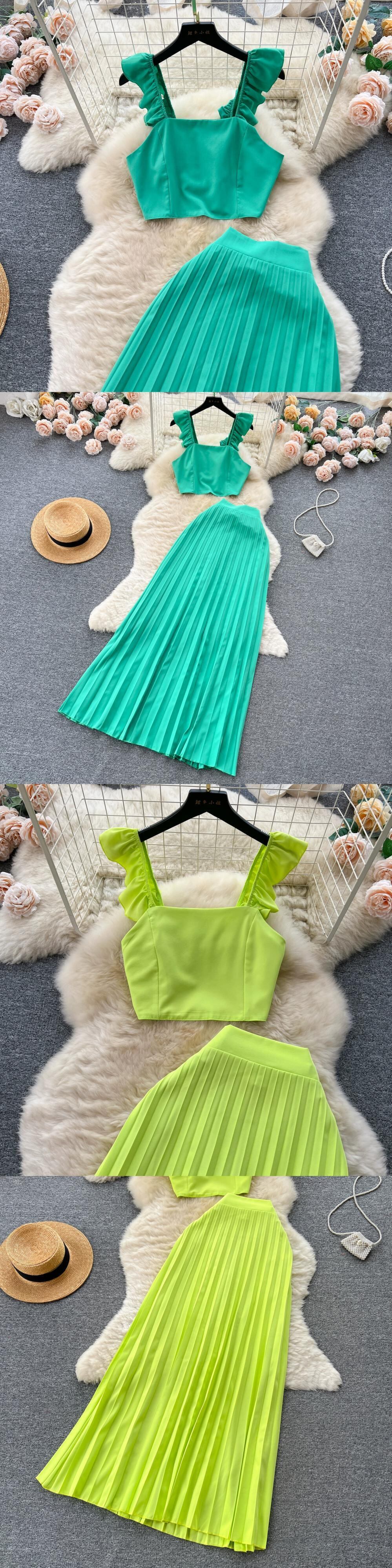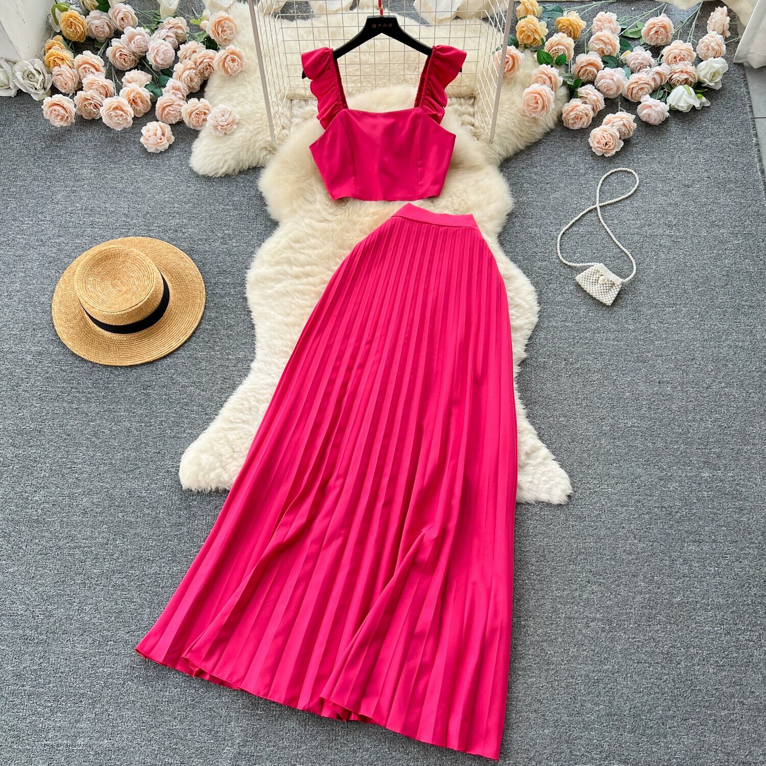 フランスのファッションスーツの女性、耳ストラップ付きショートトップ、ハイウエスト、痩身と気質、プリーツスカート、2点セット ハイウェスト lyxaj41966900878