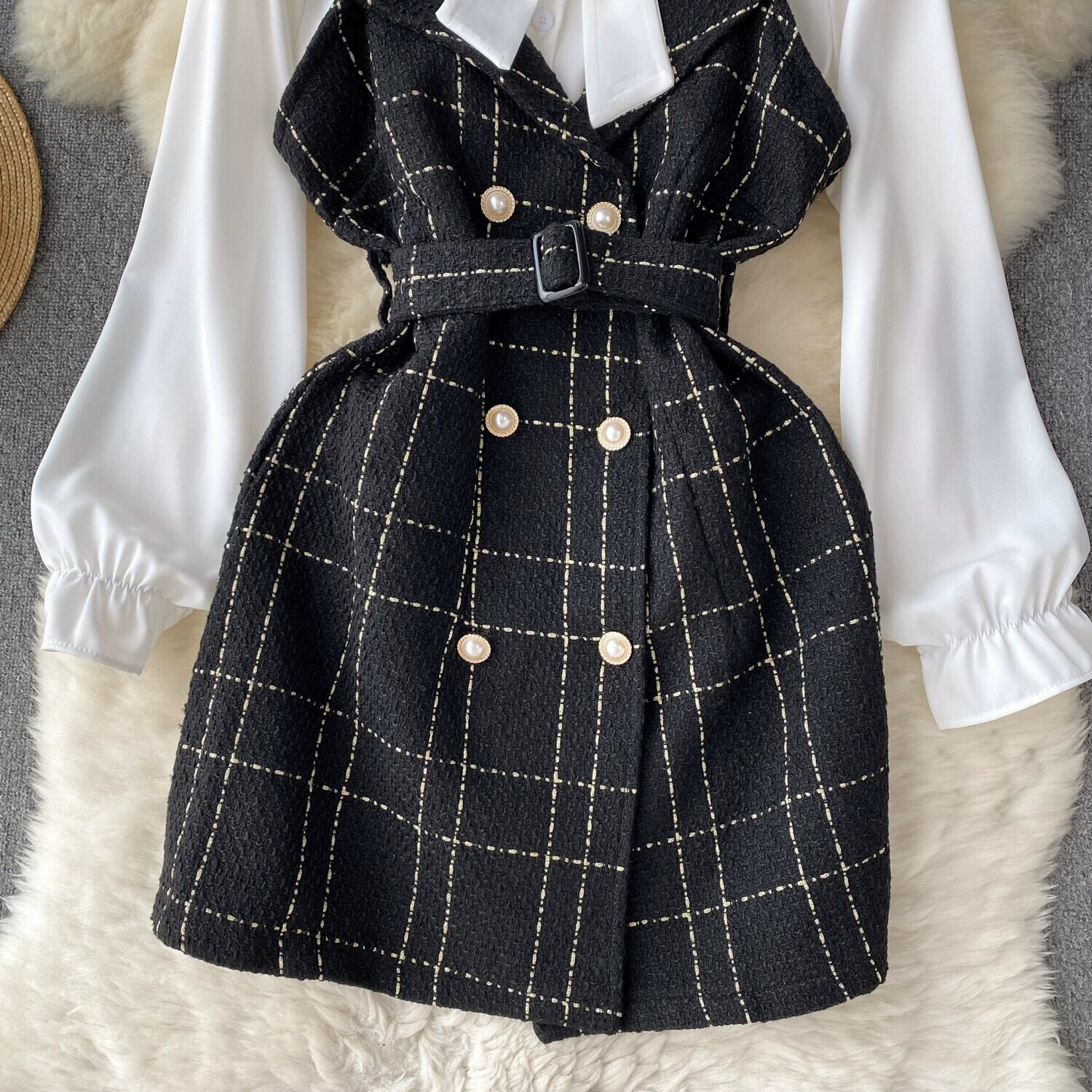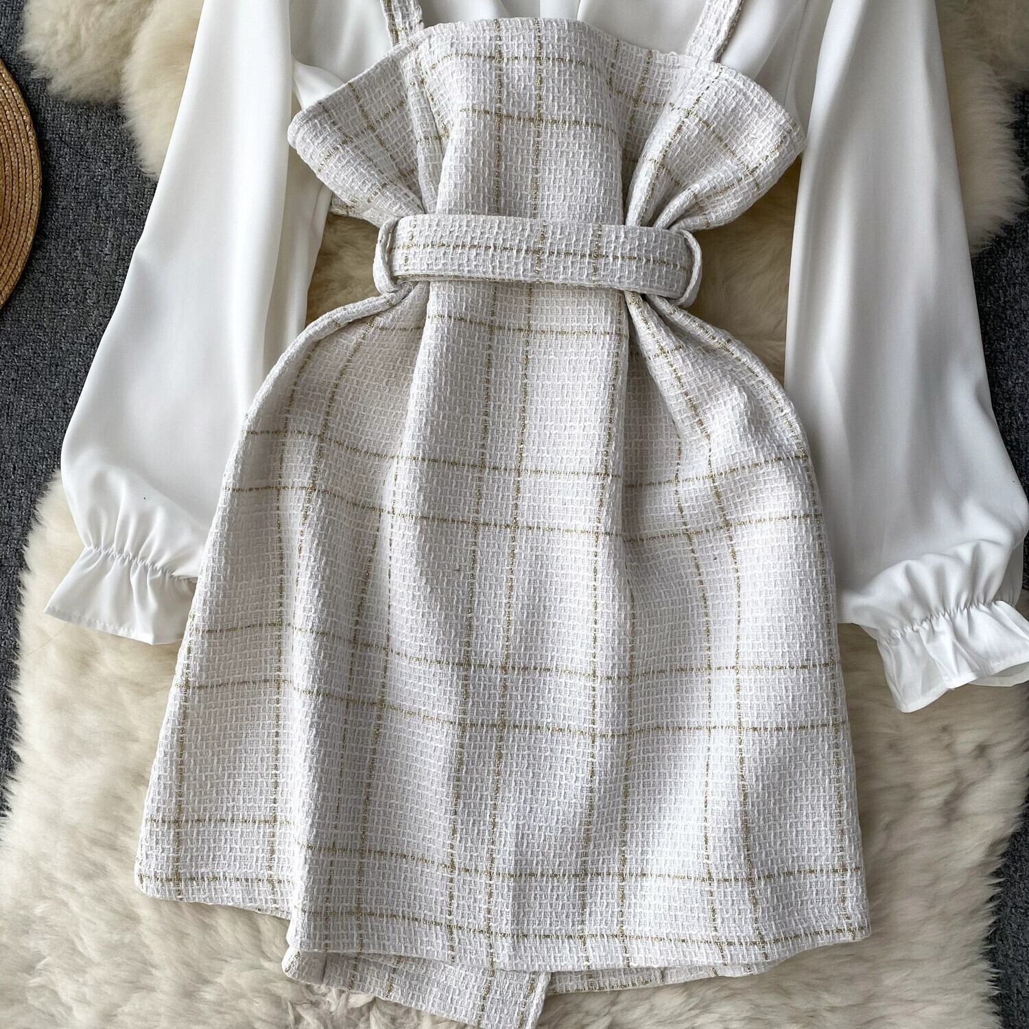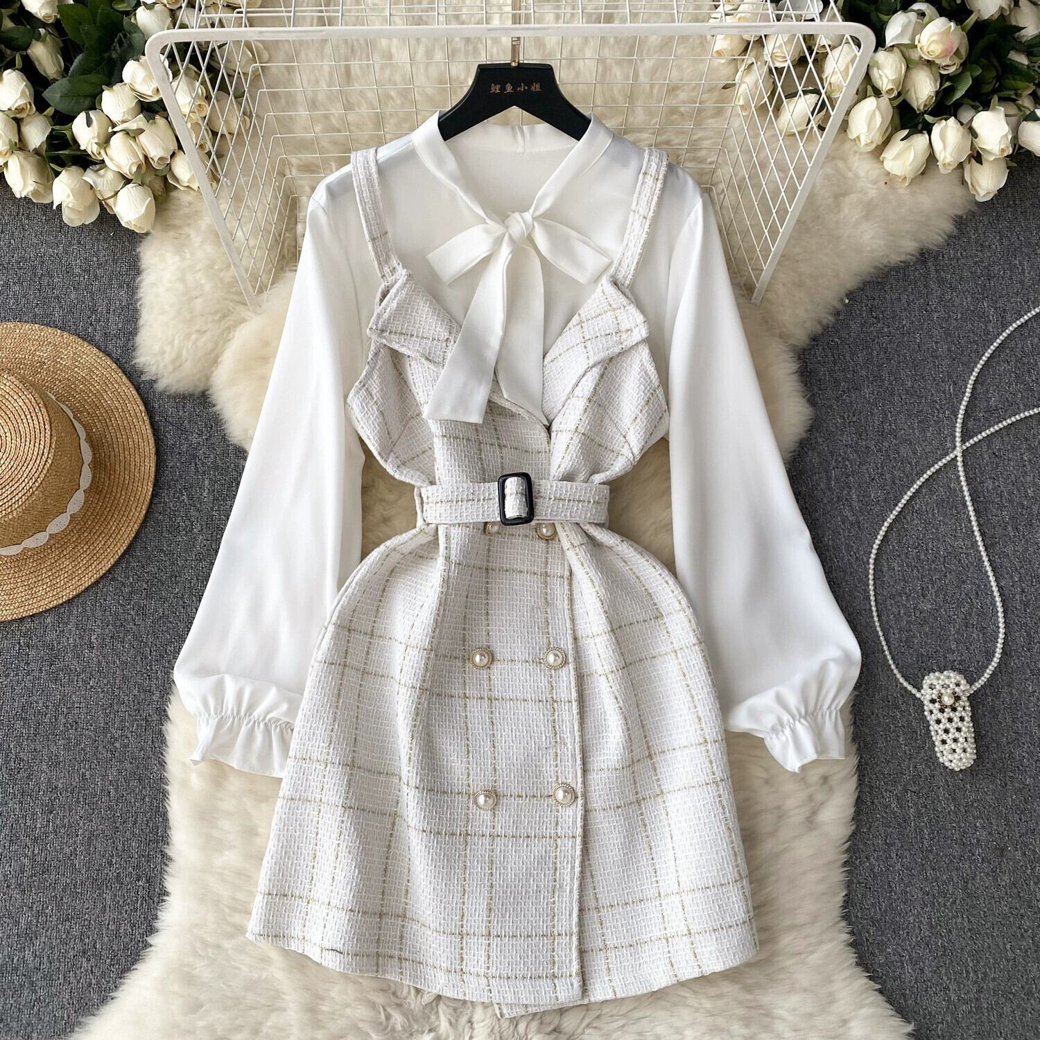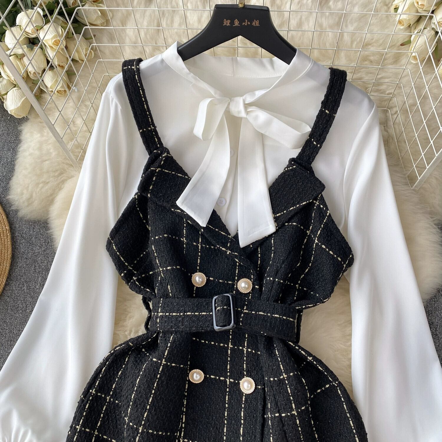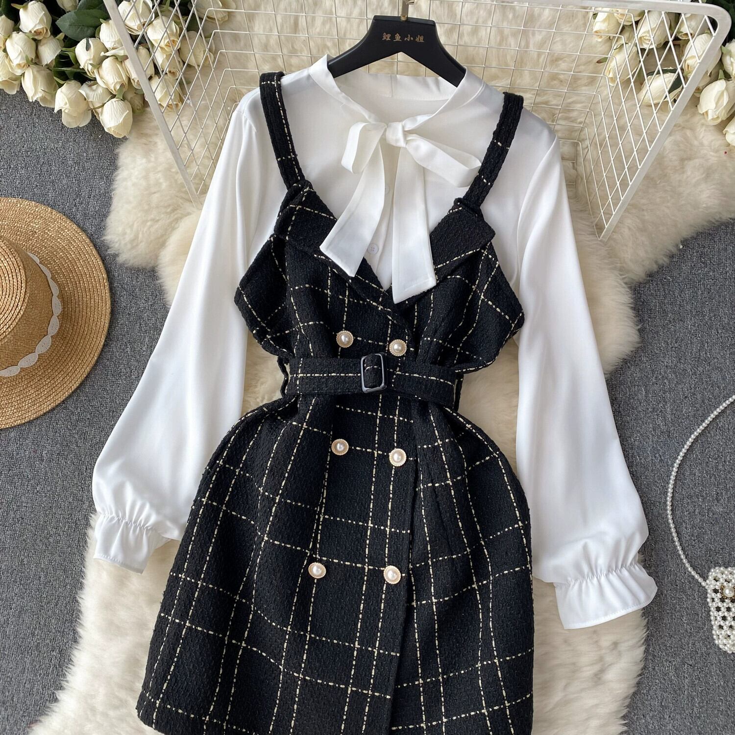 秋のレディスタイルのツーピースドレスの女性、リボンストラップ、チェック柄のデザイン、ニッチな気質のスカート オータム 秋物 lyxaj8154209336