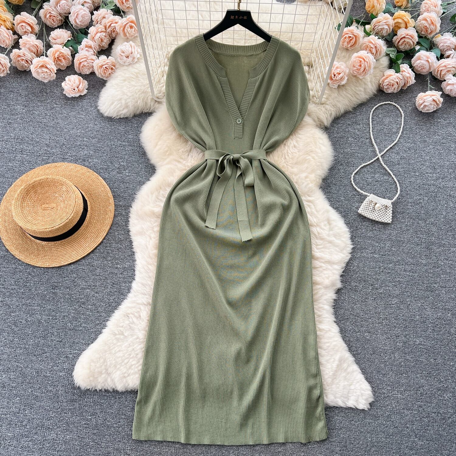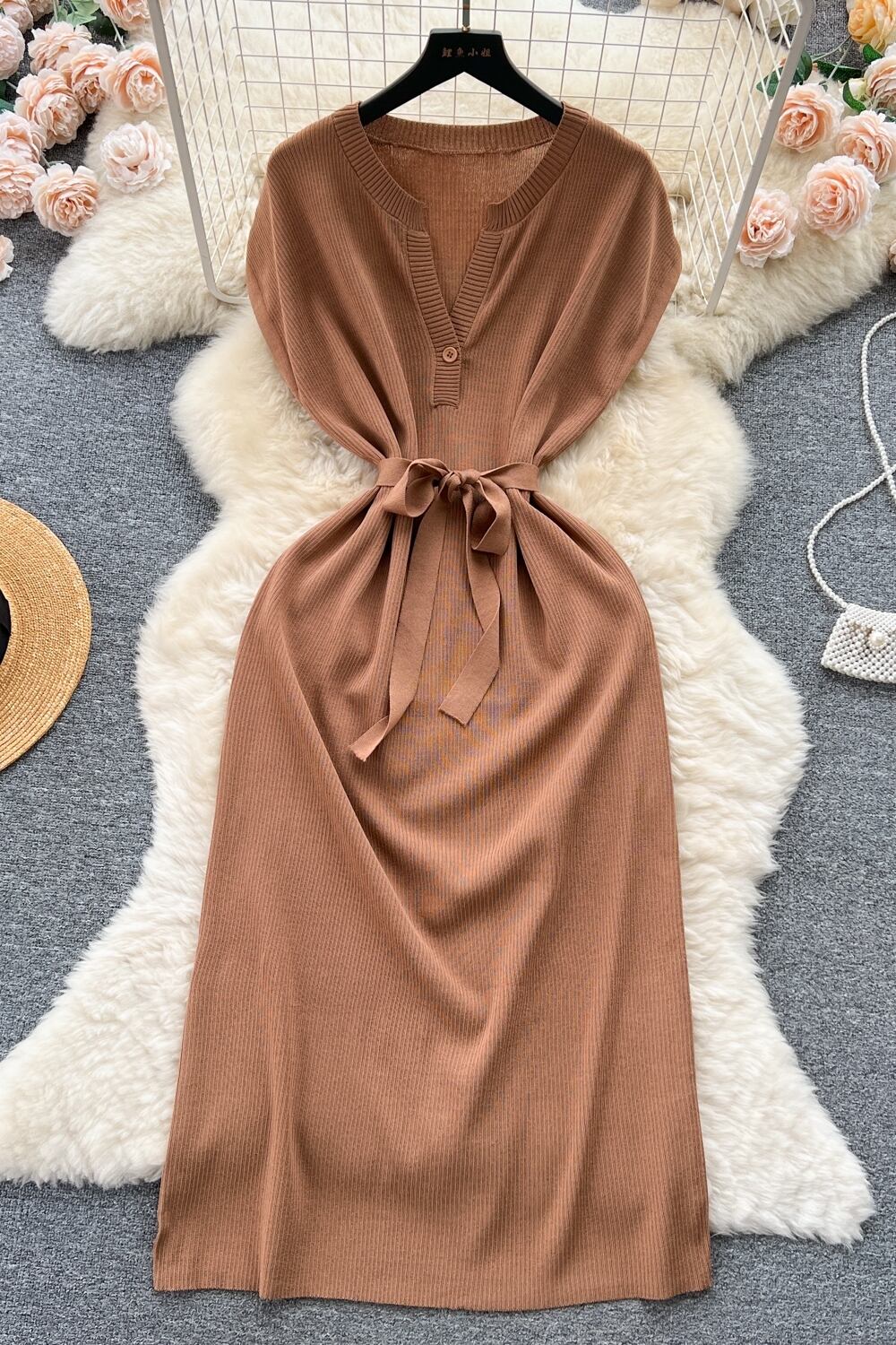 シックな夏の新しい社交家レトロ V ネックノースリーブニットドレス女性のレースアップウエスト痩身 A ラインスカート サマー 夏物 Vネック Aライン lyxaj1362920628
