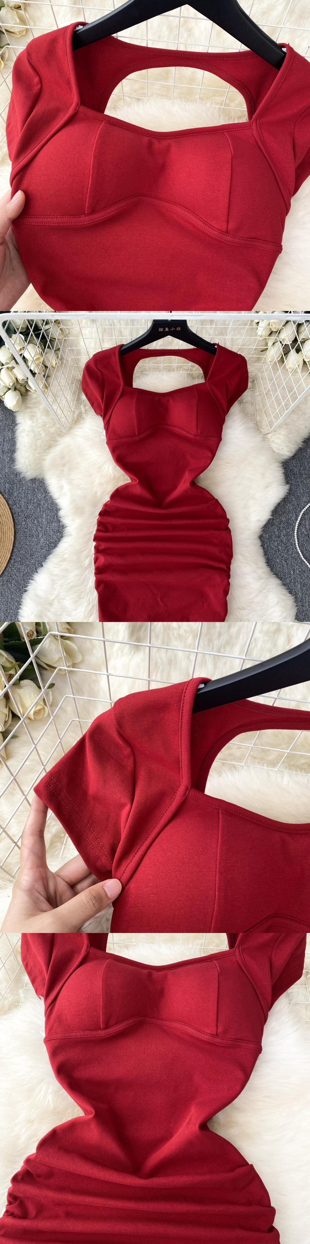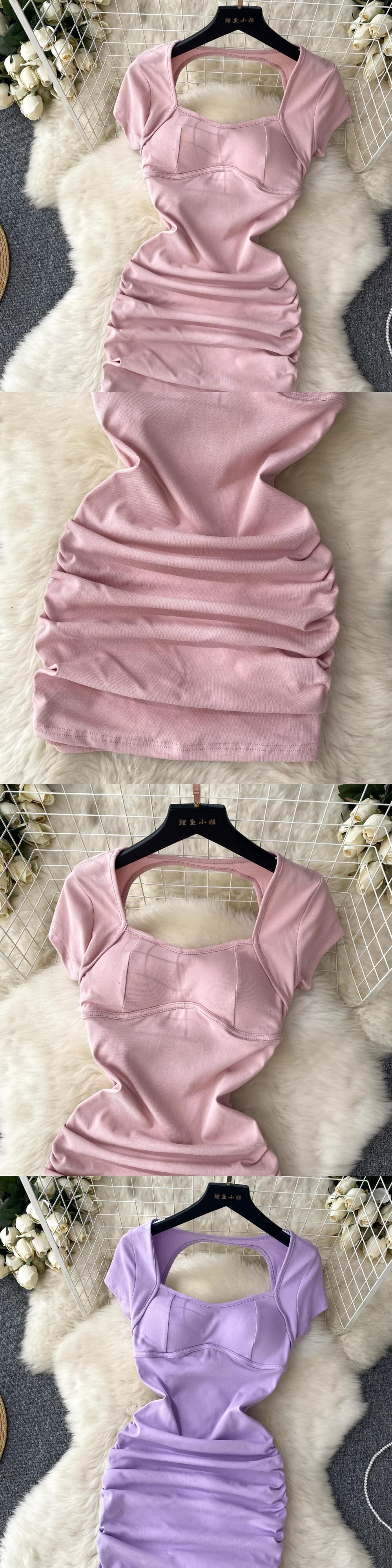ドーパミン純粋な欲望ホットガールスタイルスクエアネック半袖中空バックレスドレス女性のプリーツスリムフィットヒップスカート ショート ハーフスリーブ ピュア スクウェア lyxaj48913765684