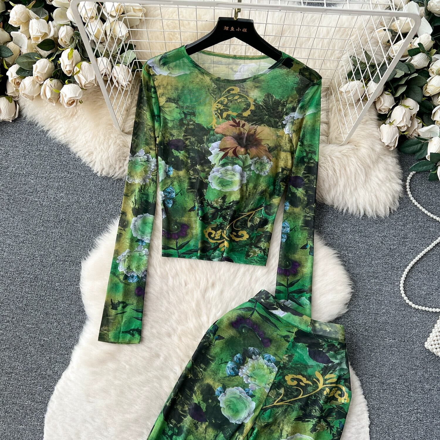 欧米風おしゃれプリント長袖シースルーメッシュTシャツ+ハイウエスト着痩せタイトフィットヒップ抱きパンツの2点セット ロング ヨーロピアン lyxaj68264396034