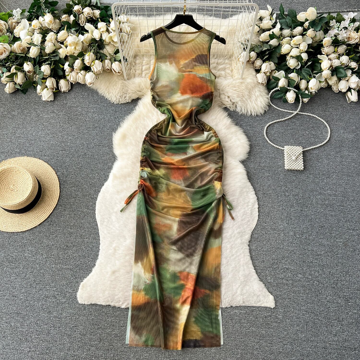 アメリカンニッチラウンドネックノースリーブタイダイプリントスモックレースアップスリムスリムスリットヒップハグドレストレンディ Oネック lyxaj35992186638