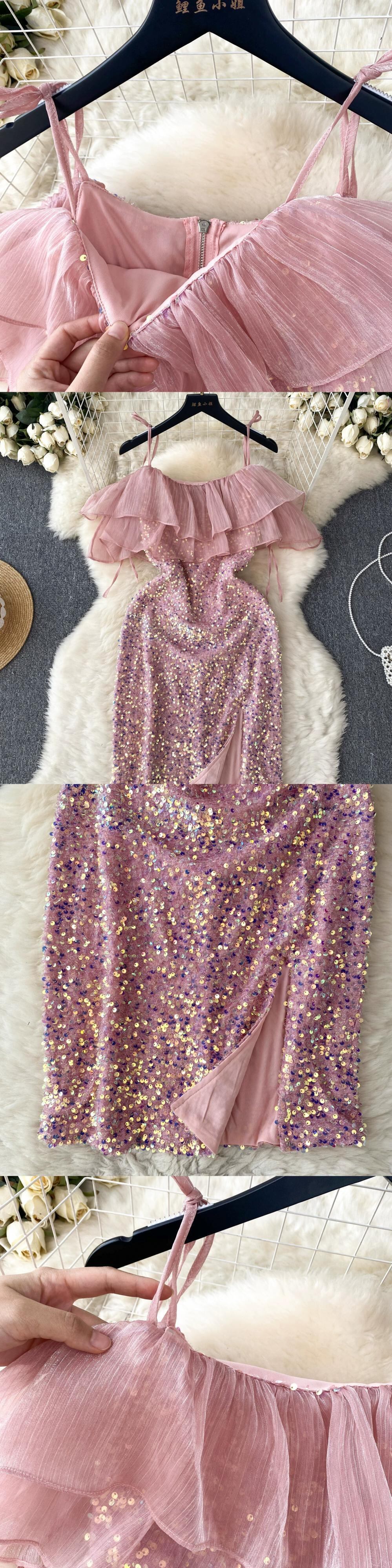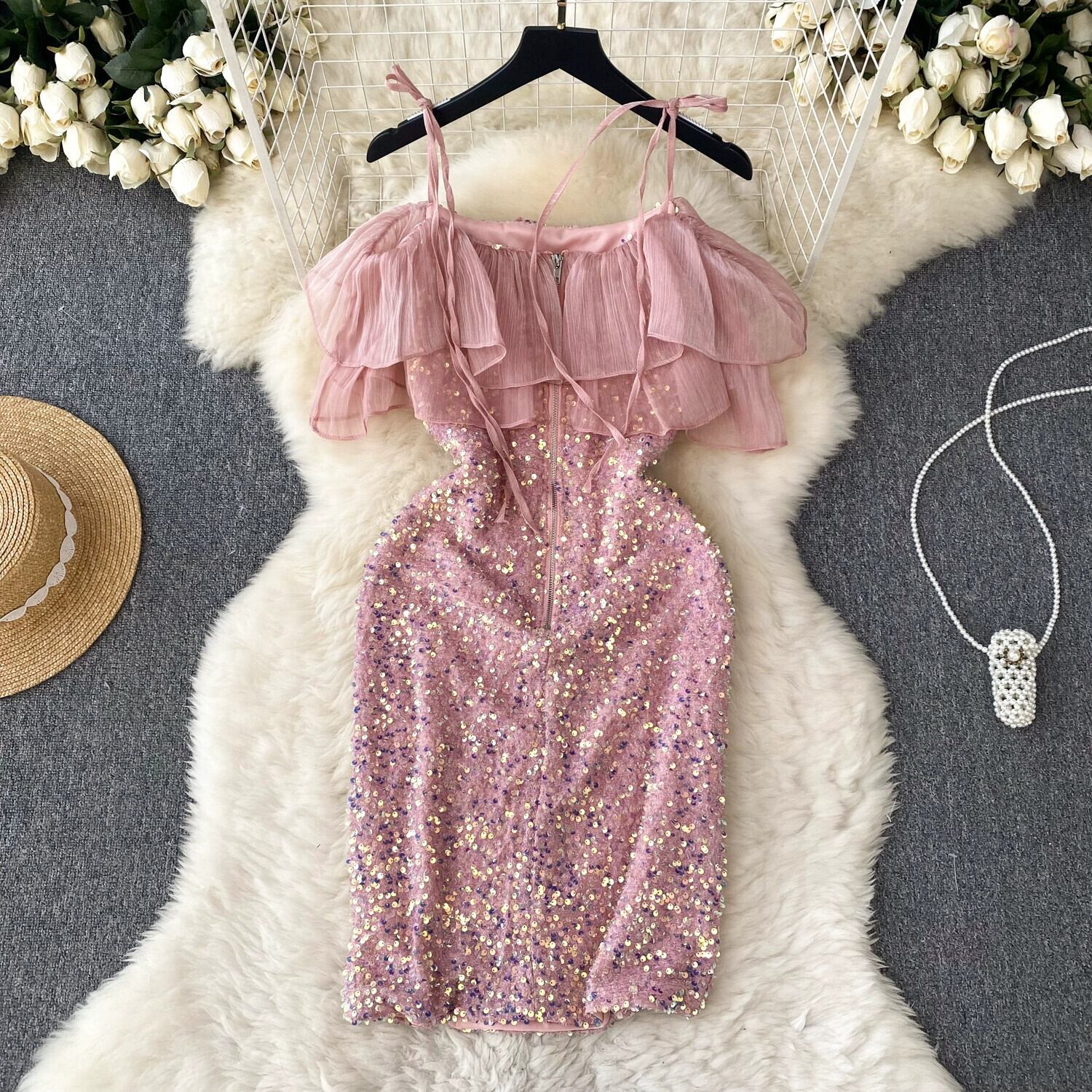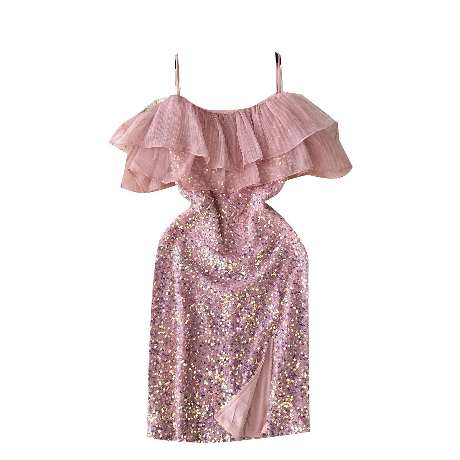 ニッチデザインワンショルダーフリルサスペンダースパンコールドレス女性社交家スタイルウエスト痩身ドレススカート lyxaj72840345641