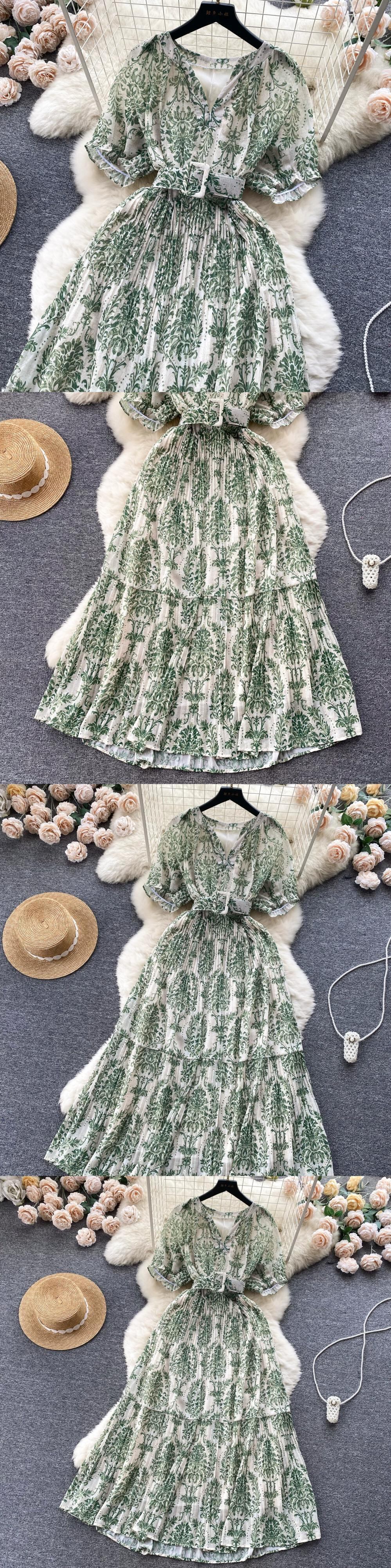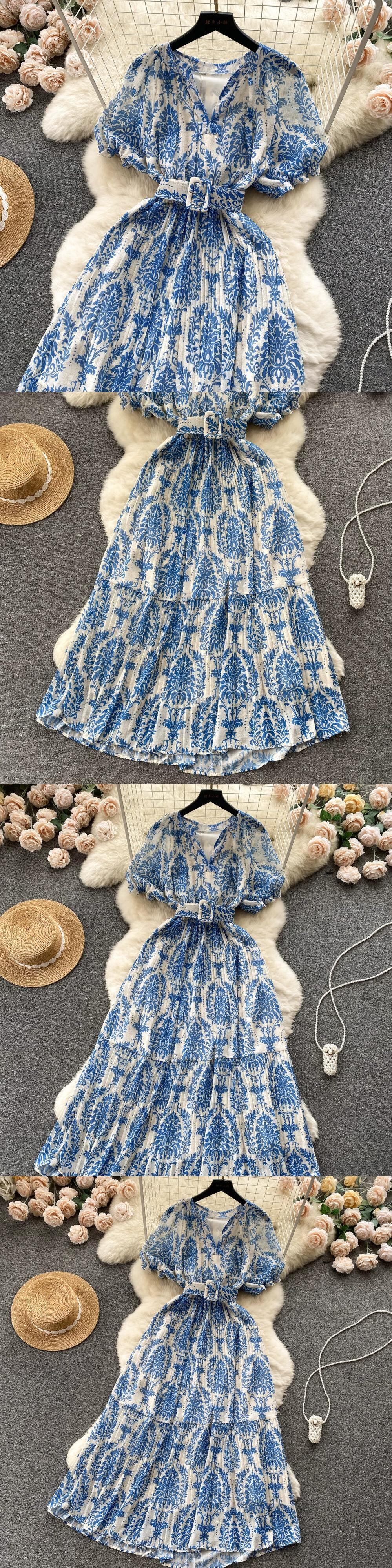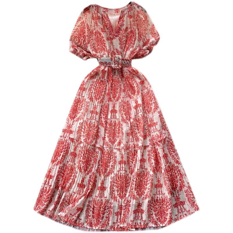 夏の花シフォンパフスリーブドレス女性のフレンチウエスト痩身気質スーパー妖精ホリデービーチドレス サマー 夏物 花柄 lyxaj894823222