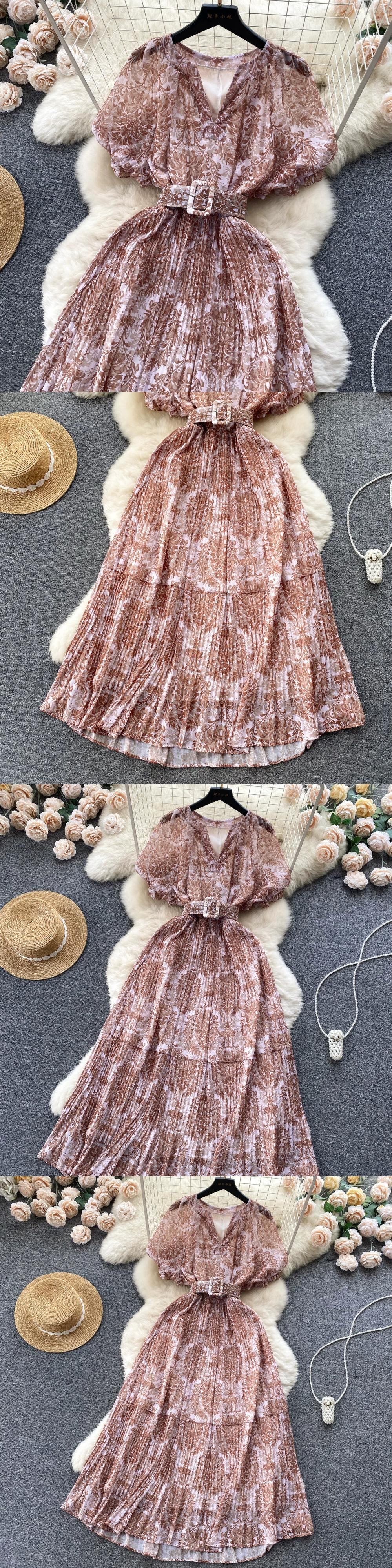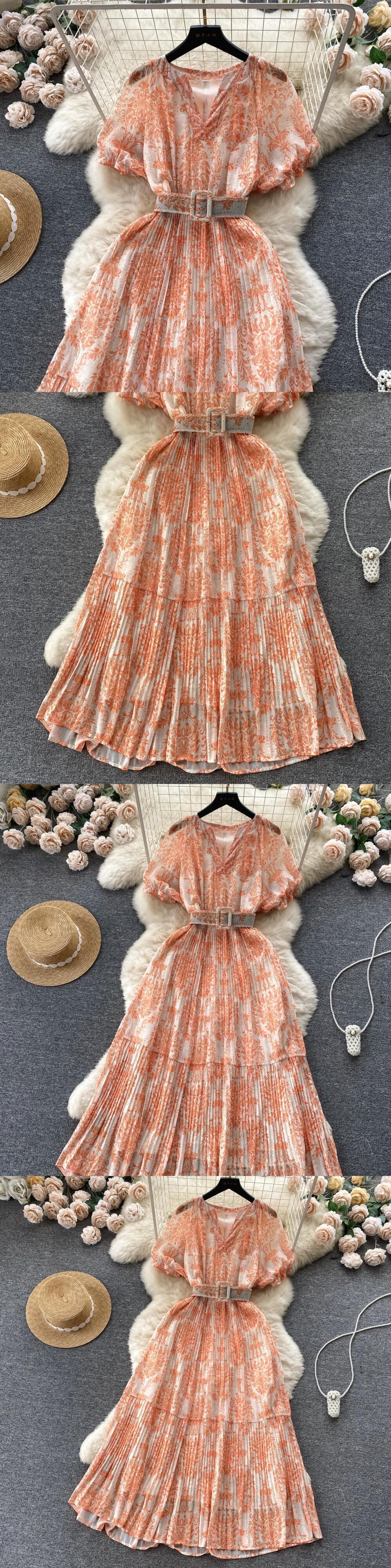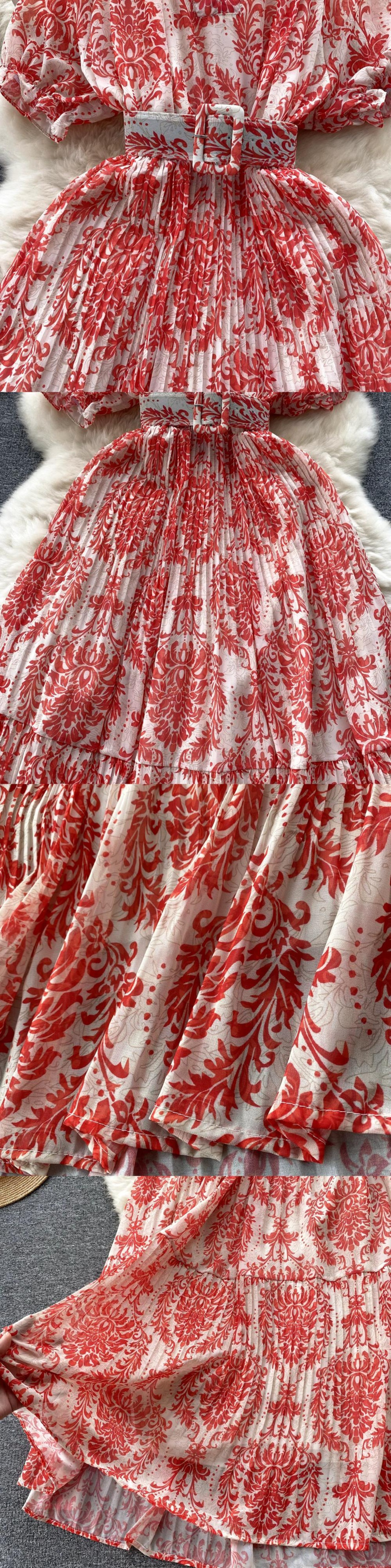 夏の花シフォンパフスリーブドレス女性のフレンチウエスト痩身気質スーパー妖精ホリデービーチドレス サマー 夏物 花柄 lyxaj894823222