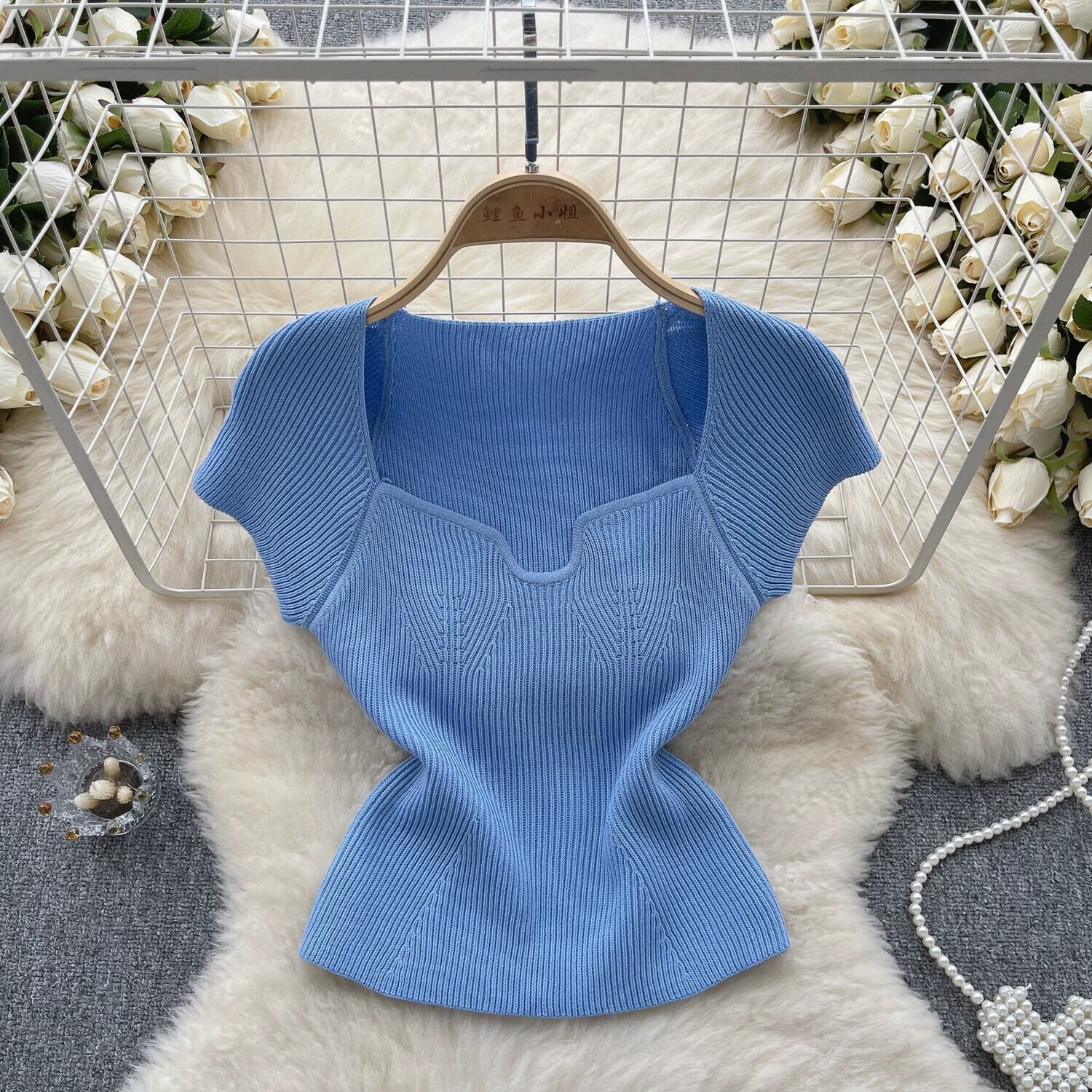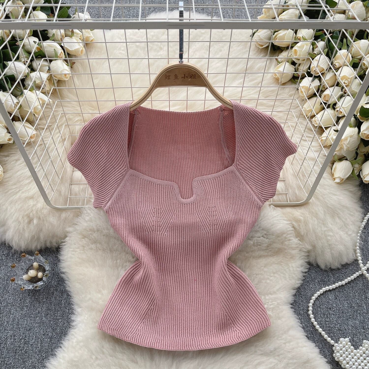 ライト高級レディスタイル無地ニットスクエアネック半袖 Tシャツ女性夏タイトフィットハイエンドニッチ痩身トップトレンド サマー 夏物 ソリッドカラー スクウェア lyxaj84897091266