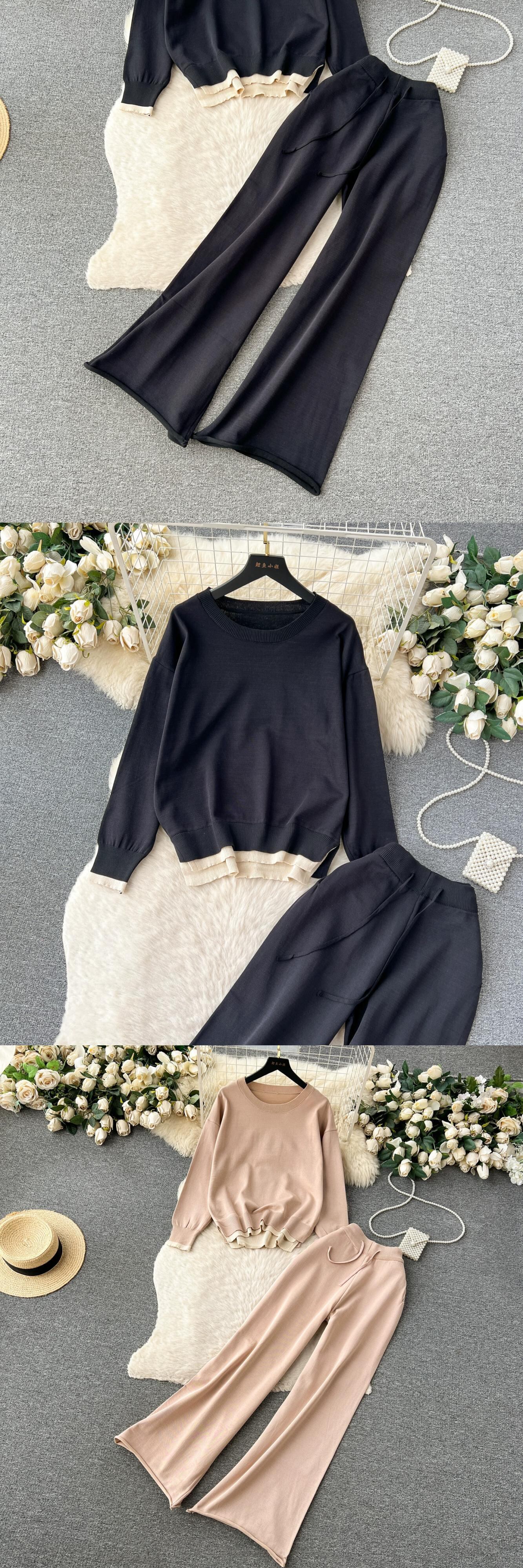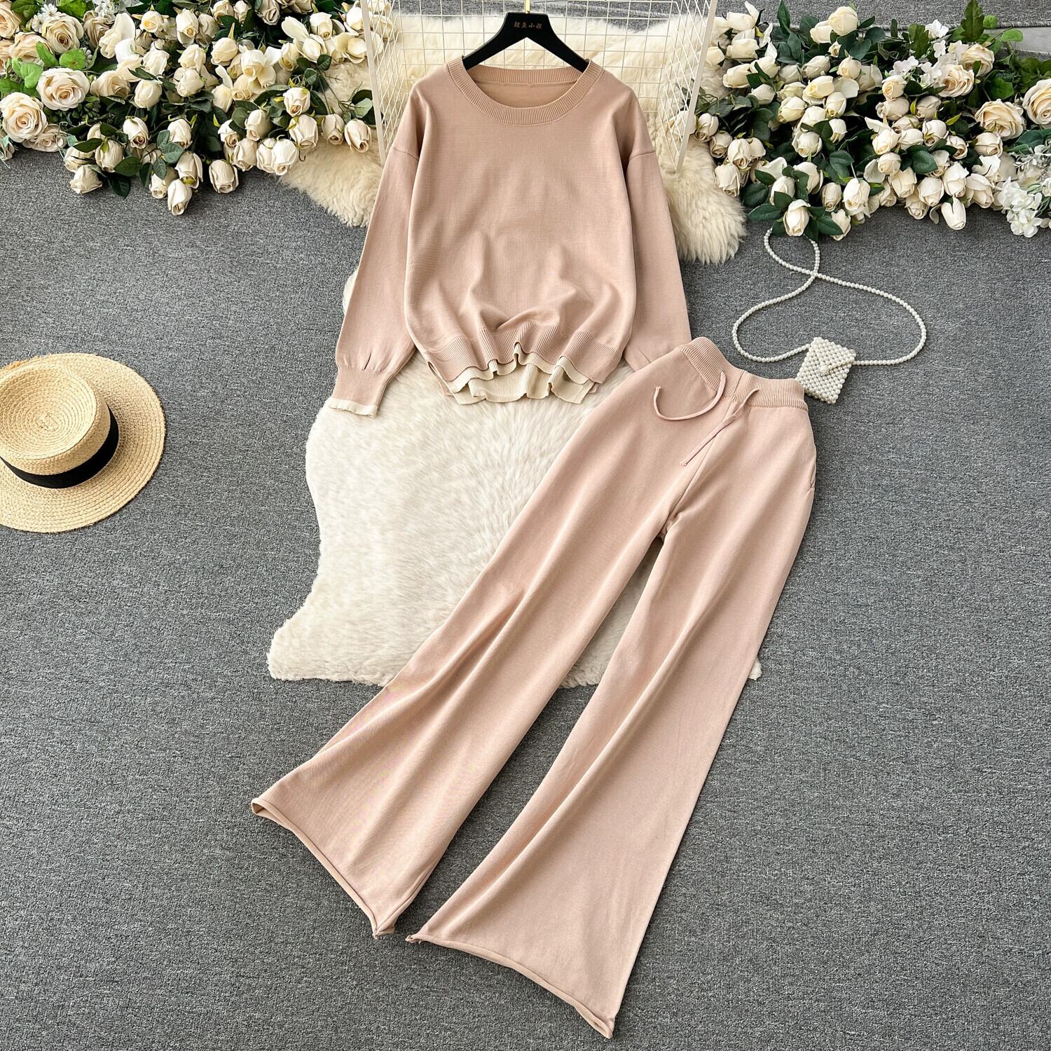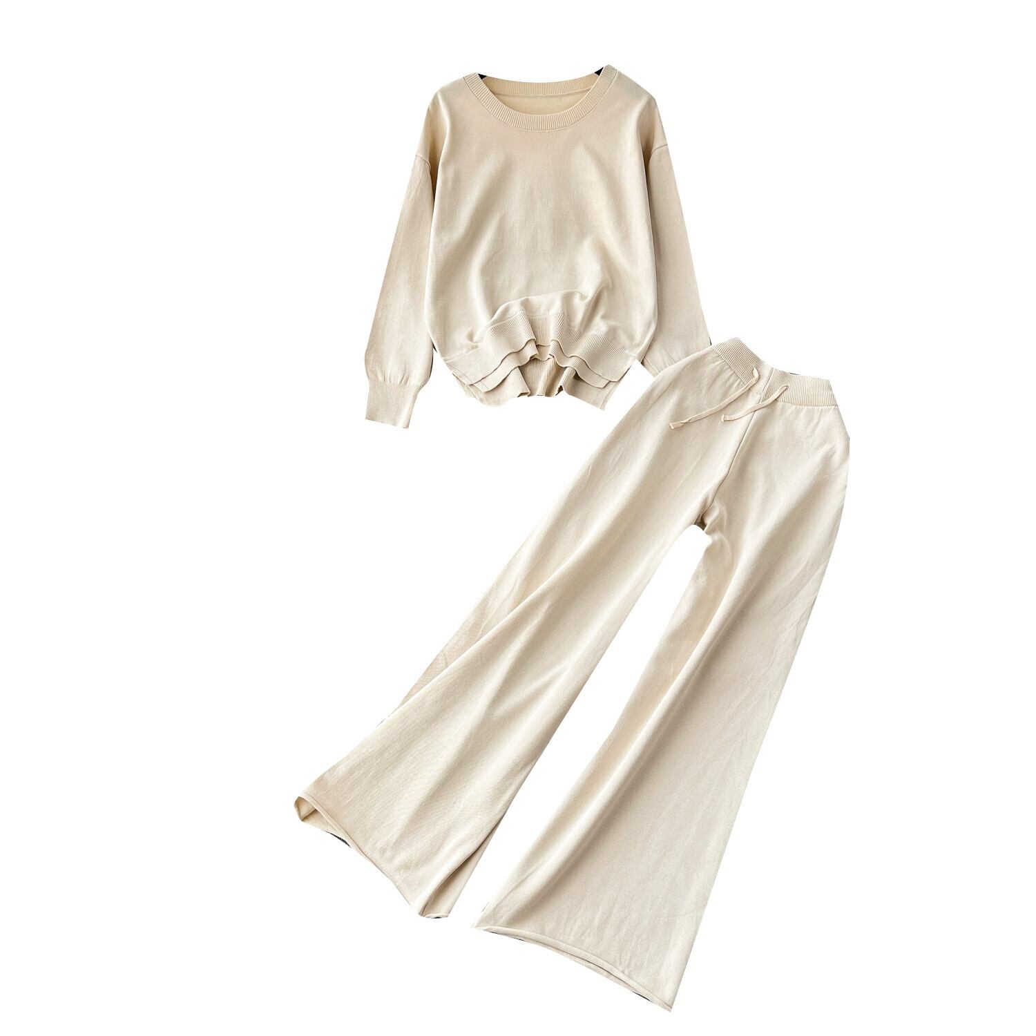 スタイルカジュアルレトロラウンドネック長袖セータートップス女性のツーピースセットファッショナブルなルーズハイウエストワイドレッグパンツ ロング Oネック lyxaj569963459