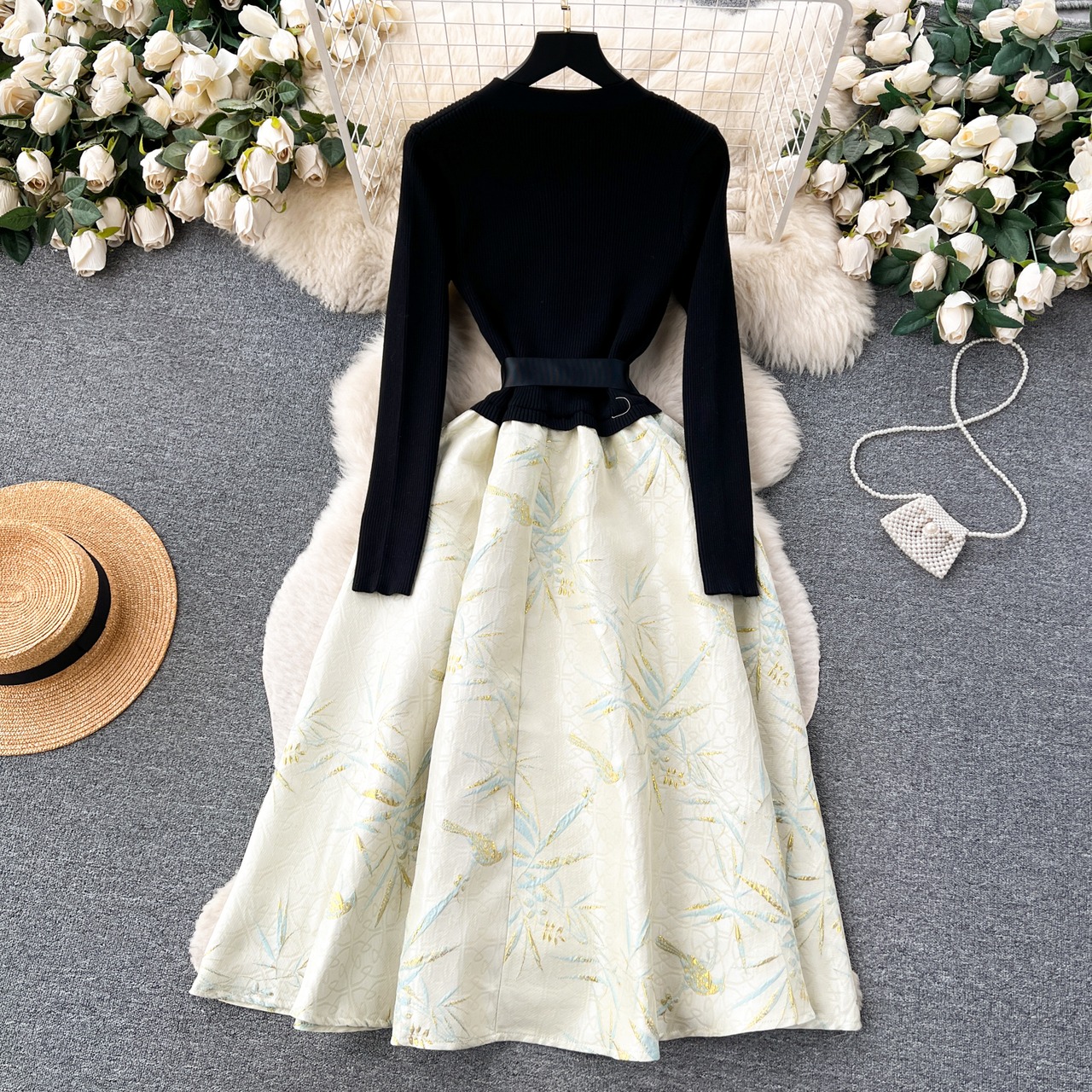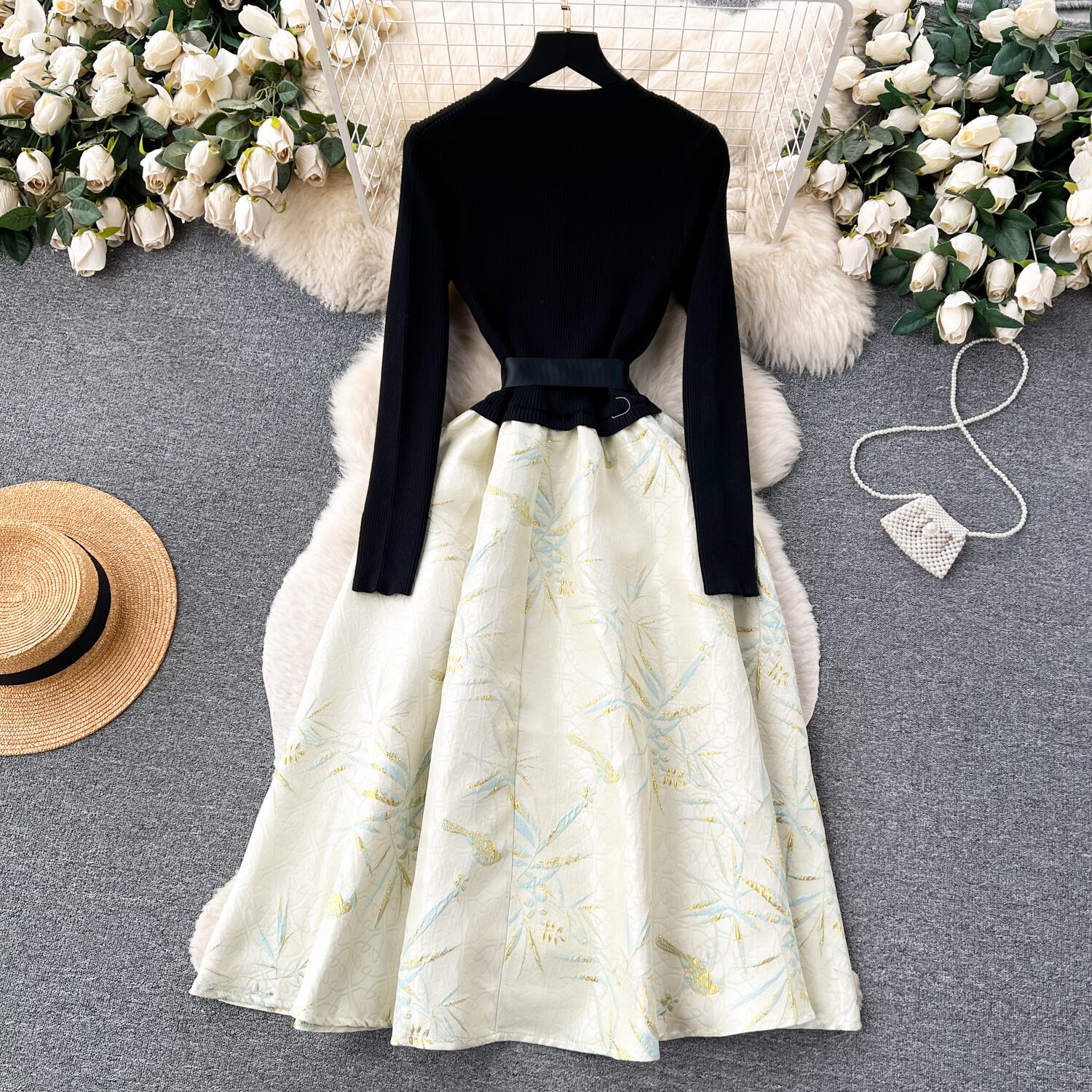 フランスのハイエンドヘボンスタイルライト高級ドレスの女性の秋と冬のニットスプライシングジャカードふわふわドレス オータム 秋物 ウィンター 冬物 lyxaj70097019349