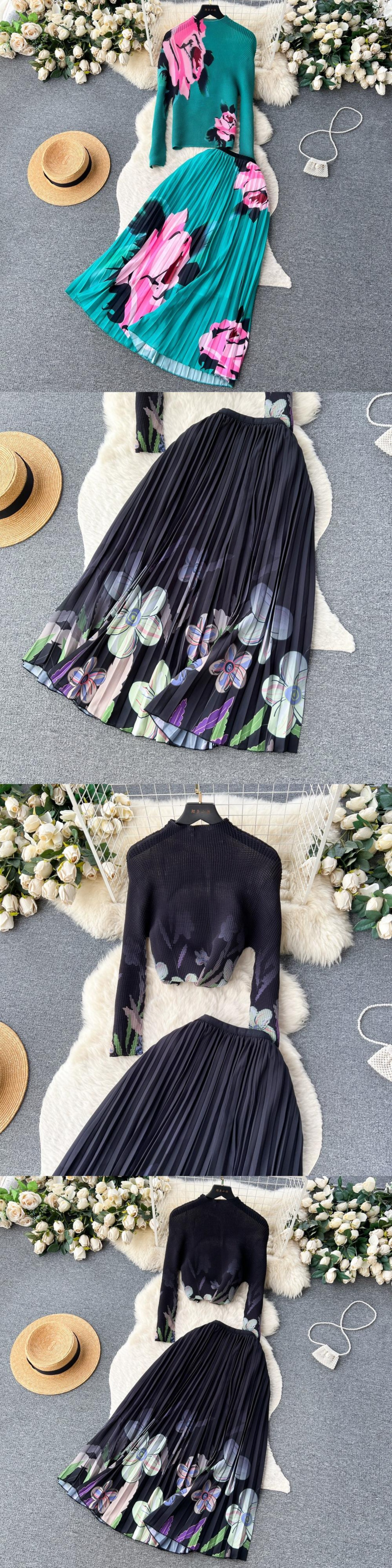ヨーロッパとアメリカのスタイルのホリデースタイルのプリントスーツの女性、伸縮性のあるスリムプリーツトップ、ハイウエストプリーツスカート、2点セット ハイウェスト エラスティック ヨーロピアン lyxaj69732089805