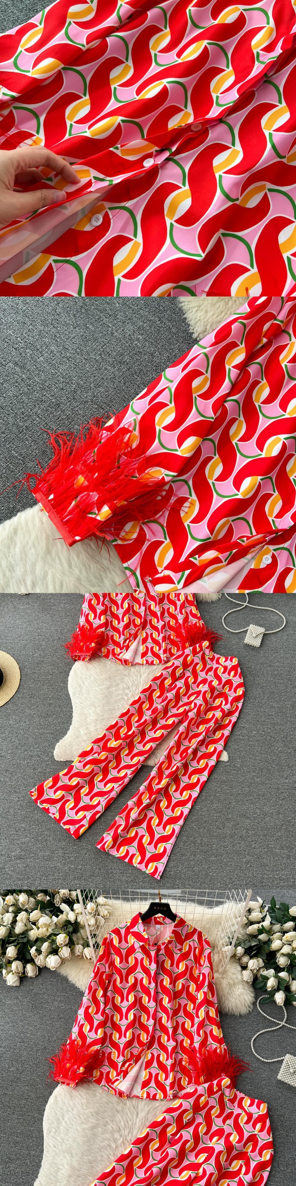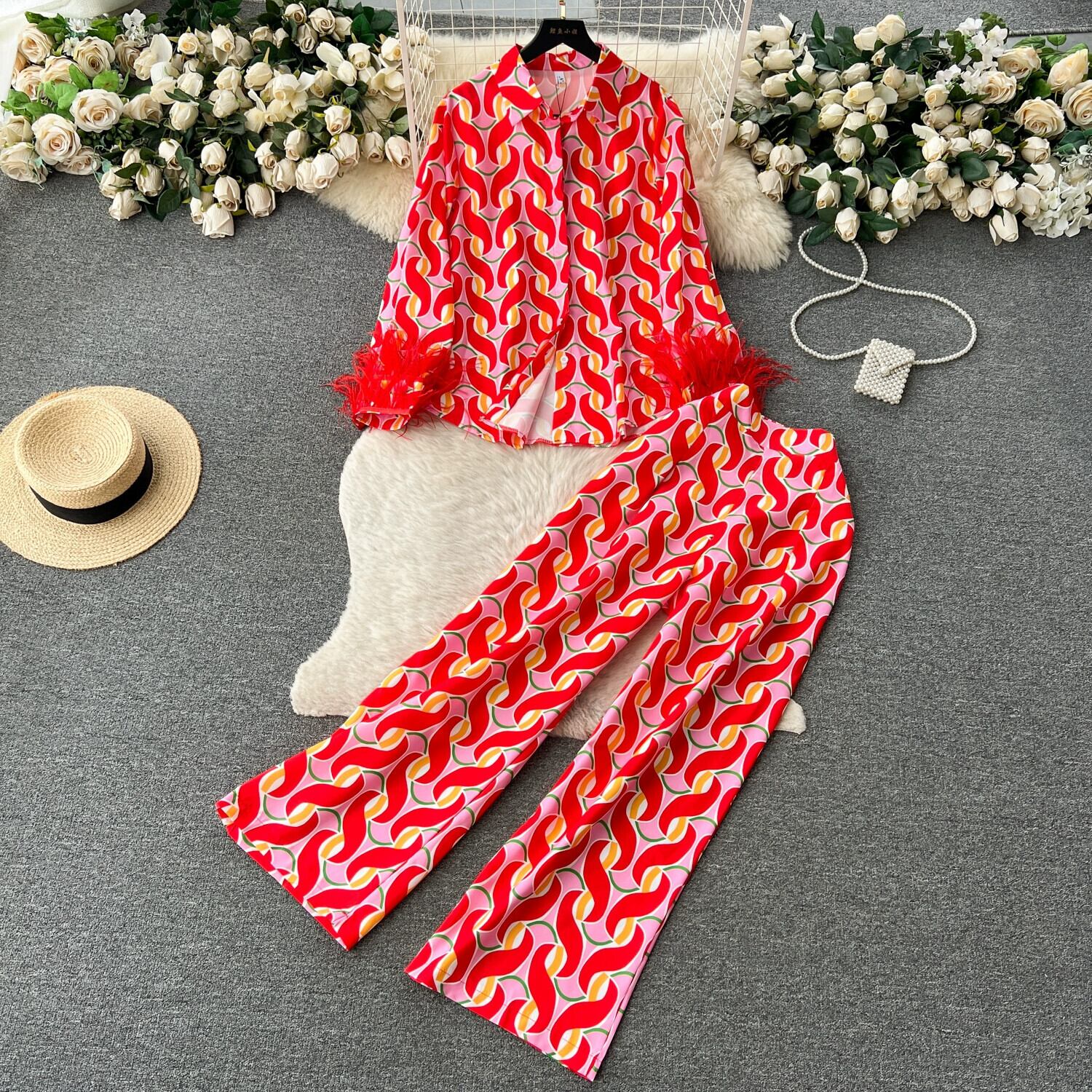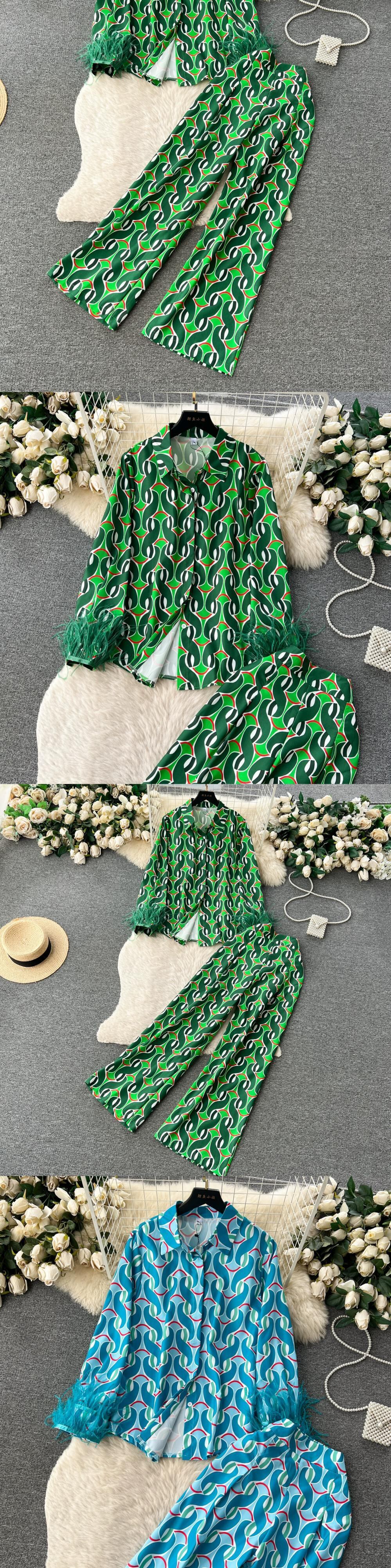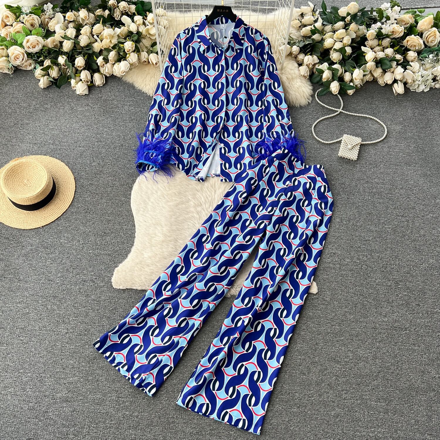 ヨーロッパとアメリカのスタイルのファッションプリントスーツの女性、フランスのルーズな長袖ファーパッチワークシャツ、カジュアルなハイウエストワイドレッグパンツ ロング ヨーロピアン lyxaj45841770778