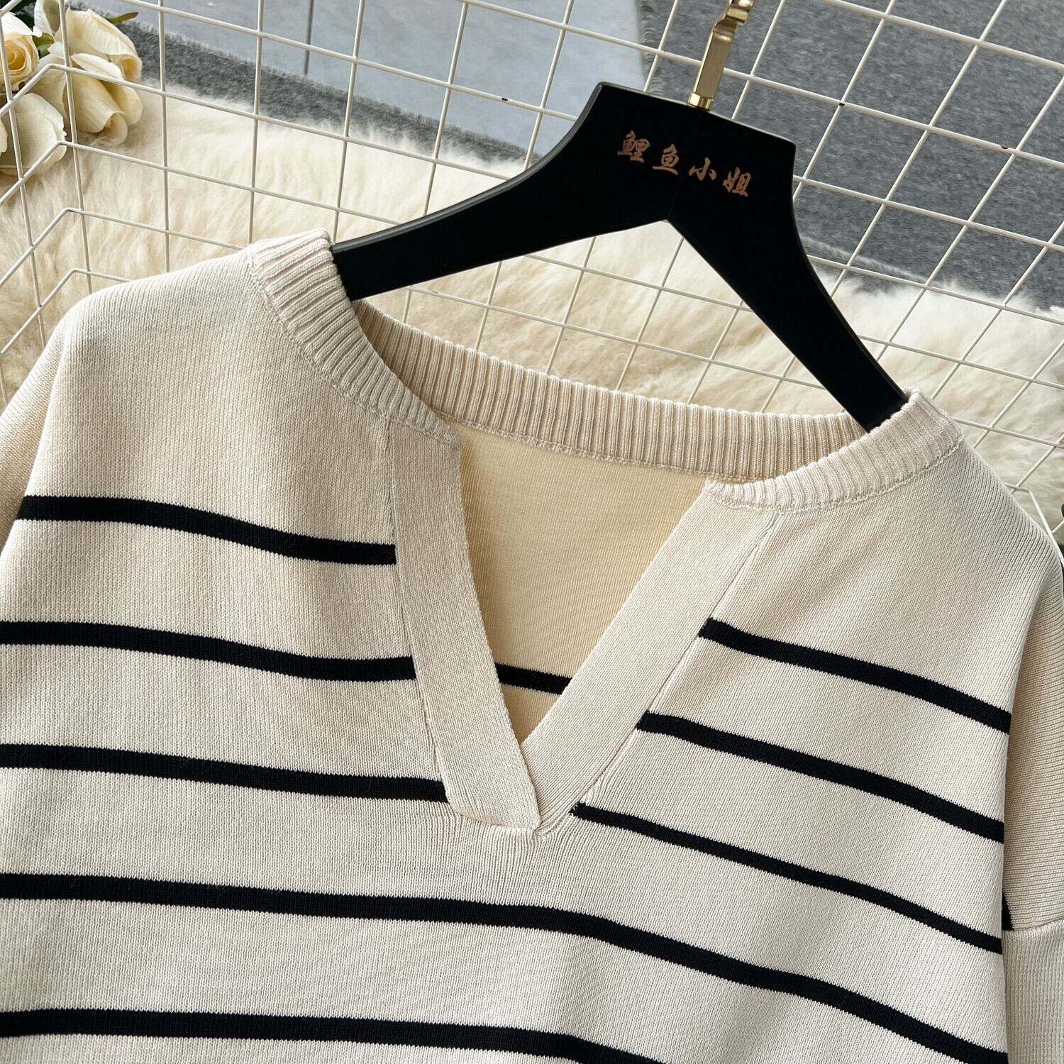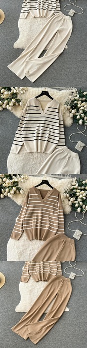 秋と冬のスタイルカジュアルツーピーススーツ女性、ルーズVネックストライプセーター+伸縮性ウエストドレープパンツ エラスティック オータム 秋物 ウィンター 冬物 lyxaj22696370056