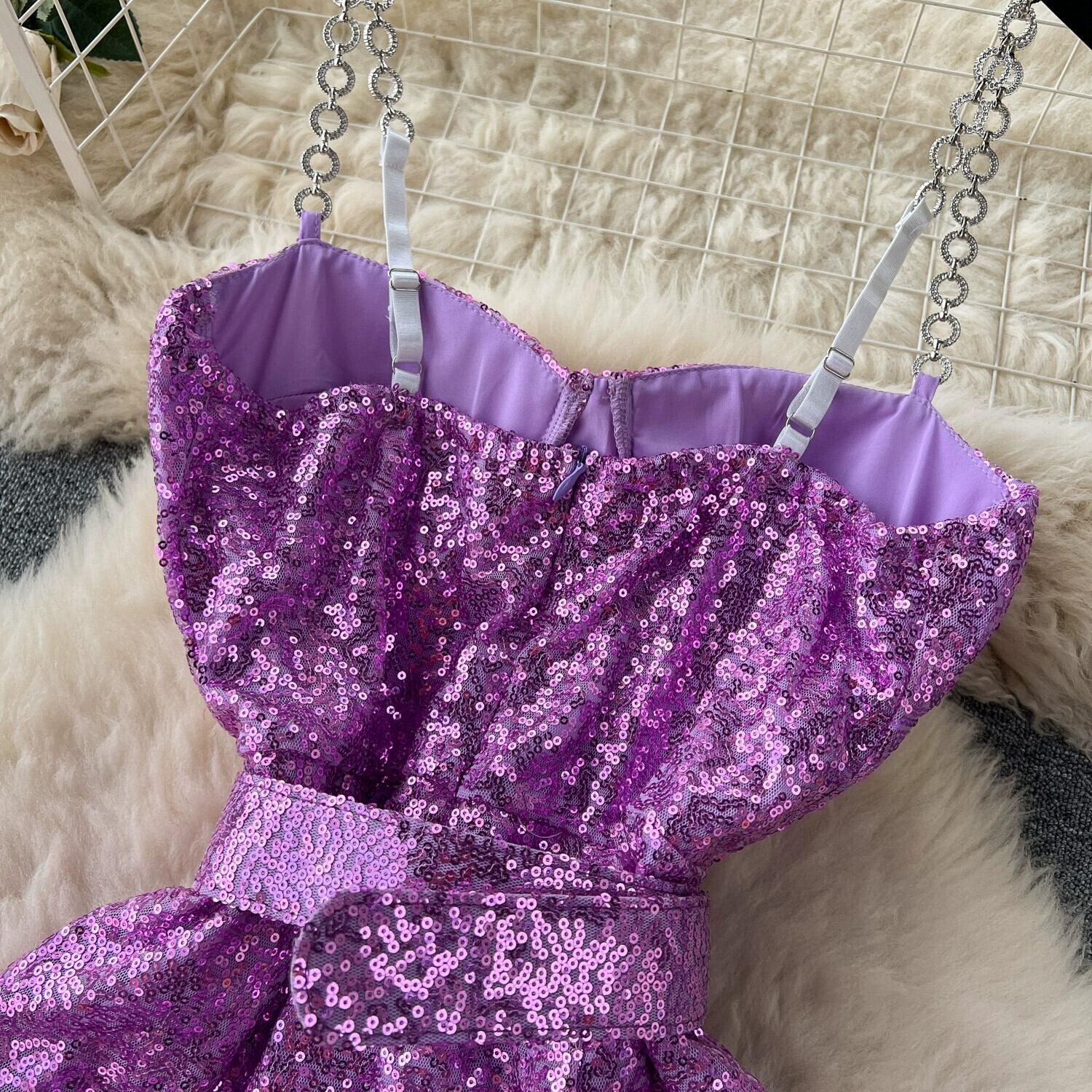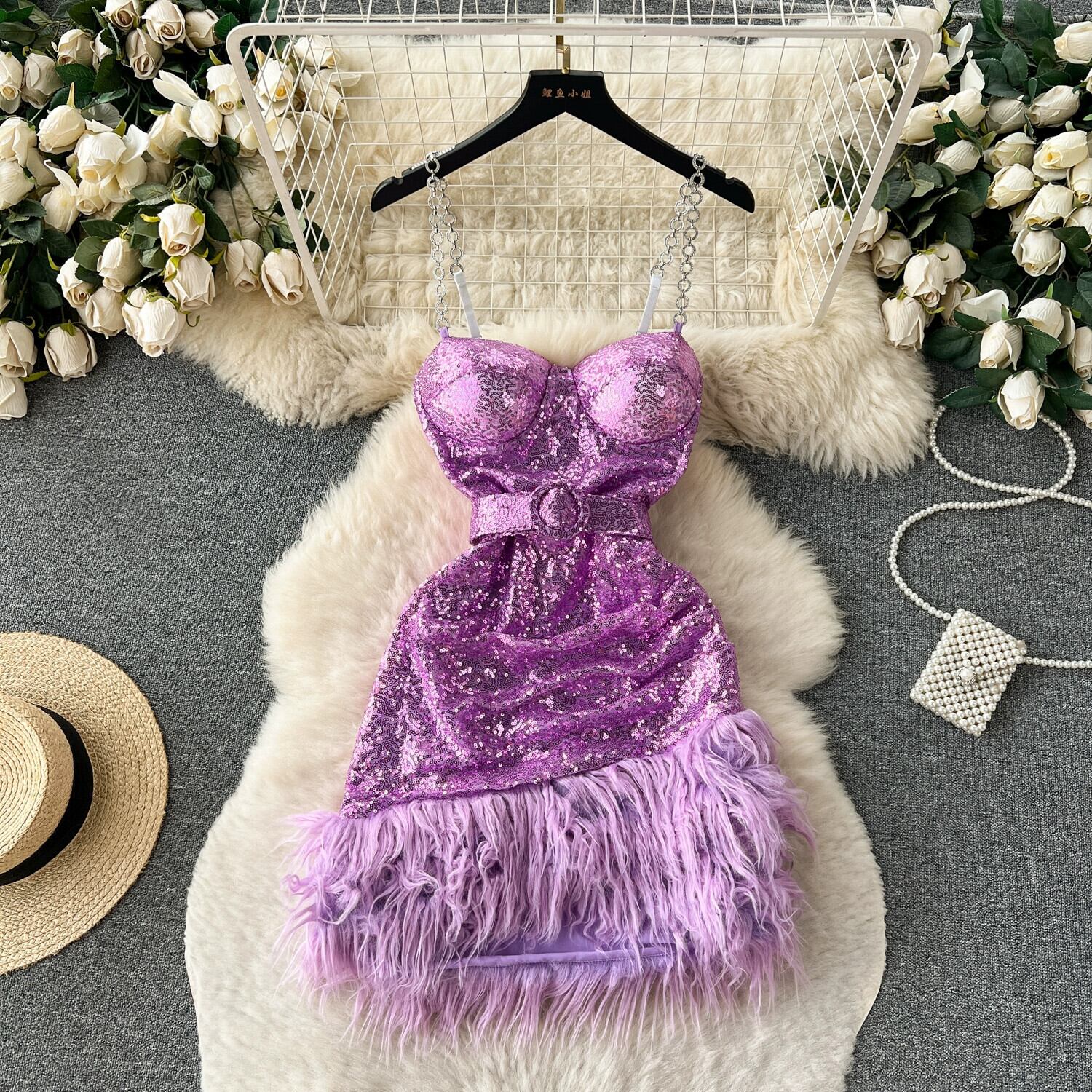 セクシーなセレブスタイルのチェーンサスペンダーチューブトップスパンコールドレススリムフィット毛皮のようなスプライシングスカート lyxaj33173886852